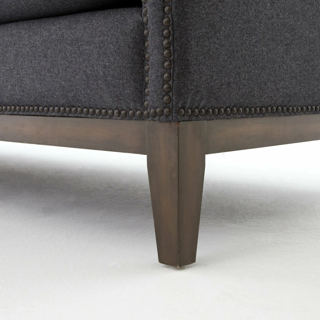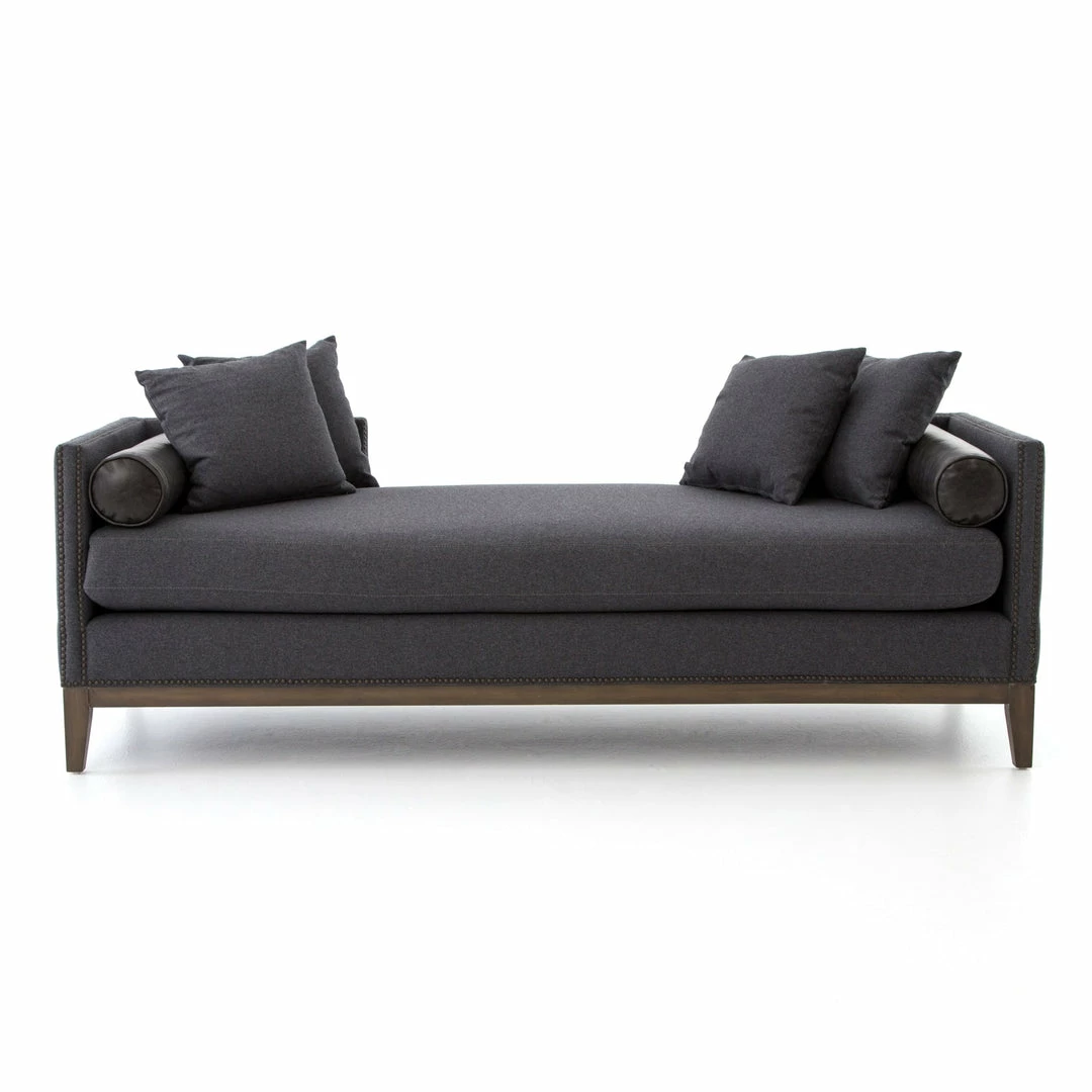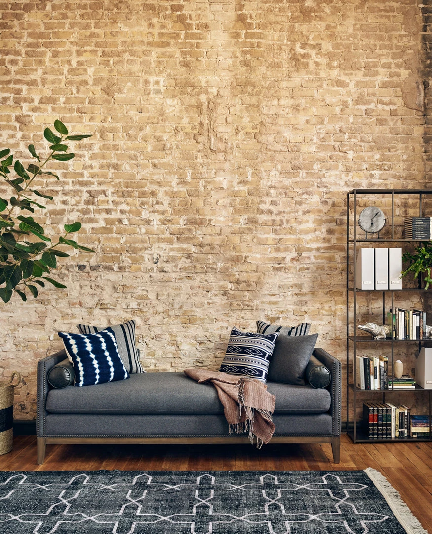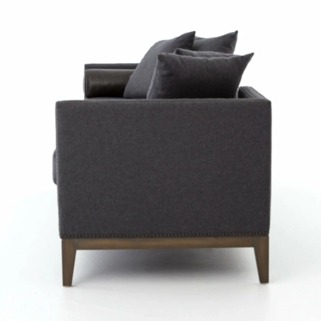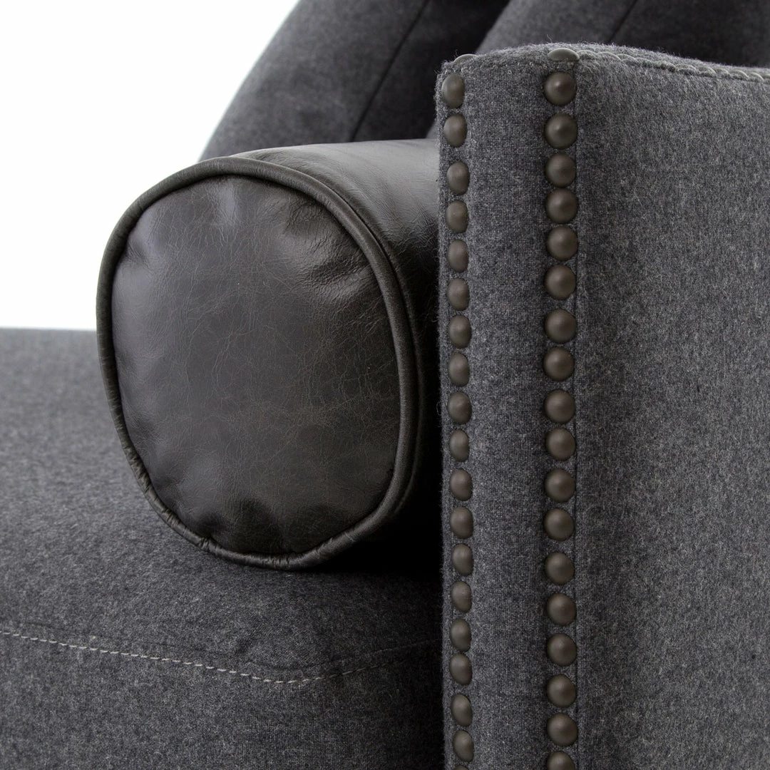 Mixed materials and an open chaise design make for dynamic, distinctive seating. Low, parawood legs with neutral stone covering, aged brass nailheads and plenty of pillows for comfort.