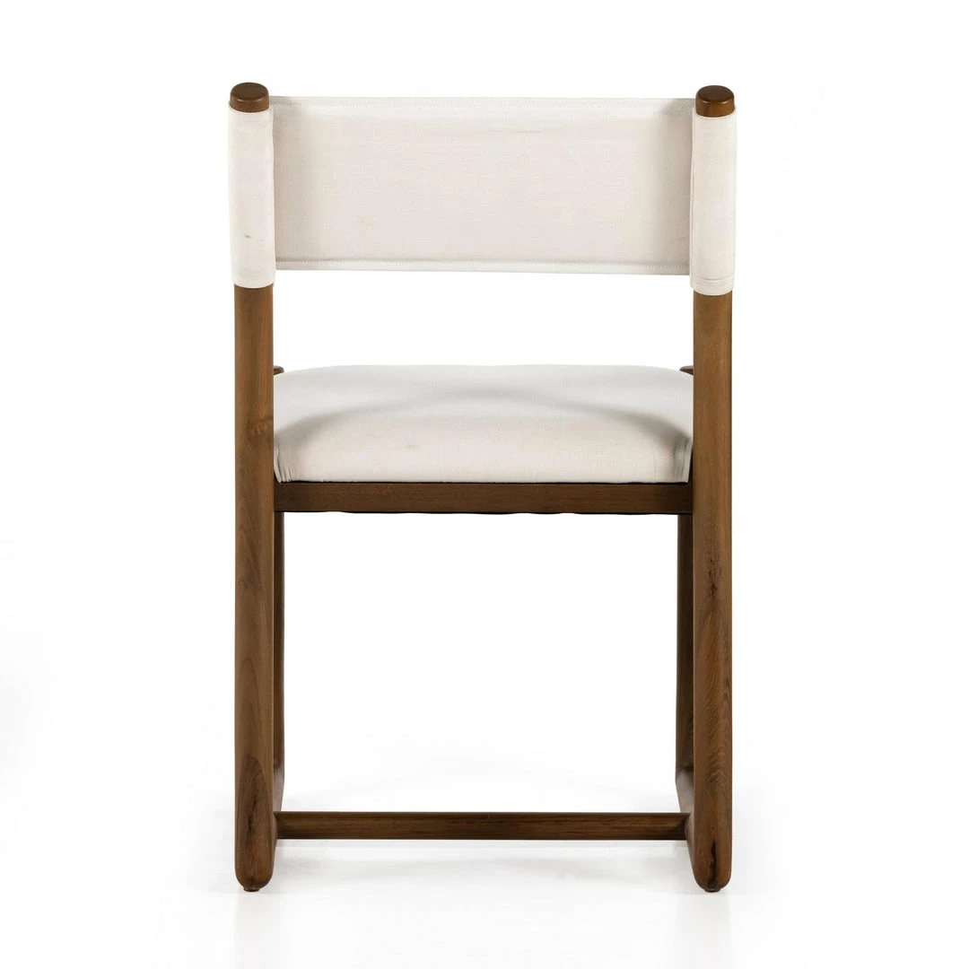 The classic slingback chair gets a modern upgrade for the outdoors. A round dowel frame made of solid FSC-certified teak features front legs that extend through the seat. Slingback and cushioned seat on dining chair are covered in 100% polyester in a natural ivory shade. Cover or store indoors during inclement weather and when not in use.