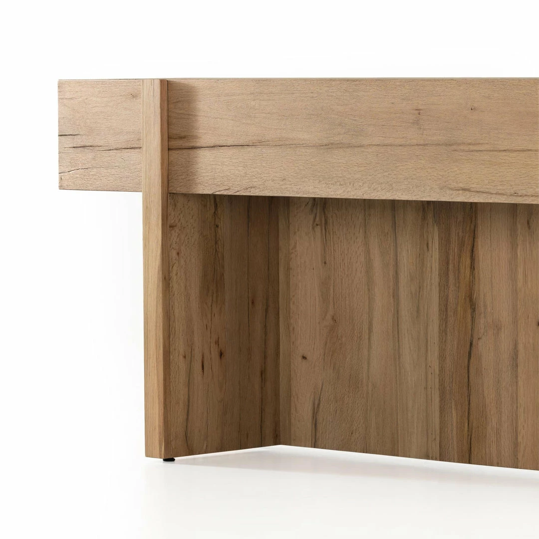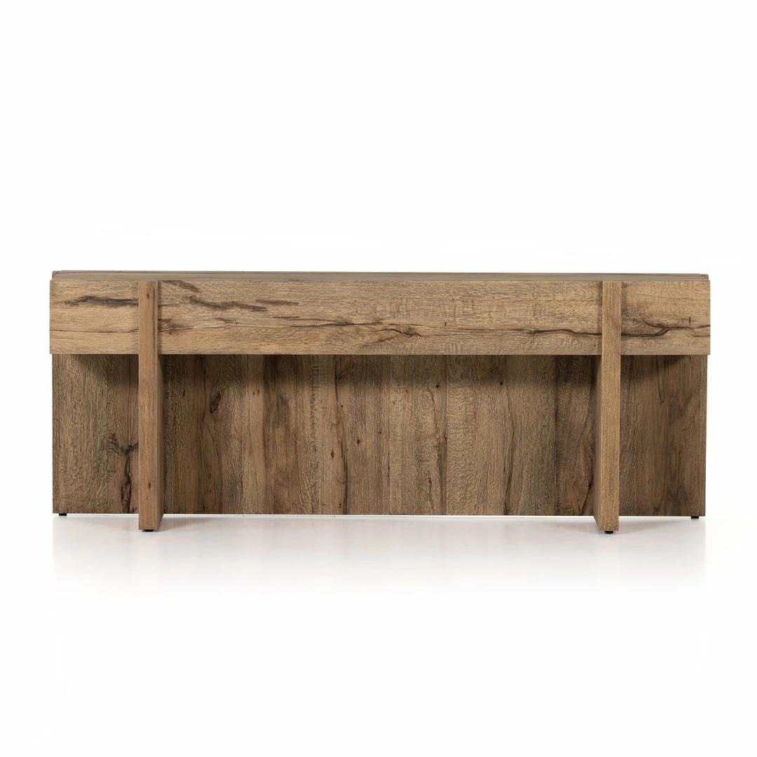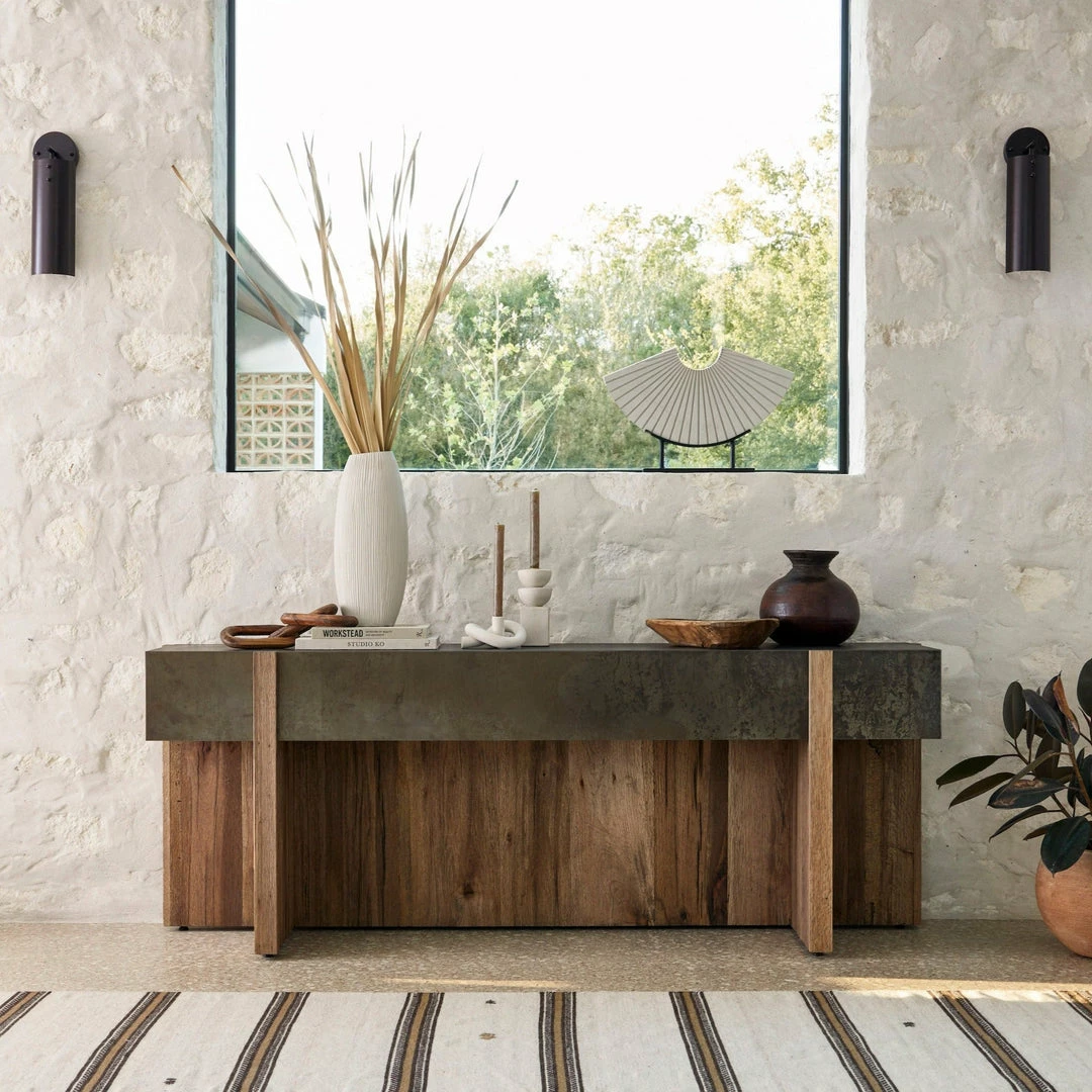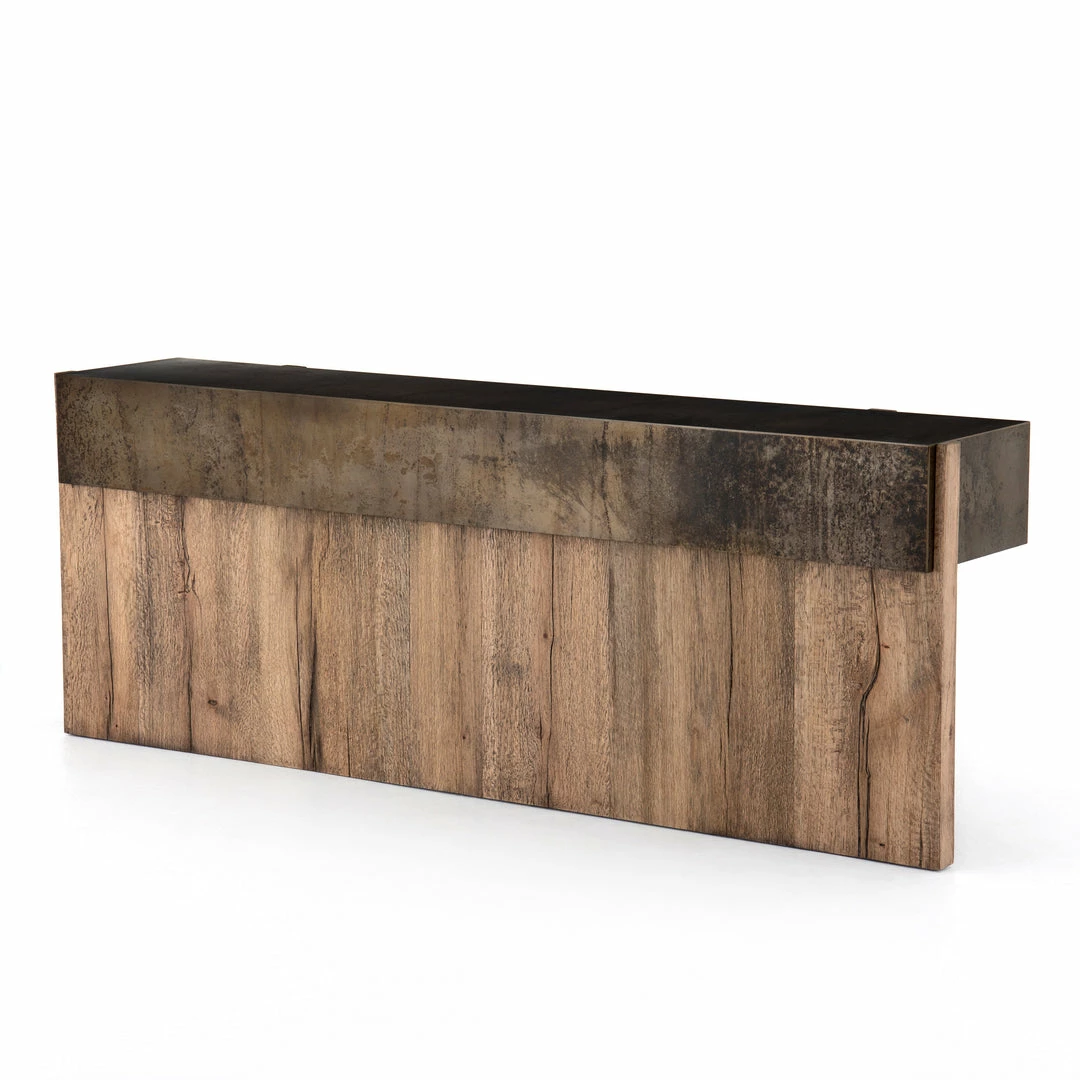 An organic-spirited statement piece. With thick, wide proportions, a rectangular console table of distressed iron tops an intersecting base of rustic, character-rich oak with beautiful highs and lows.