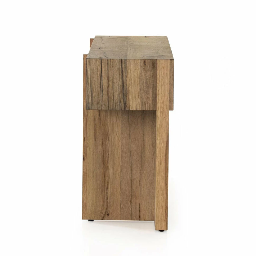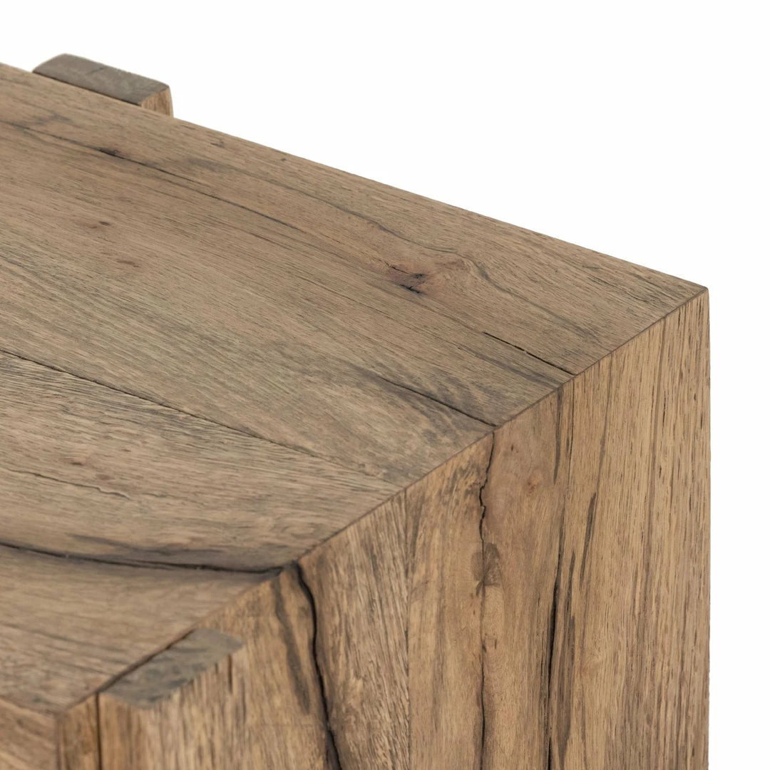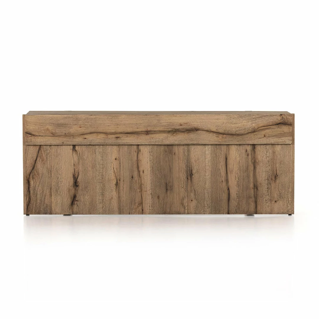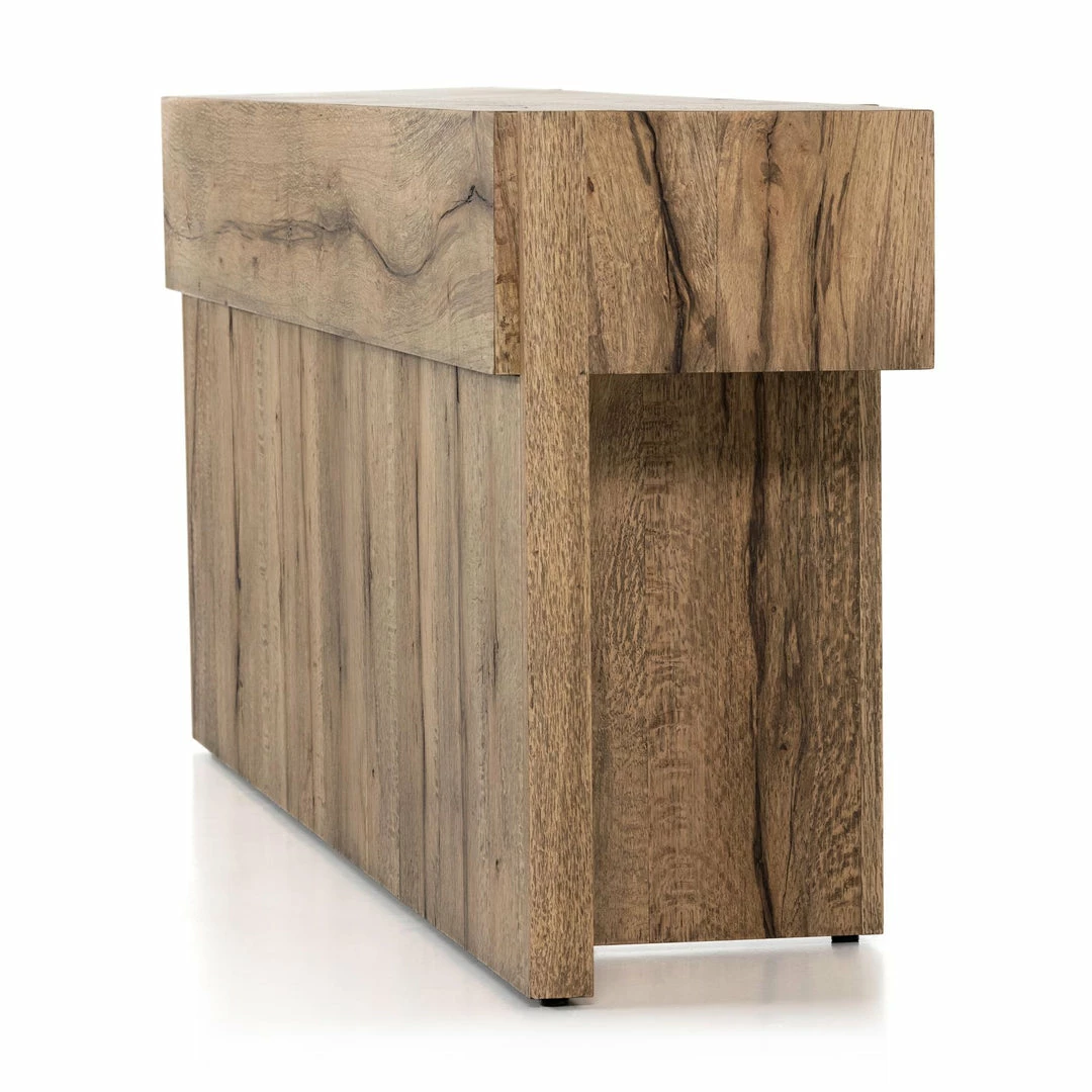 An organic-spirited statement piece. With thick, wide proportions, a rectangular console table of distressed iron tops an intersecting base of rustic, character-rich oak with beautiful highs and lows.