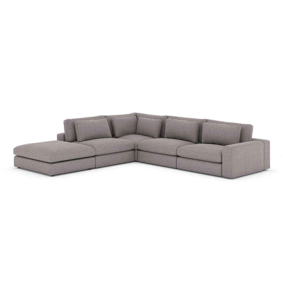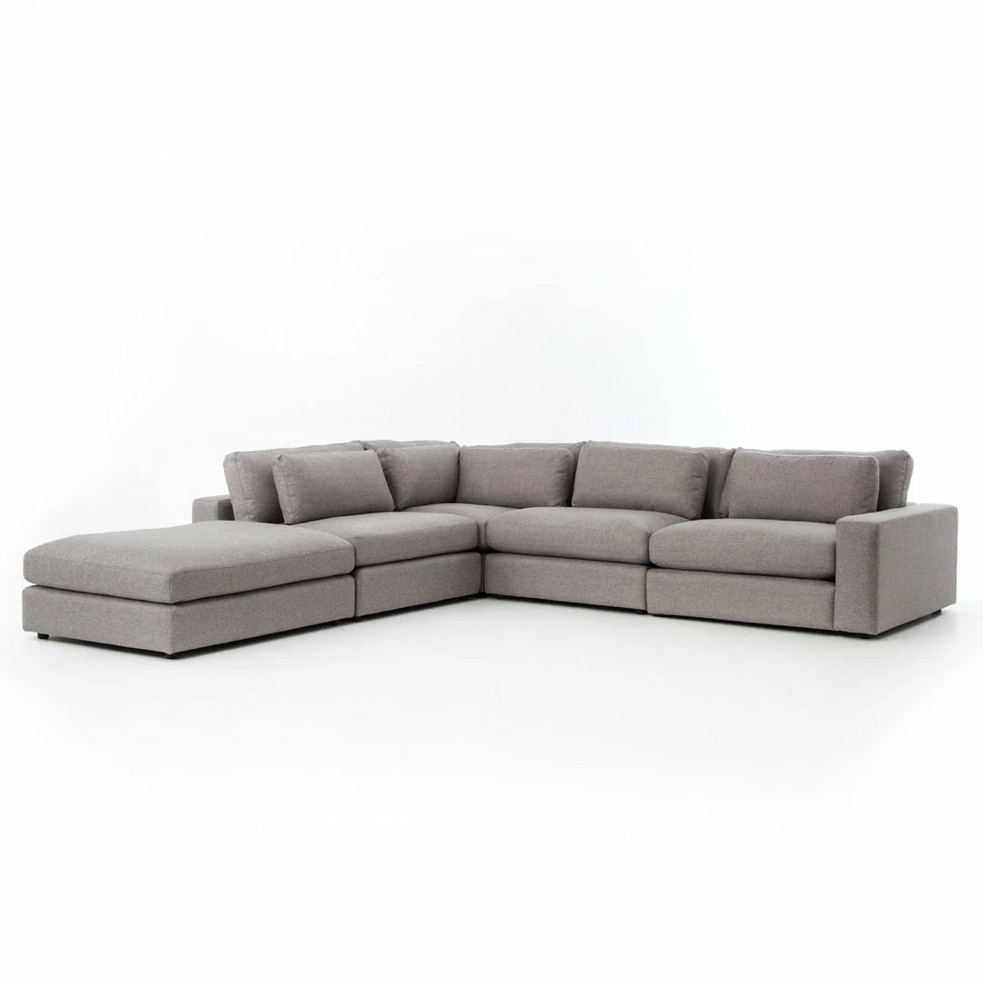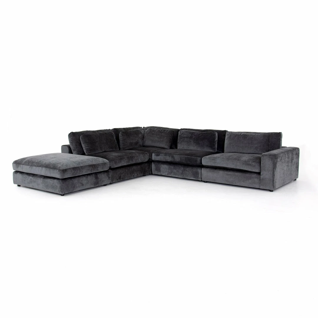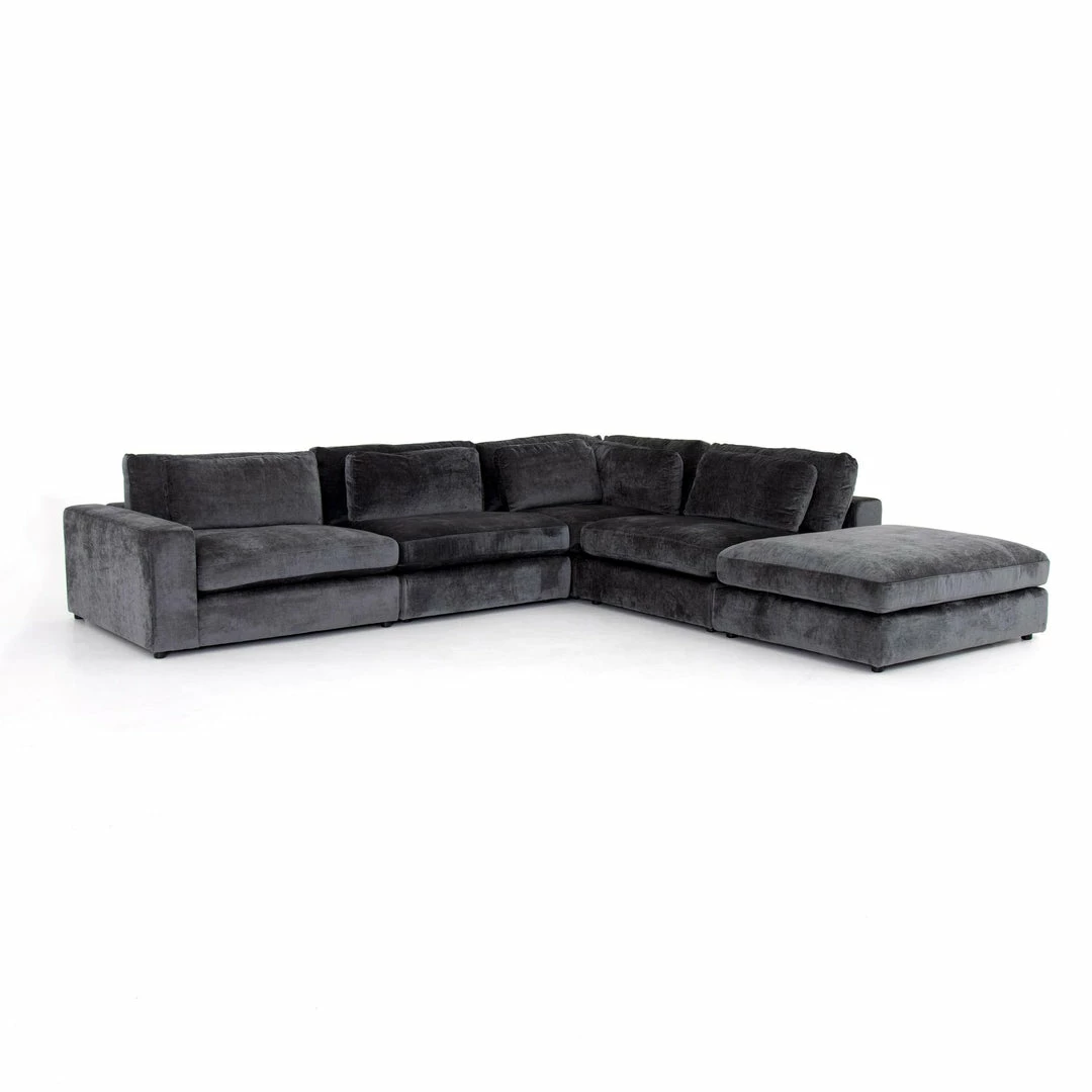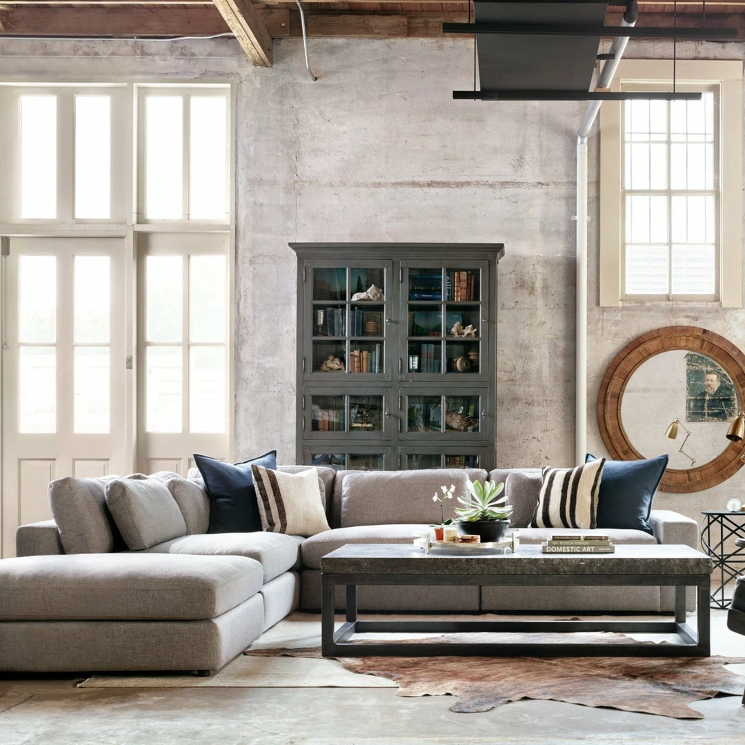 Deep, low seating says relax. An inviting sectional and ottoman are covered in an upcycled denim fabric in a beautifully versatile light grey. Modular components allow the perfect combination for any space.