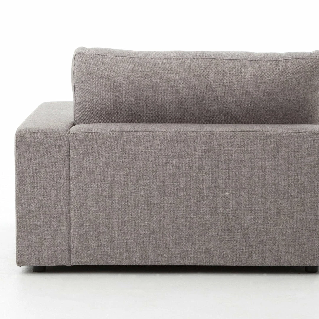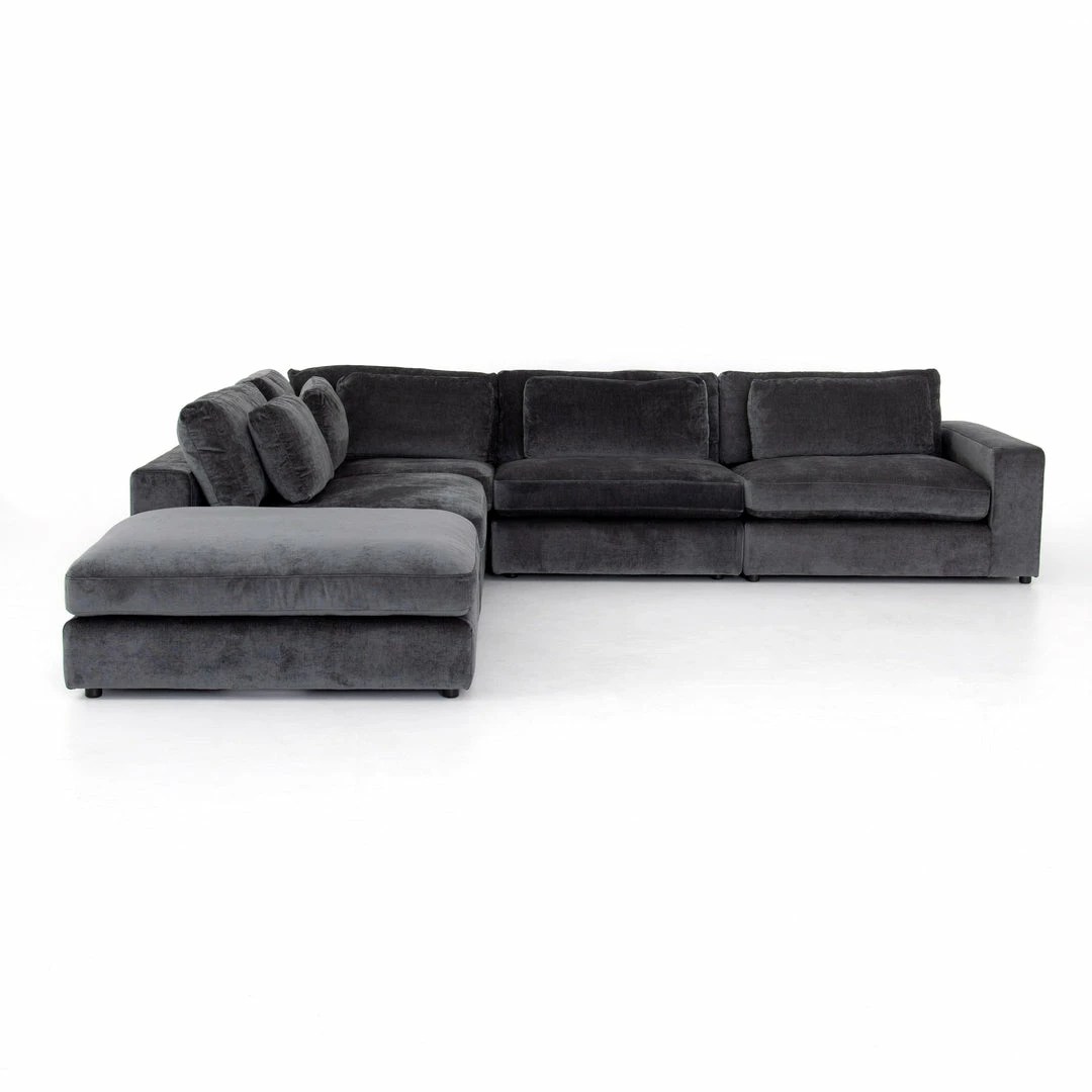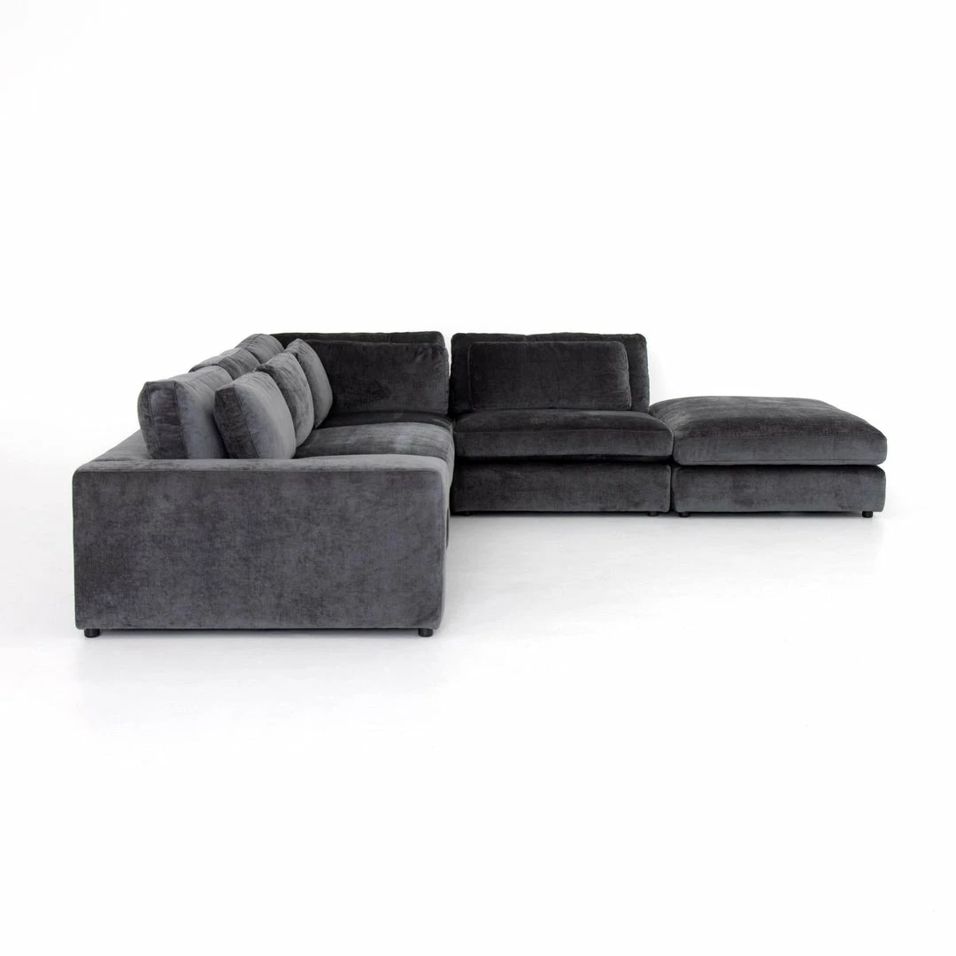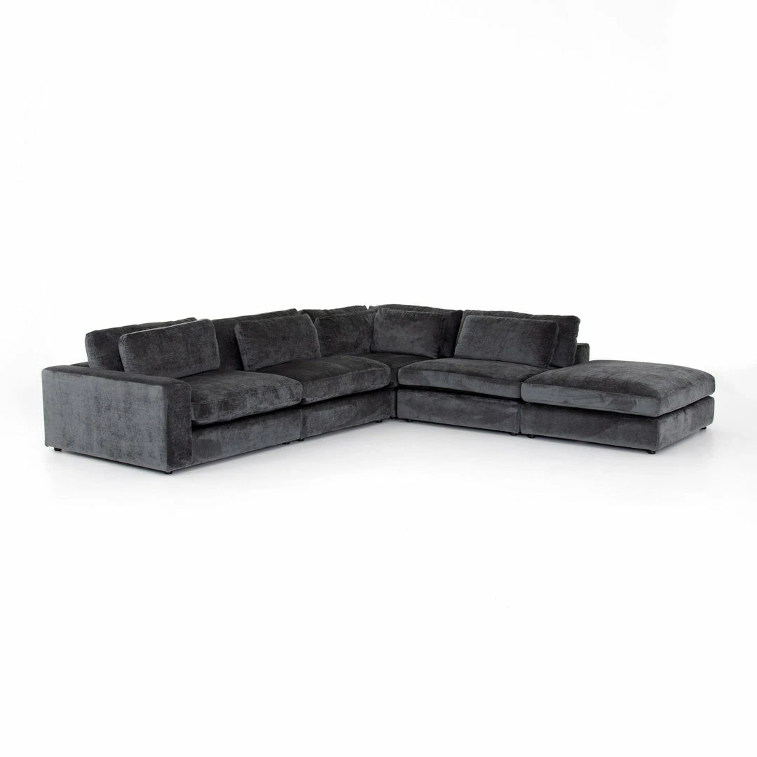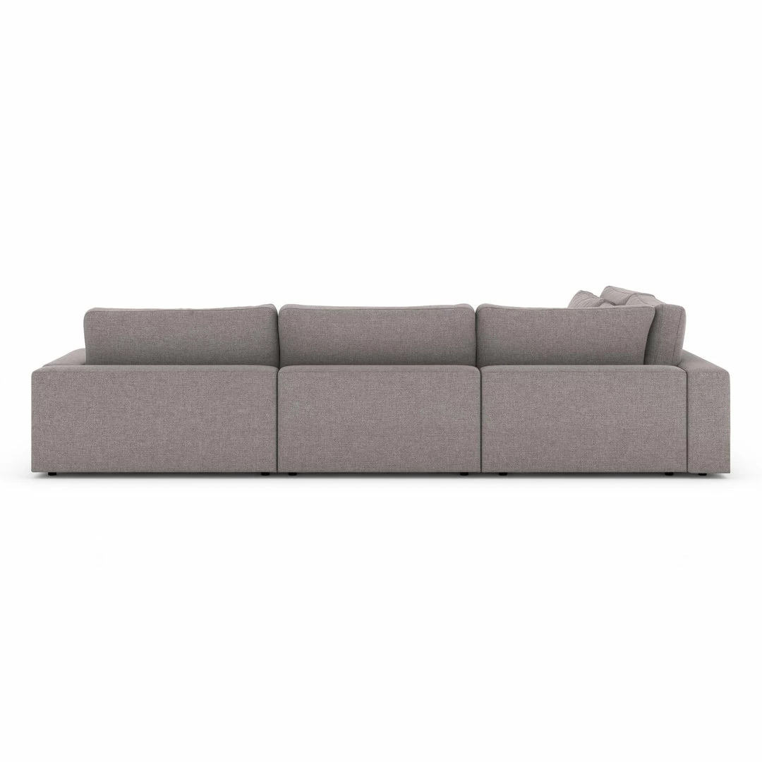 Deep, low seating says relax. An inviting sectional and ottoman are covered in an upcycled denim fabric in a beautifully versatile light grey. Modular components allow the perfect combination for any space.