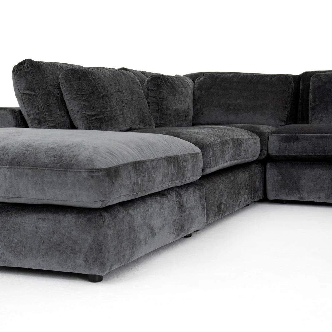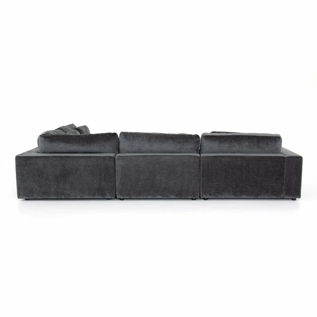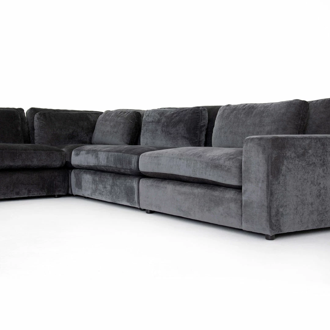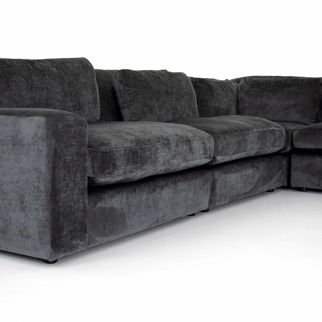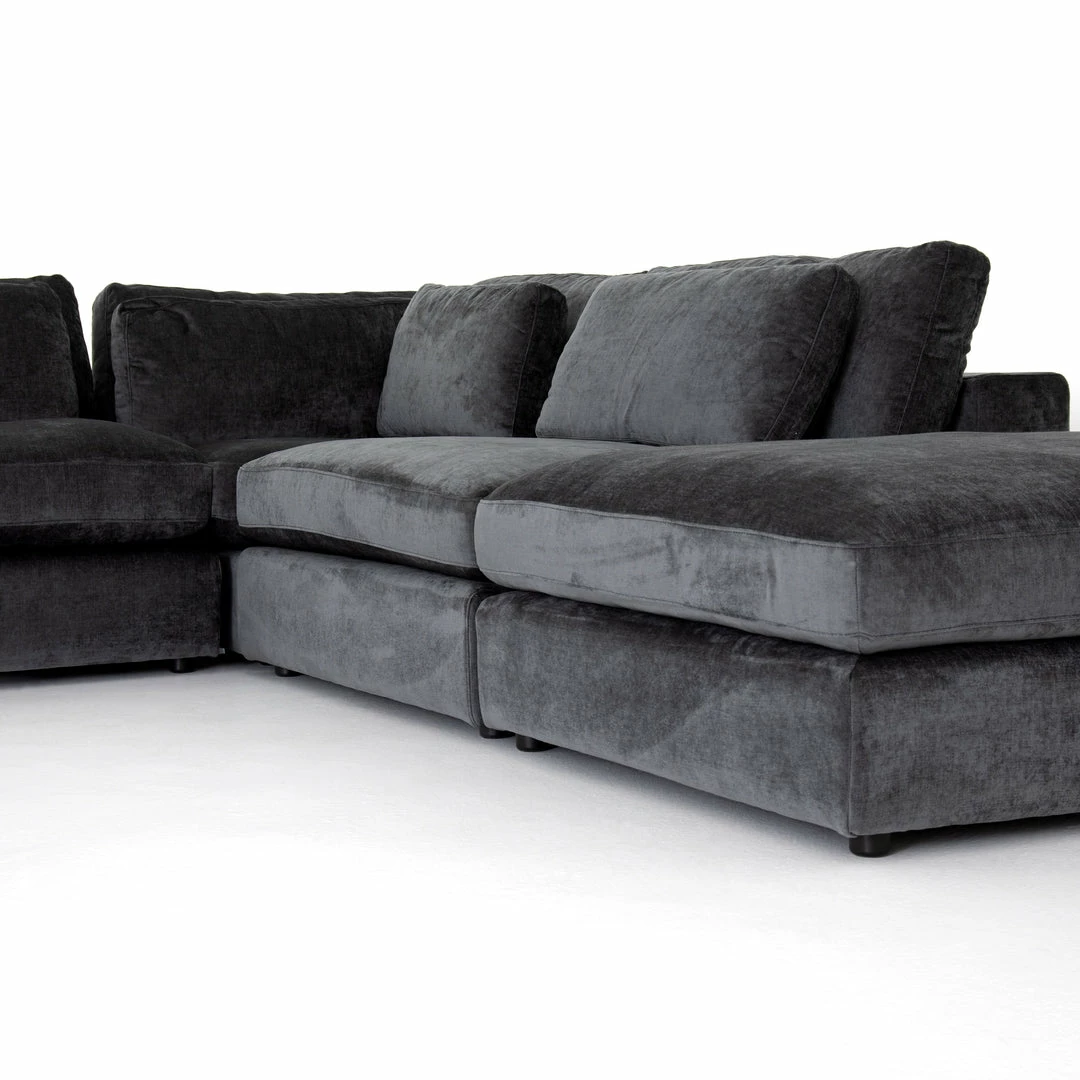 Deep, low seating says relax. An inviting sectional and ottoman are covered in an upcycled denim fabric in a beautifully versatile light grey. Modular components allow the perfect combination for any space.