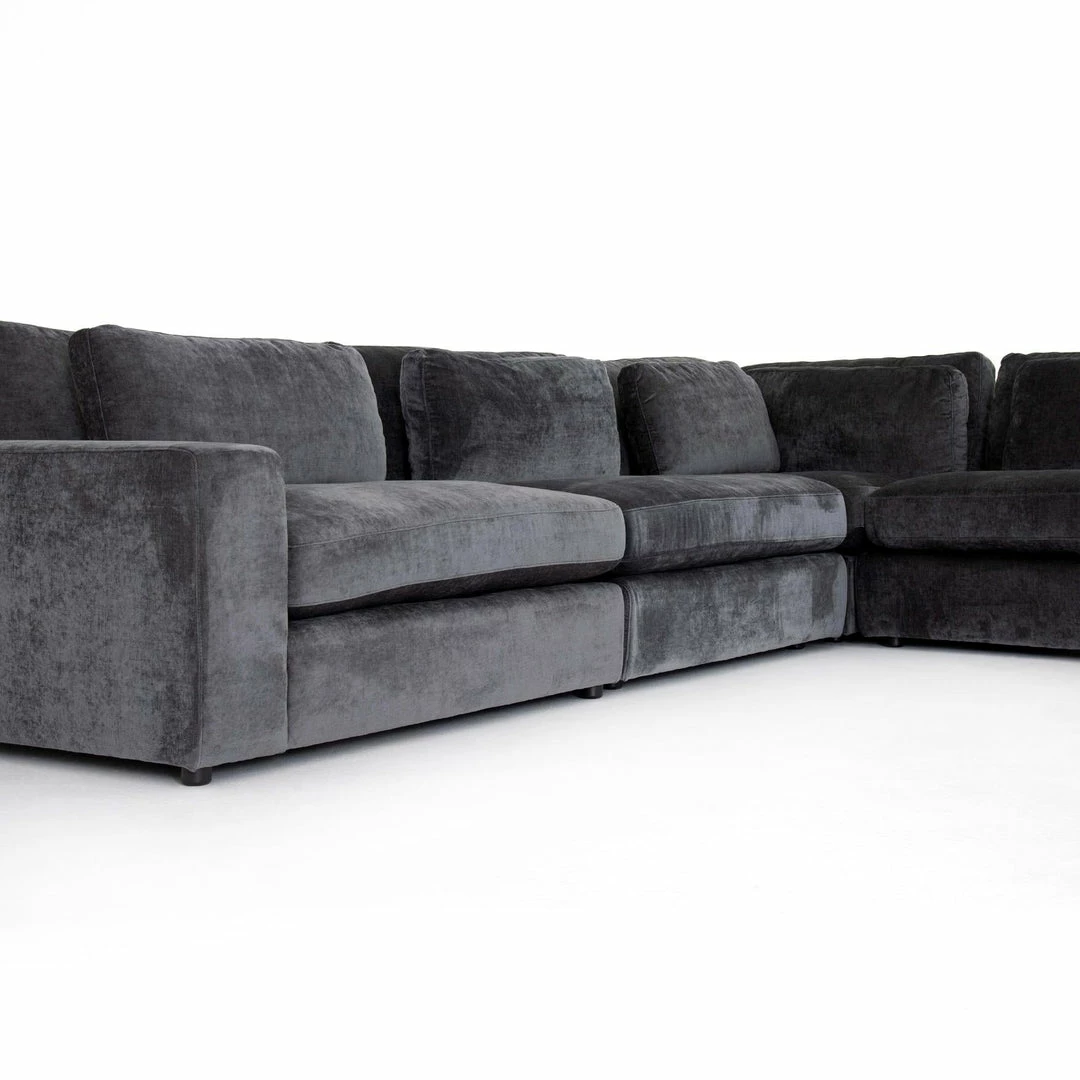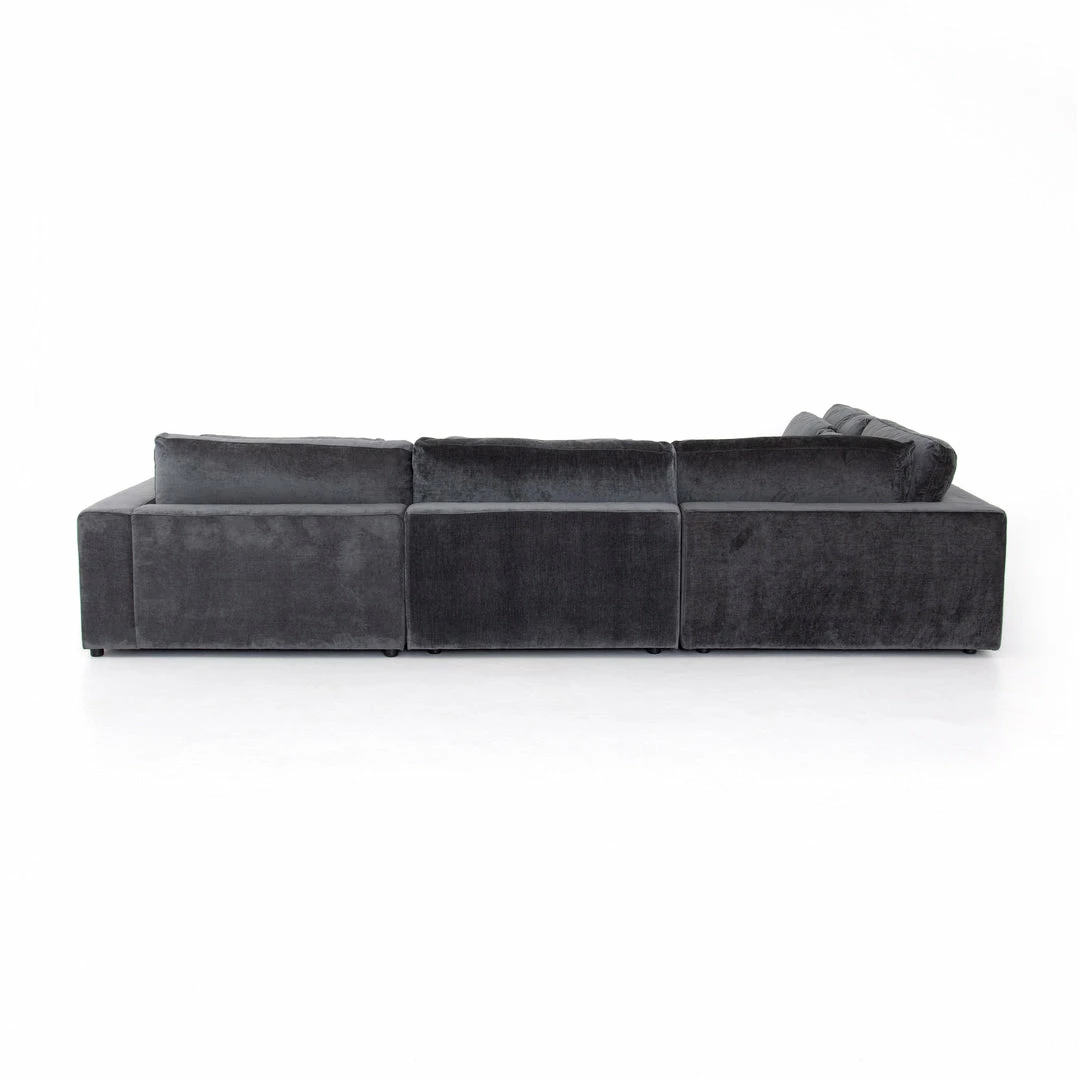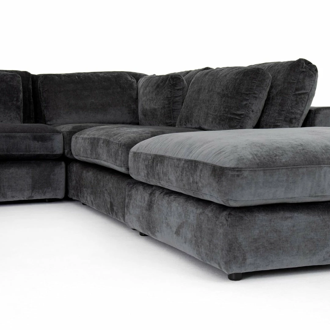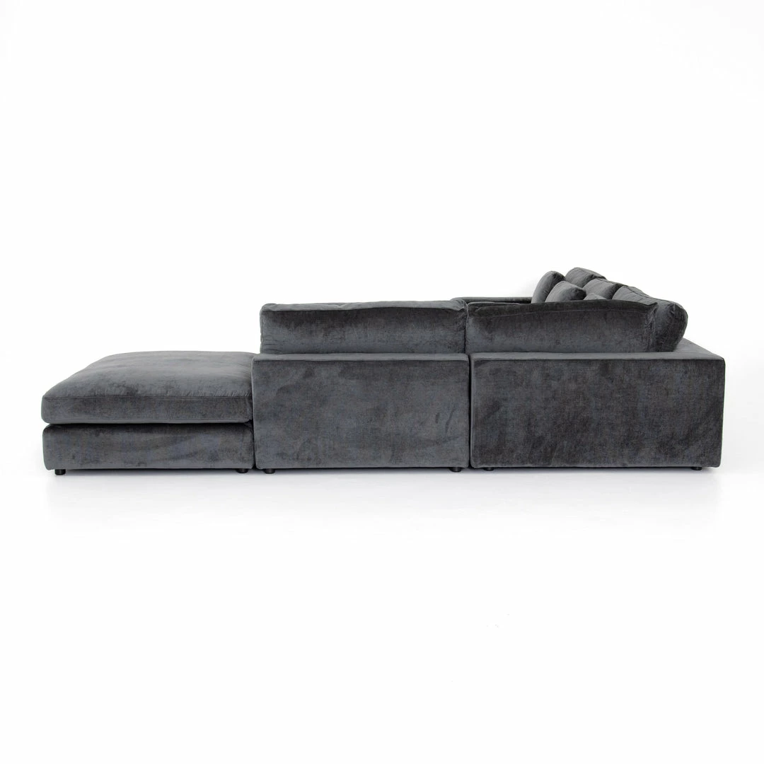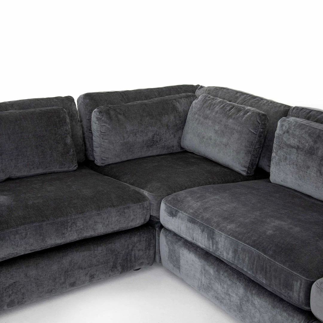 Deep, low seating says relax. An inviting sectional and ottoman are covered in an upcycled denim fabric in a beautifully versatile light grey. Modular components allow the perfect combination for any space.