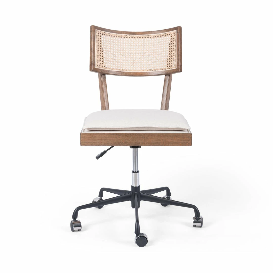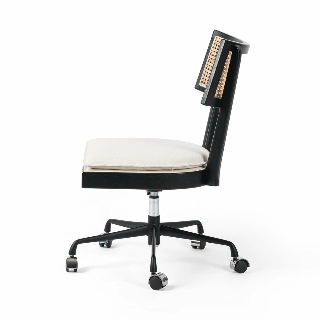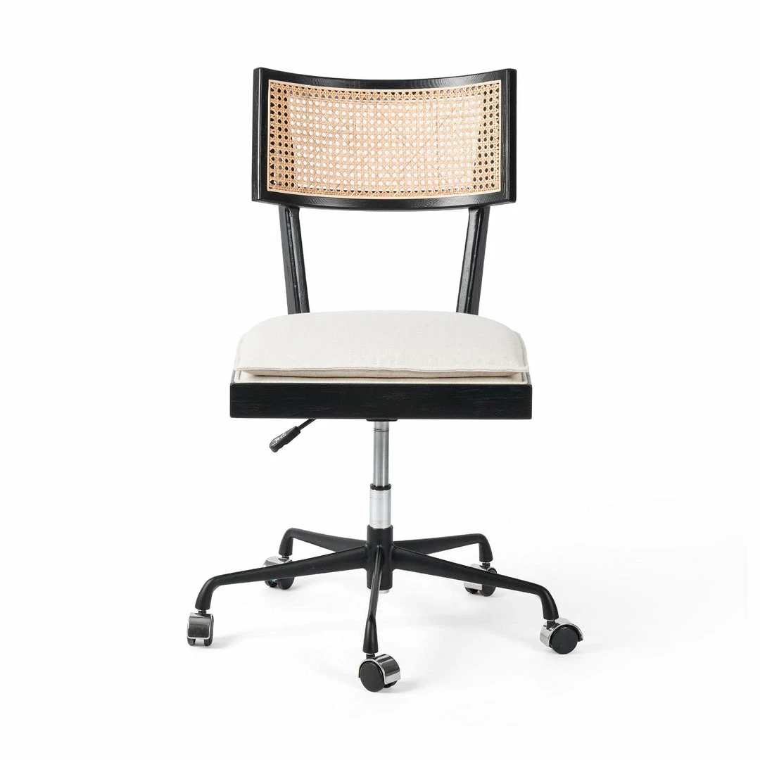 Mixed materials refresh a retro style. Solid nettlewood is finished in a rich ebony to frame a textural inlay of natural cane. High-performance seating, an iron base with casters, plus height adjustability ensure efficiency – and style – in the modern office.
