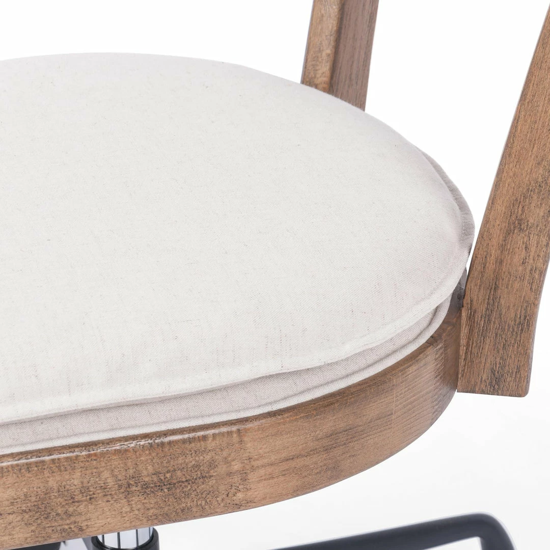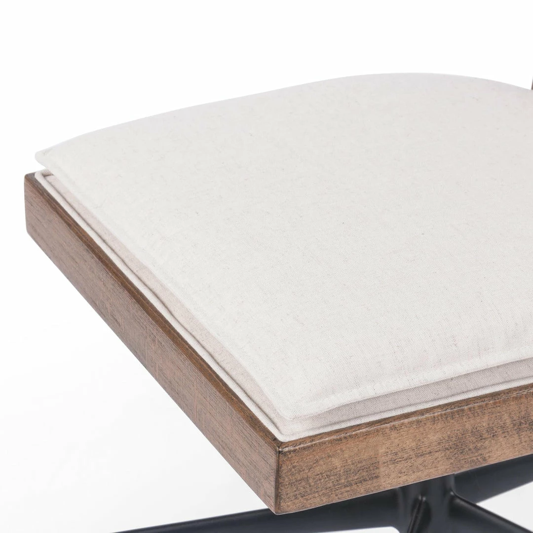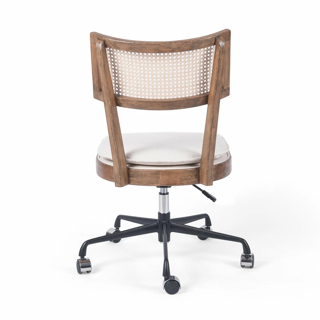 Mixed materials refresh a retro style. Solid nettlewood is finished in a rich ebony to frame a textural inlay of natural cane. High-performance seating, an iron base with casters, plus height adjustability ensure efficiency – and style – in the modern office.