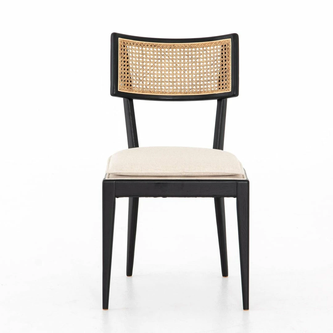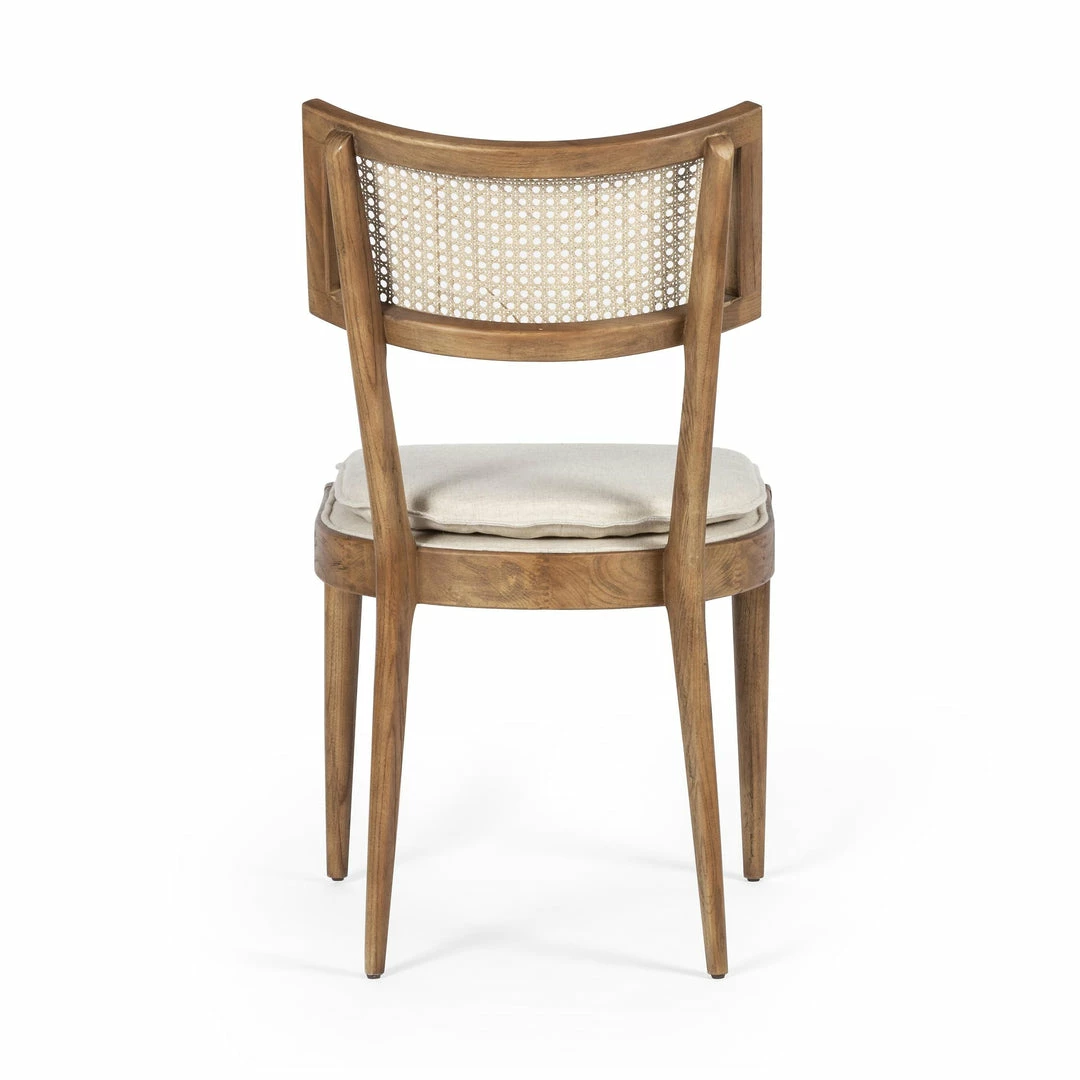 Mixed materials refresh retro dining style. Light-toasted nettlewood frames a textural inlay of natural cane, for perfect contrast. Fastened by Velcro, high-performance linen-blend seating for modern sensibility.