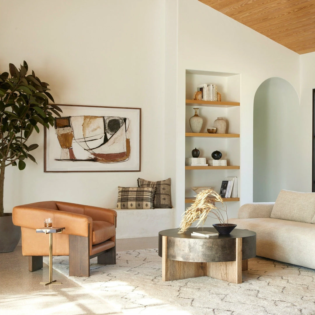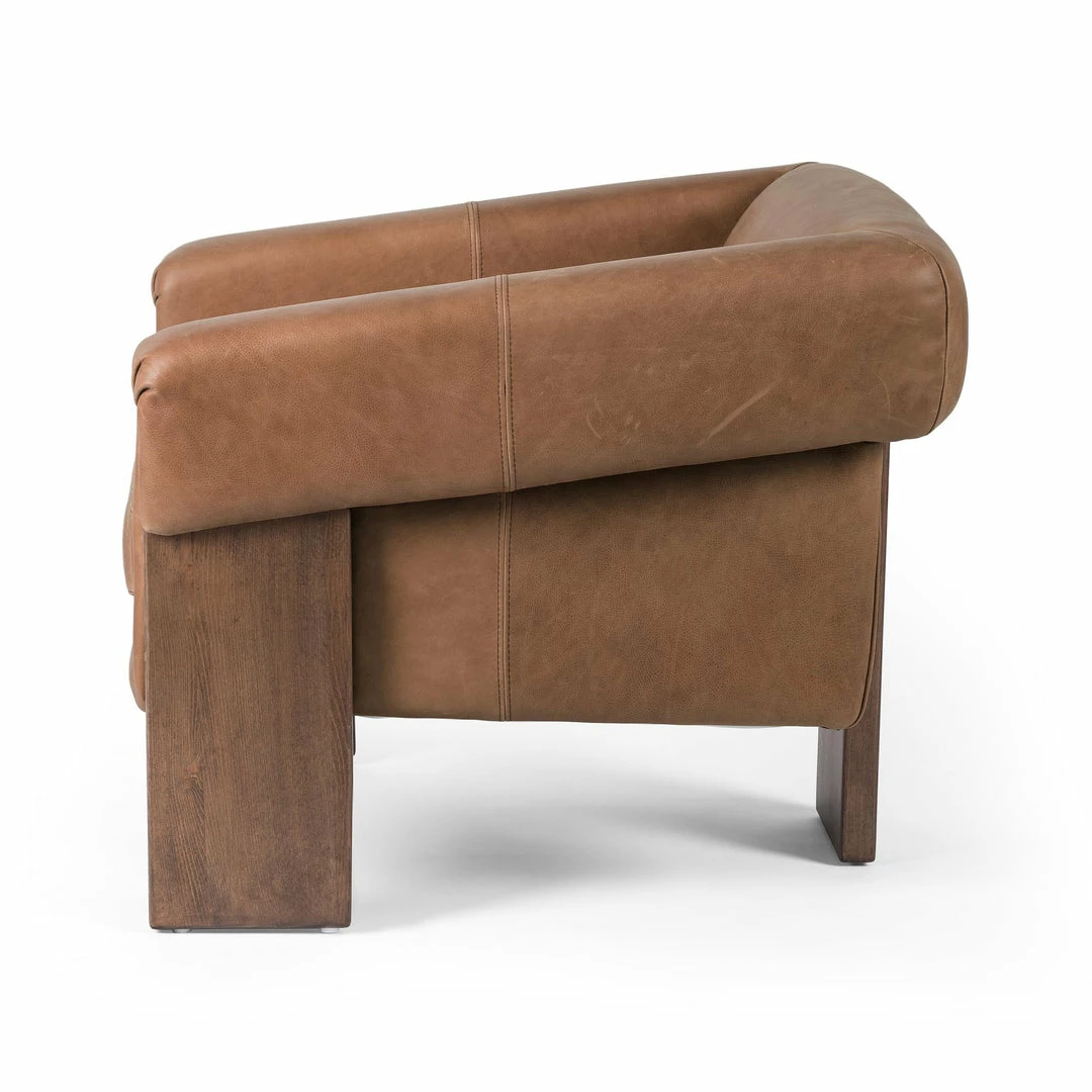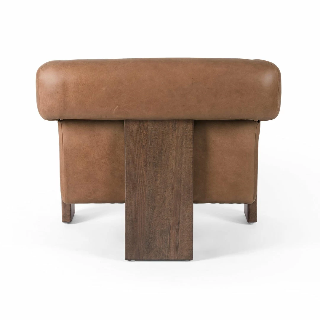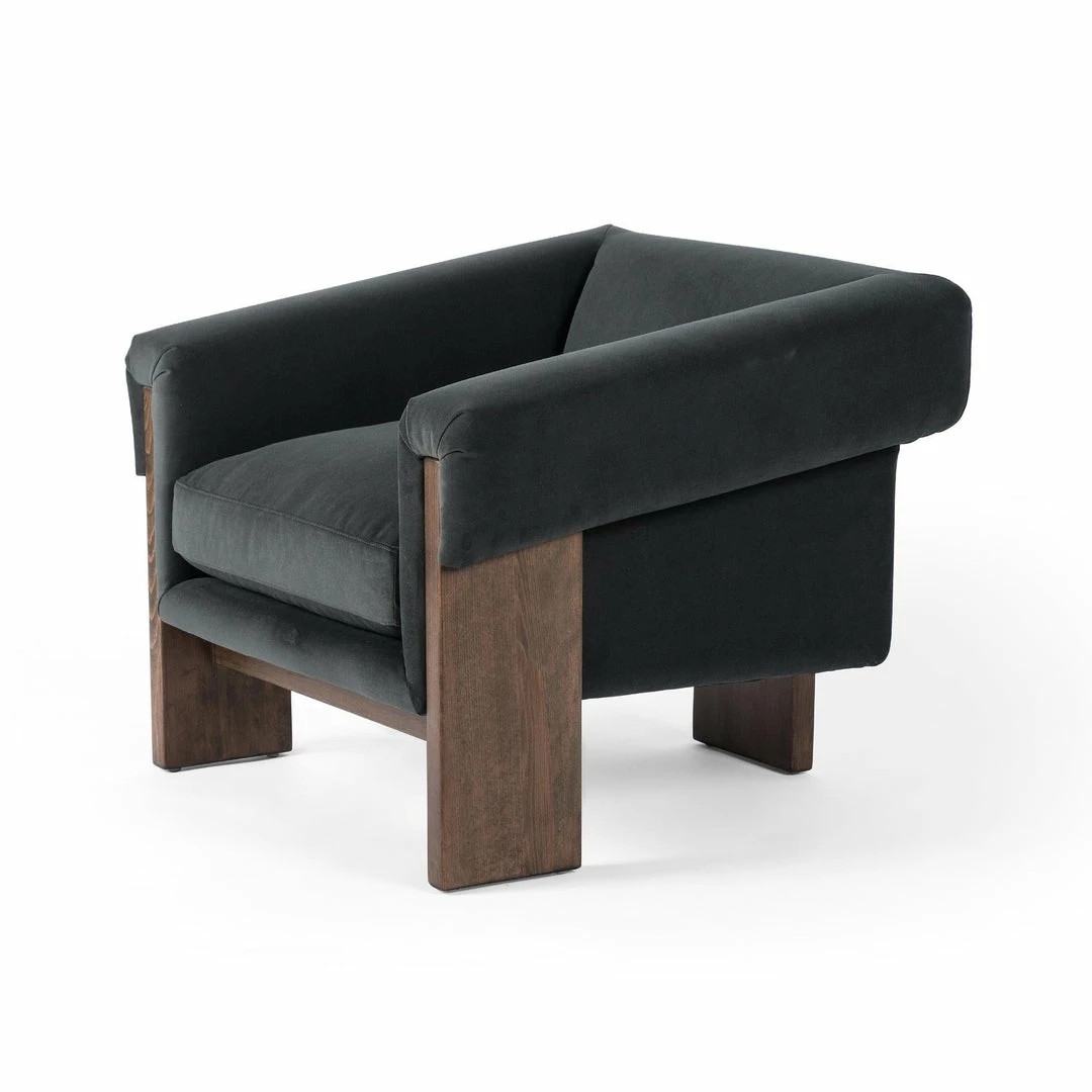 A striking silhouette that commands attention from all angles. Inspired by vintage Brazilian designs, wide plank legs form an architectural tripod and frame for a floating cushioned seat. Tight upholstered back with wraparound arms and a loose, plush seat cushion.