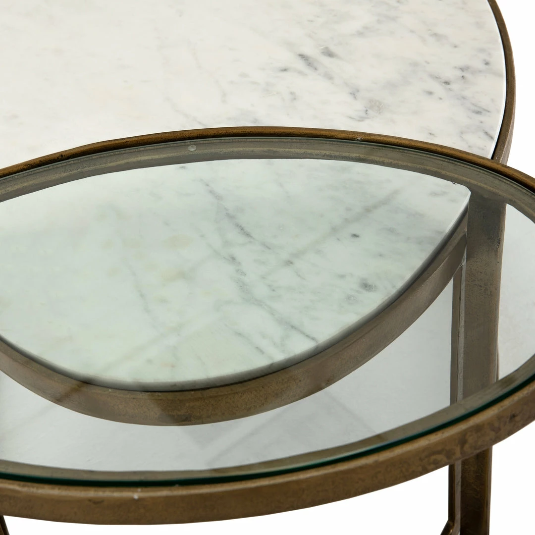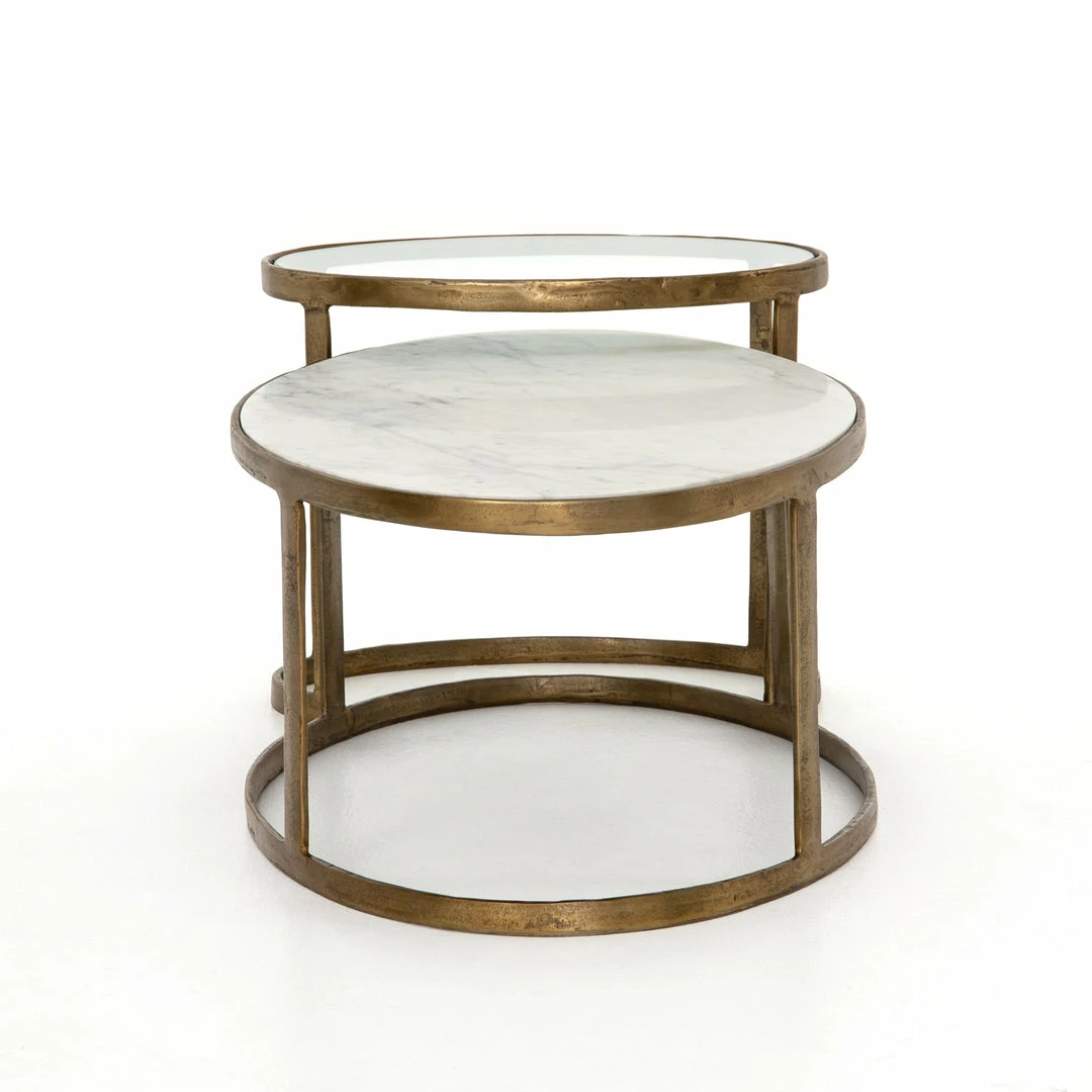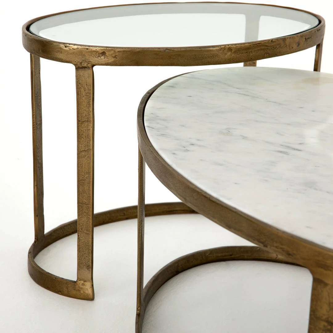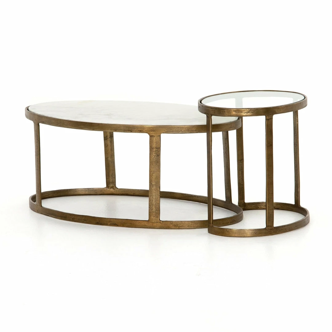 Shapely surfaces, designed to slide together or apart with ease. A raw brass finish lends a lived-in feel to aluminum framing, with one oval-shaped nester topped by polished white marble pairing with a taller, rounded table featuring tempered glass.