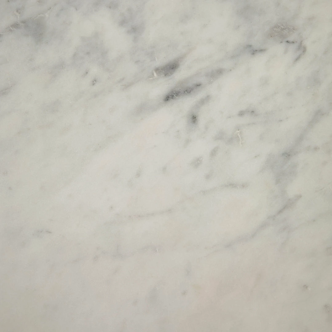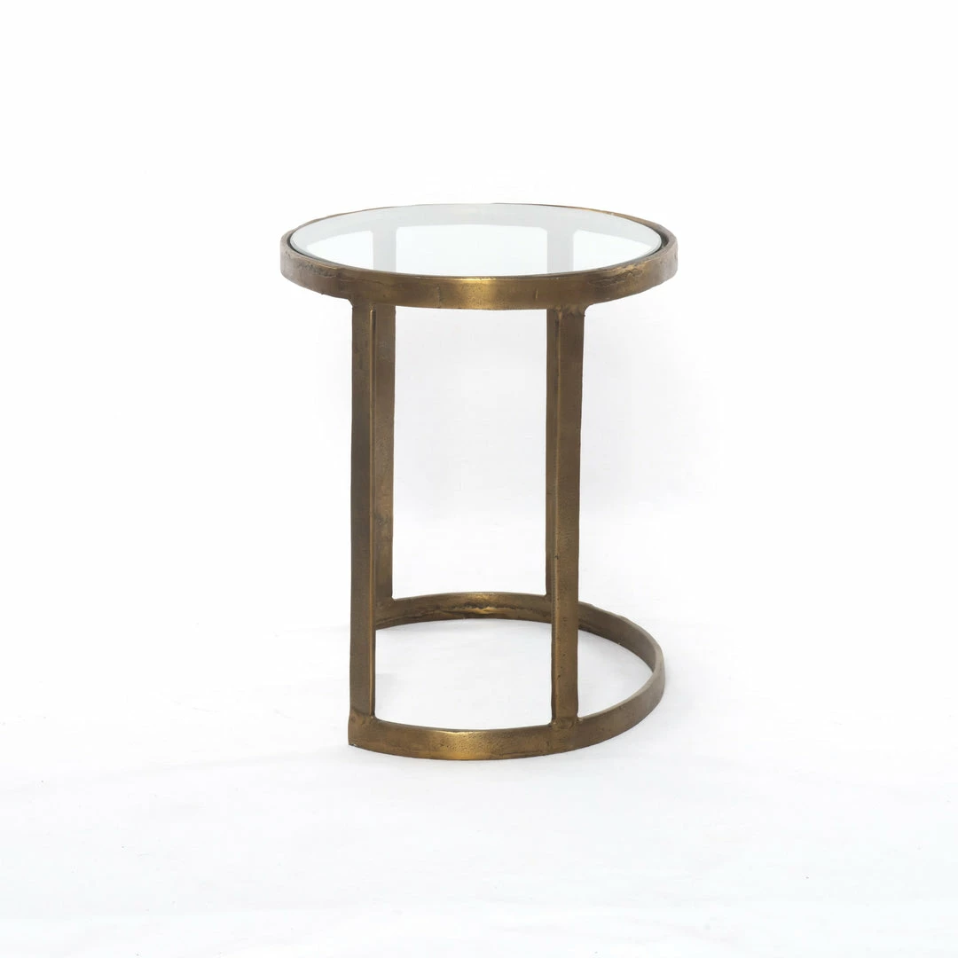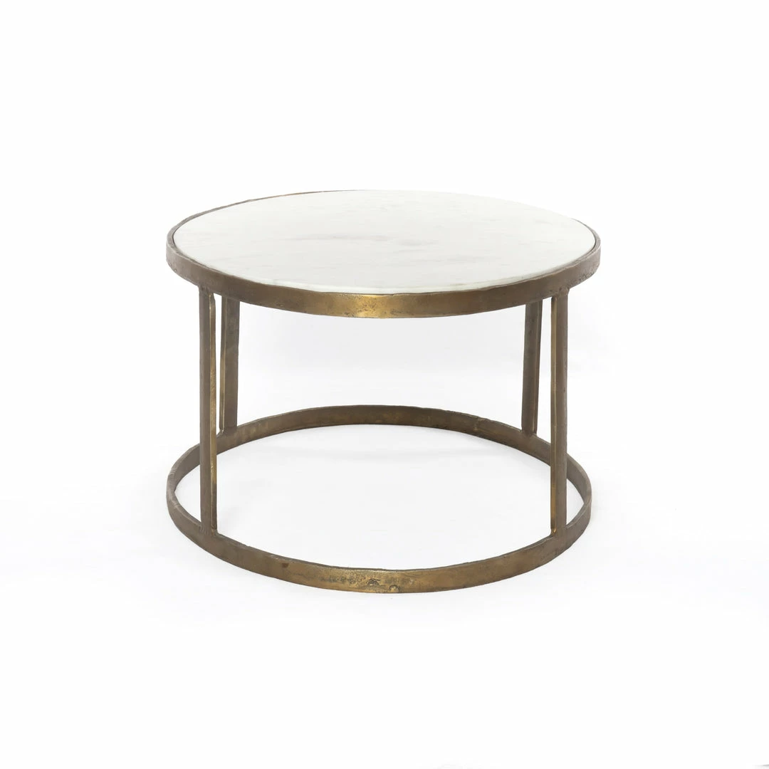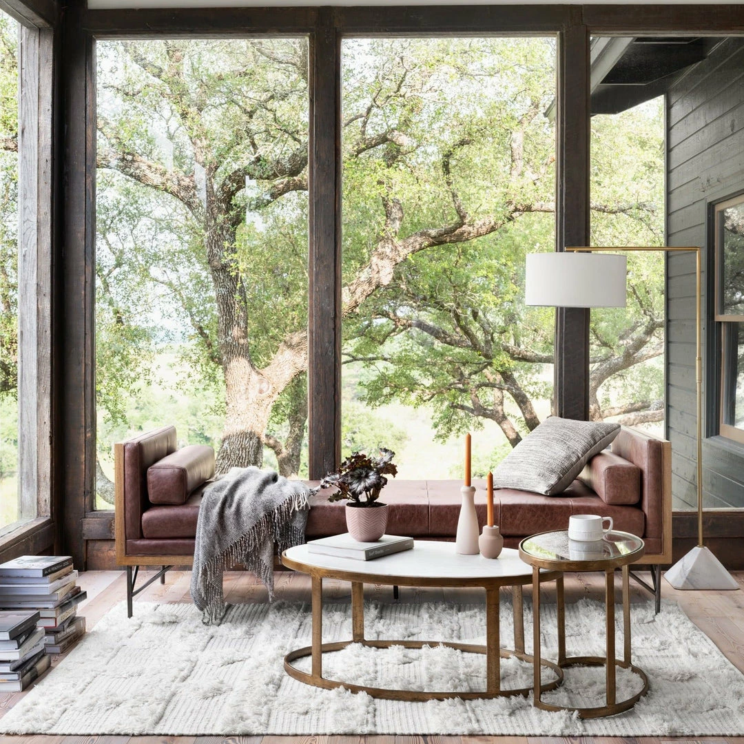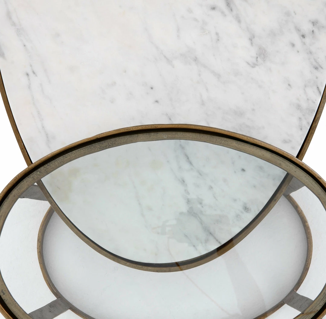 Shapely surfaces, designed to slide together or apart with ease. A raw brass finish lends a lived-in feel to aluminum framing, with one oval-shaped nester topped by polished white marble pairing with a taller, rounded table featuring tempered glass.
