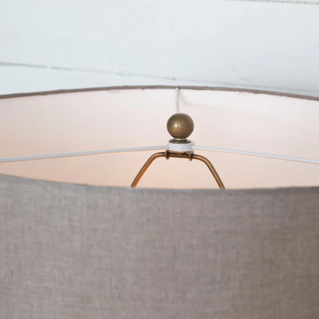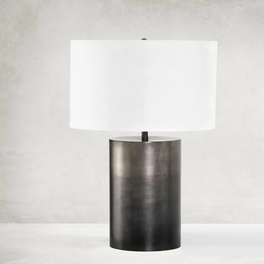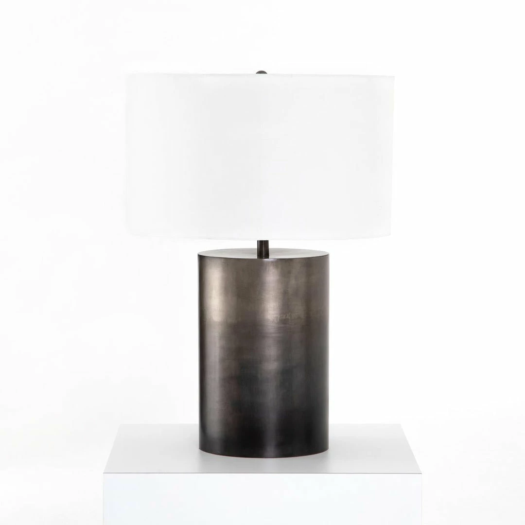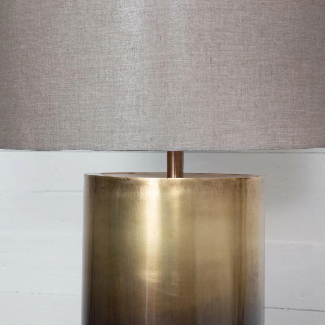 An antique brass finish highlights iron’s gradual blending of hues, delivering a distinctive ombre effect to the cylindrical table lamp. A grey cotton shade plays up this fresh mixing of materials.