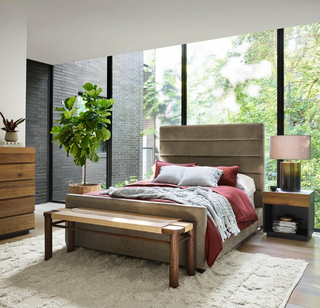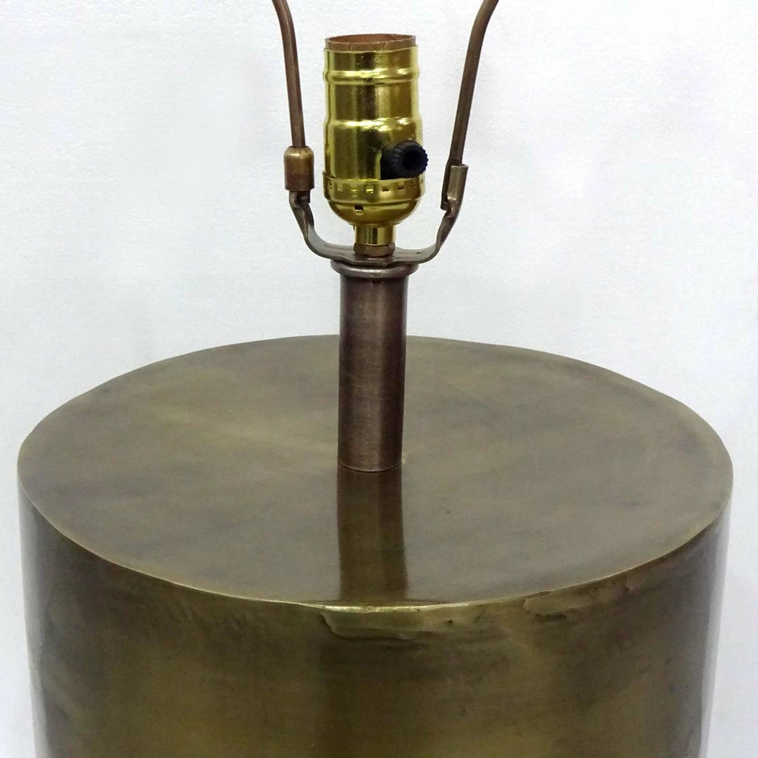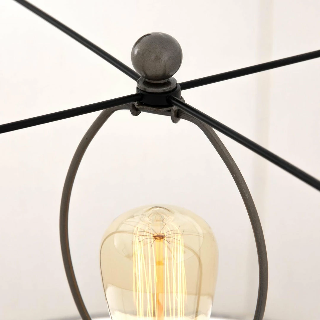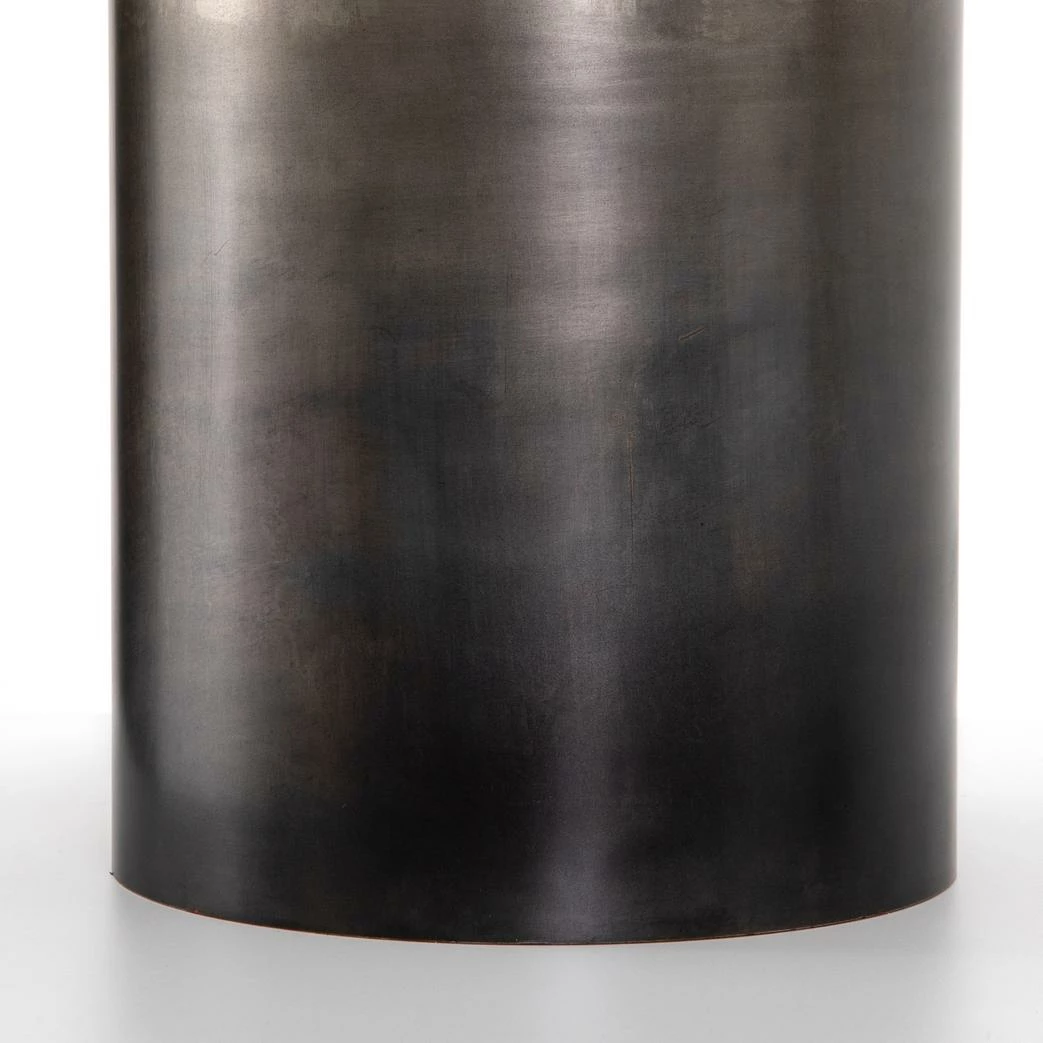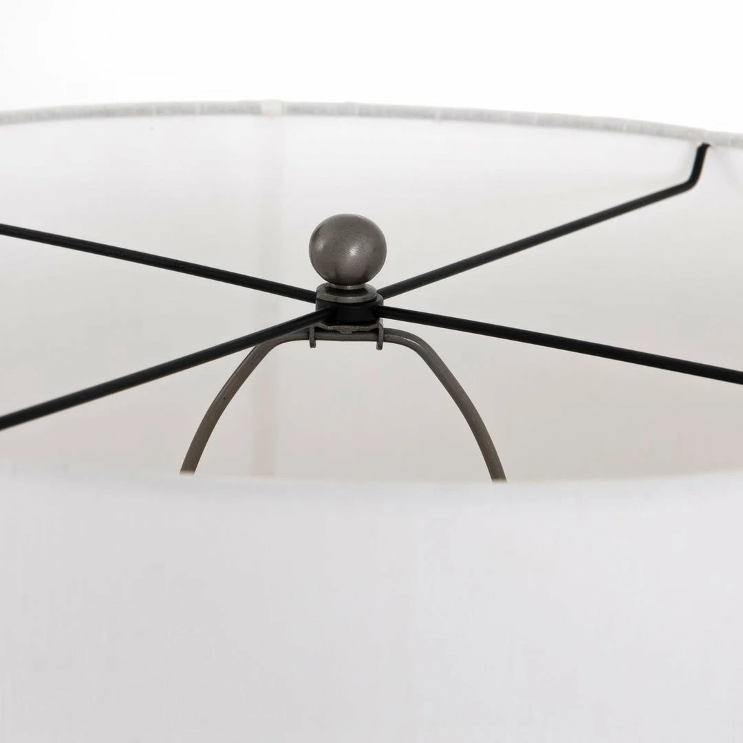 An antique brass finish highlights iron’s gradual blending of hues, delivering a distinctive ombre effect to the cylindrical table lamp. A grey cotton shade plays up this fresh mixing of materials.