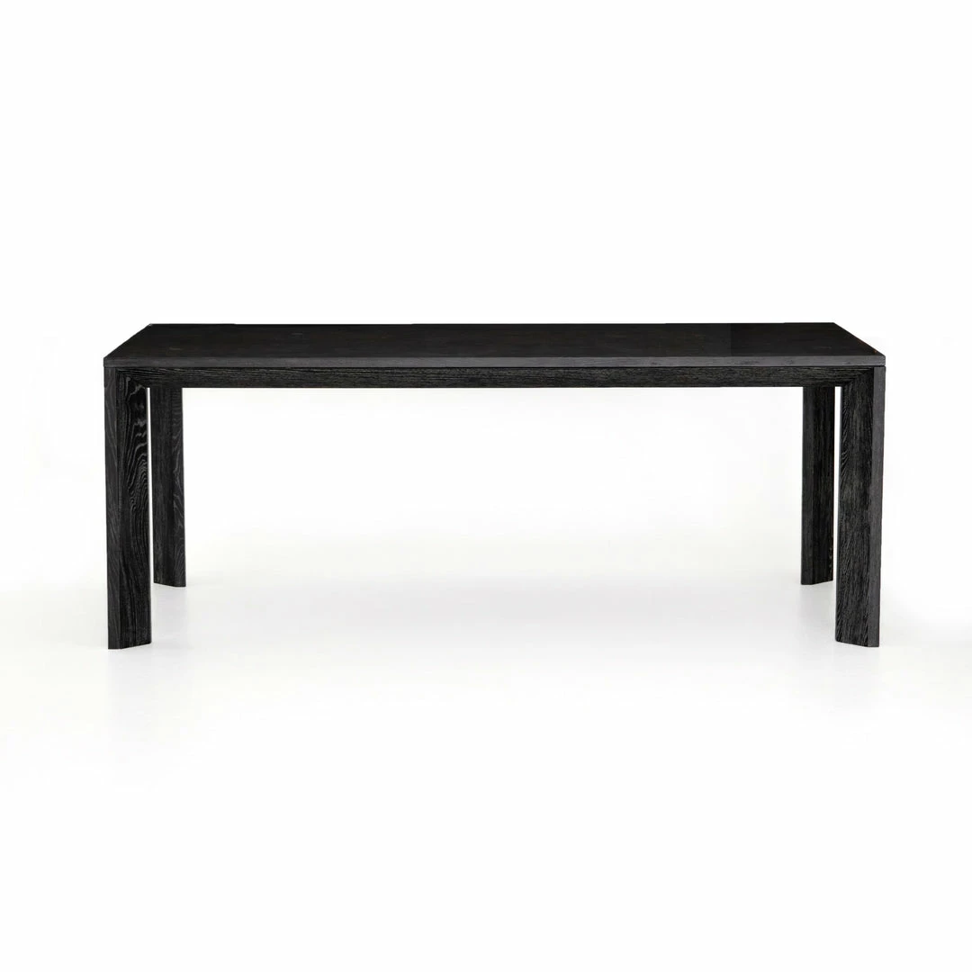 Simple while sophisticated. A clean, Parsons-style dining table of black-washed oak adopts new depth by way of a bluestone inset top and cleverly splayed legs.