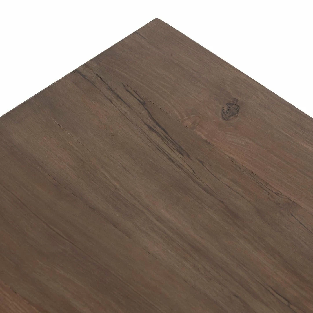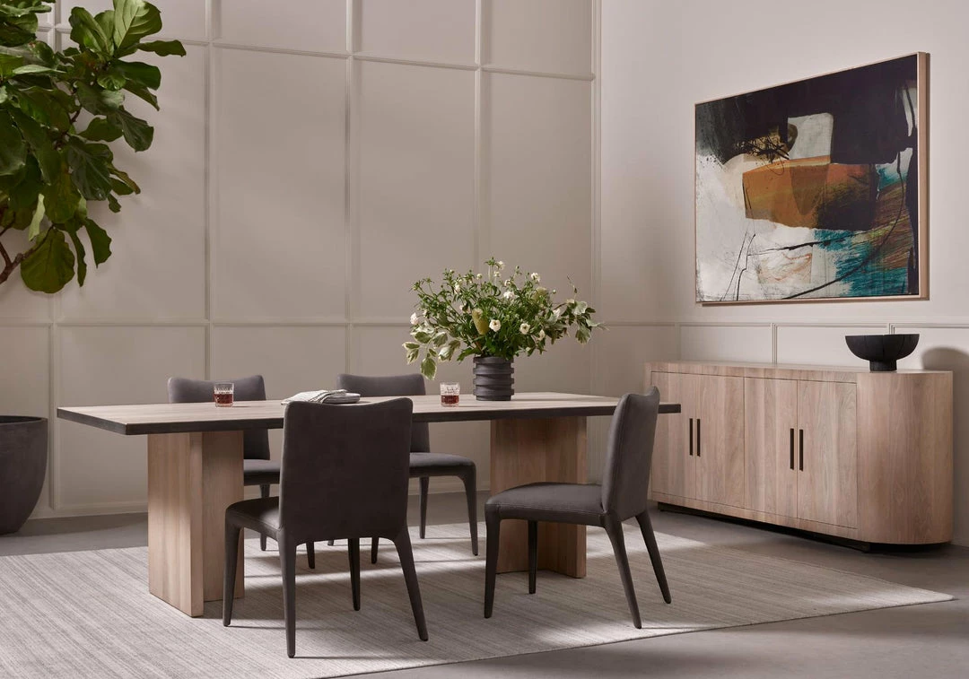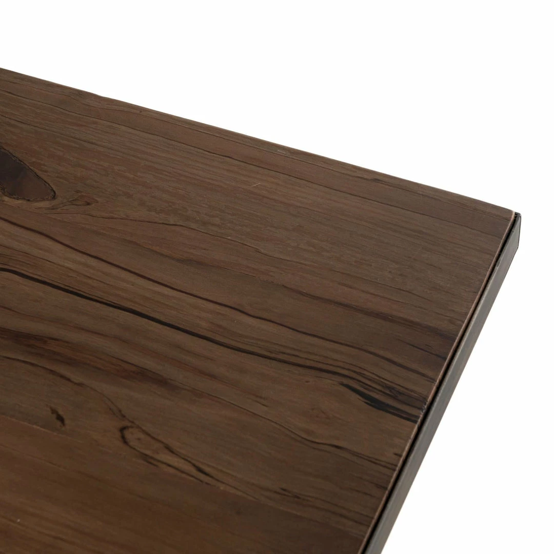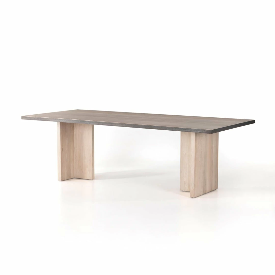 Iron strapping with a brushed gold finish adds a rustic, industrial edge to a substantial plank table. Beautiful graining marks simple, cross-shaped trestles and table top.