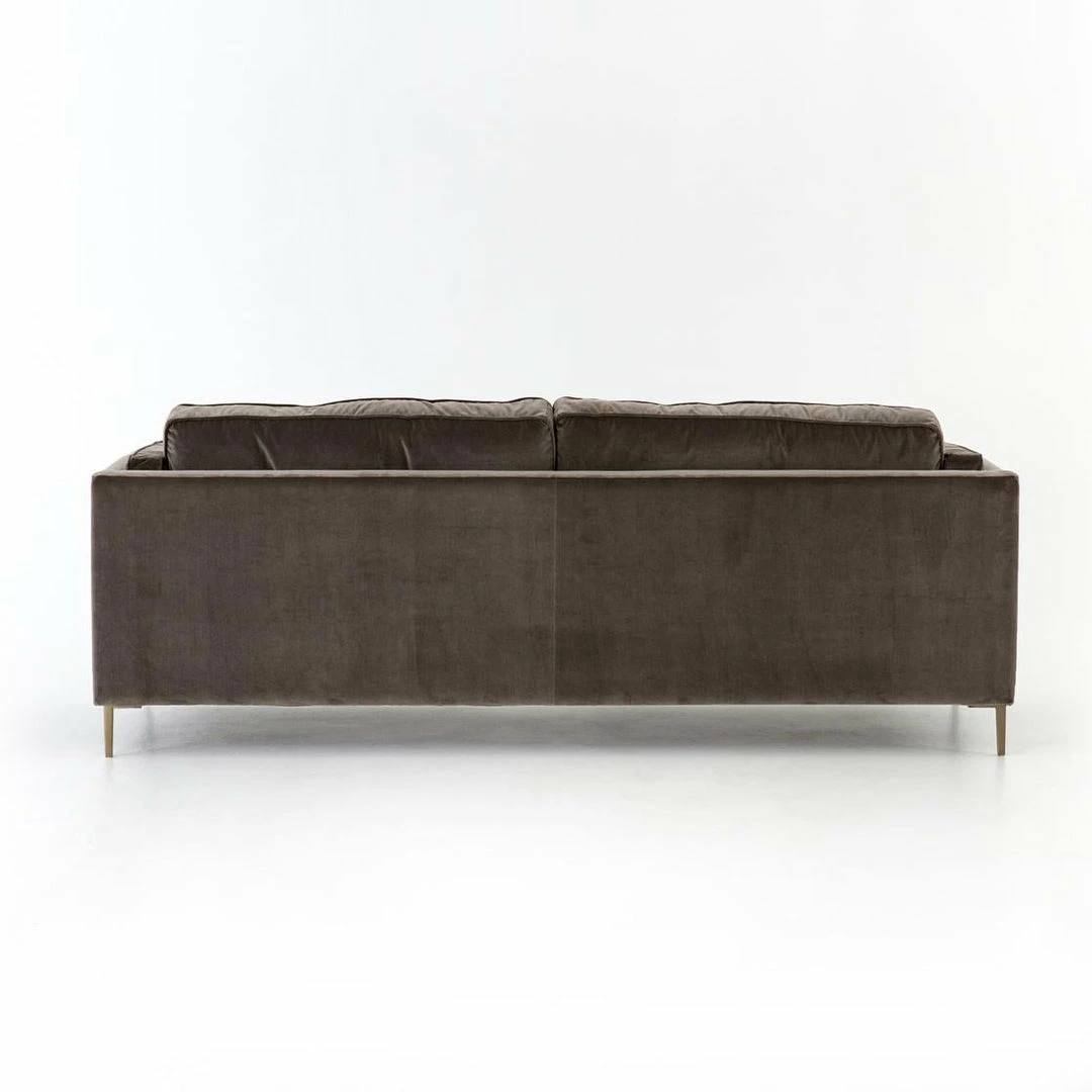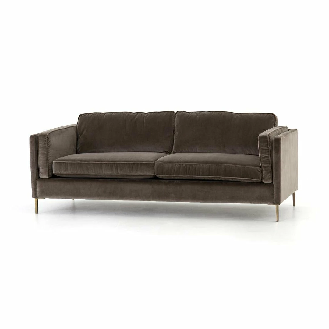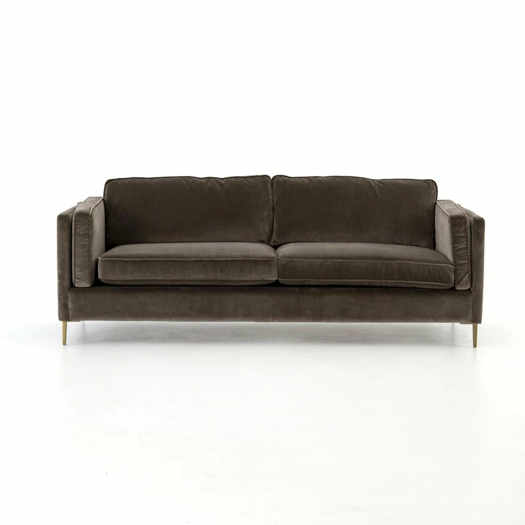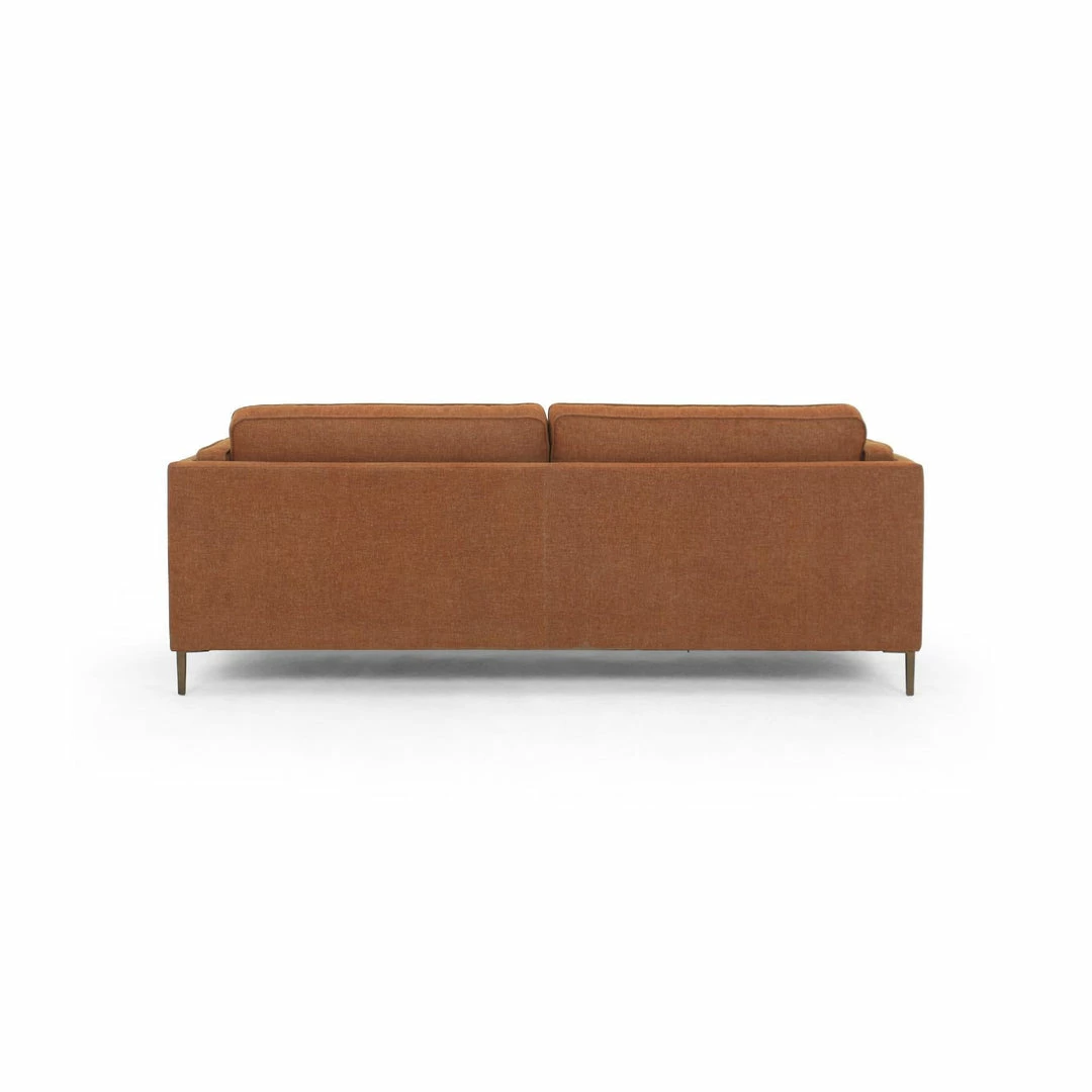 Clean, mid-century styling adopts modernity via textural upholstery in a warm rust. Tailored lines meet slim legs of bronze-finished aluminum for a sophisticated finishing touch.