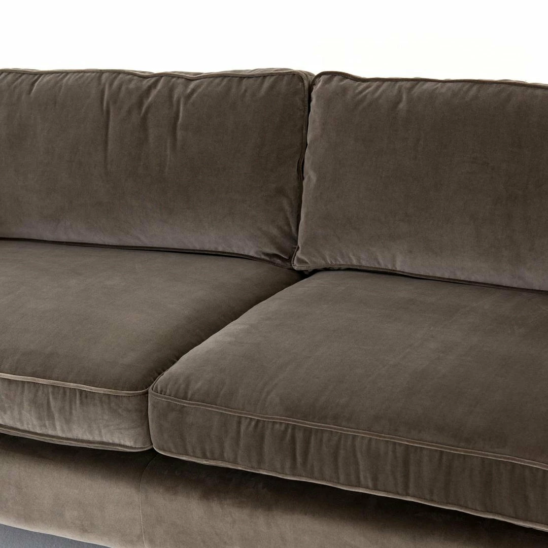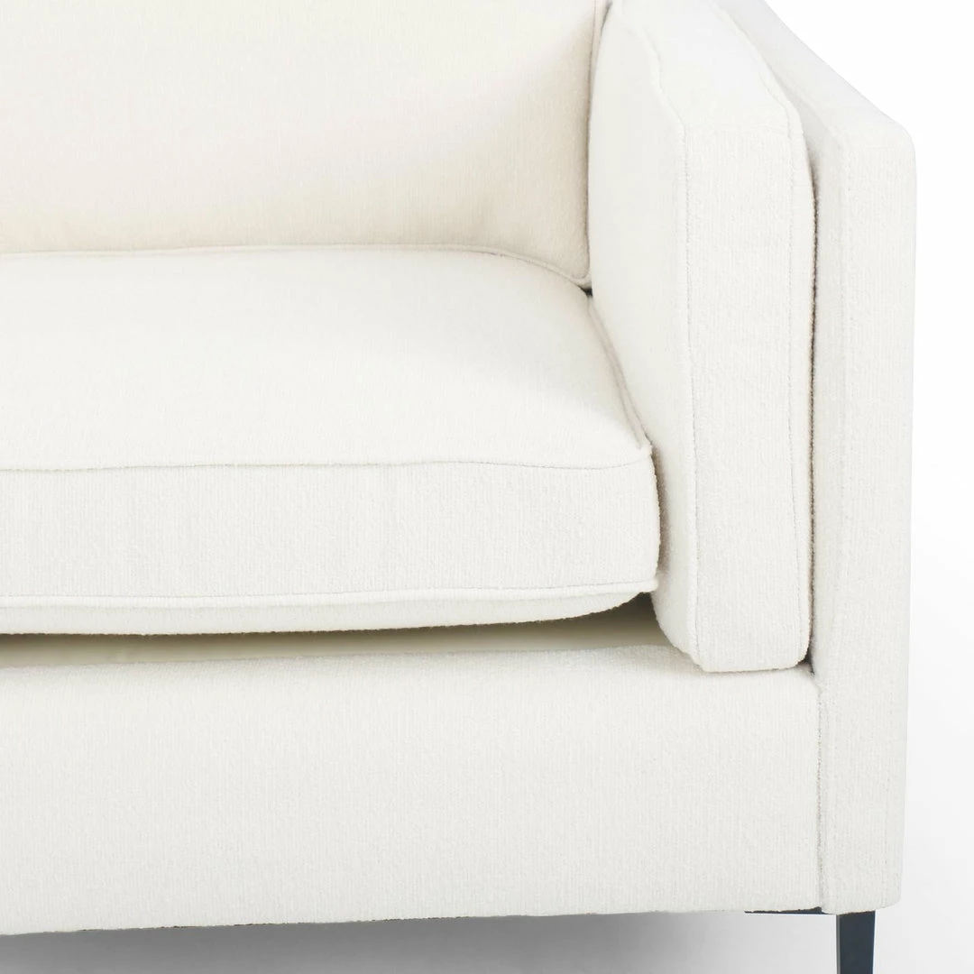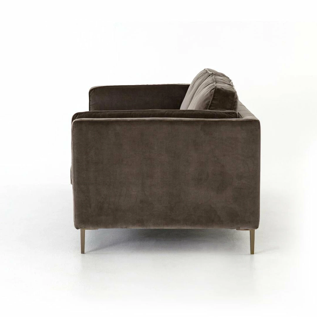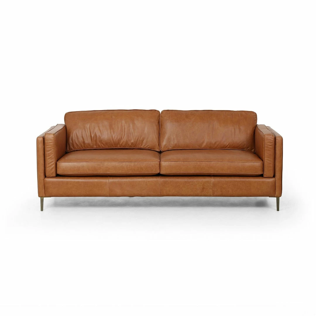 Clean, mid-century styling adopts modernity via textural upholstery in a warm rust. Tailored lines meet slim legs of bronze-finished aluminum for a sophisticated finishing touch.
