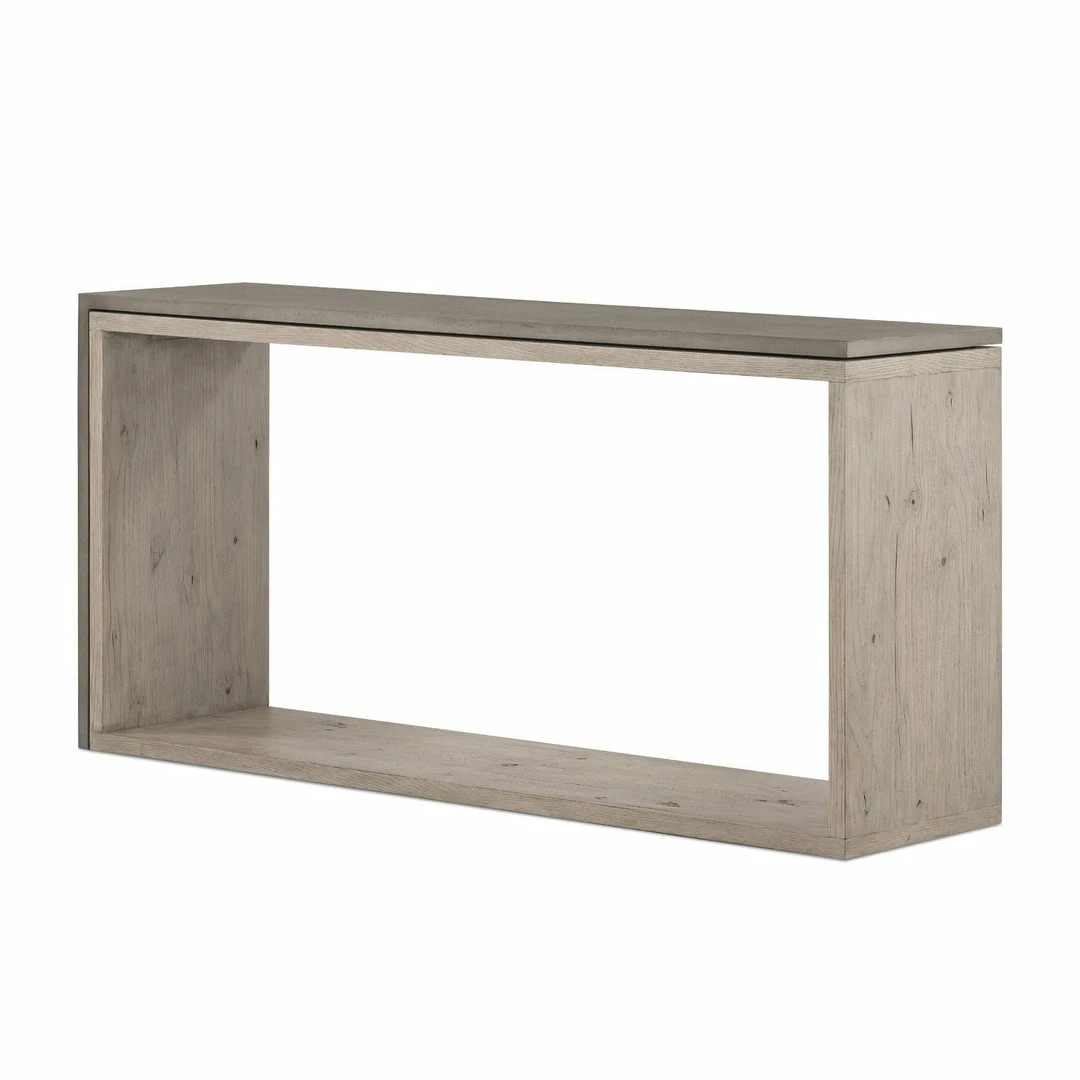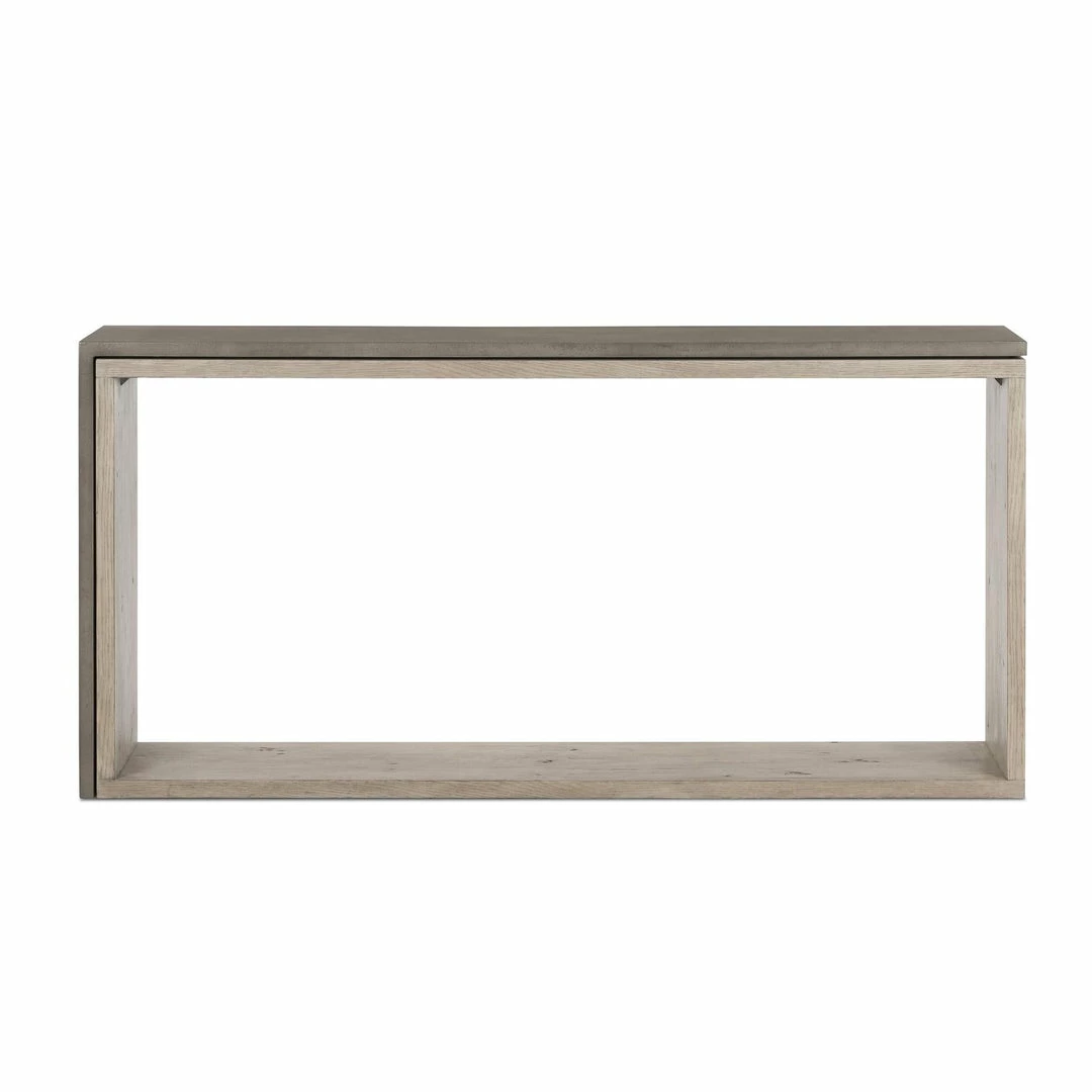 Thick-cut oak veneer forms a clean, structured frame for a fold-over concrete top finished in a deep, dark grey.