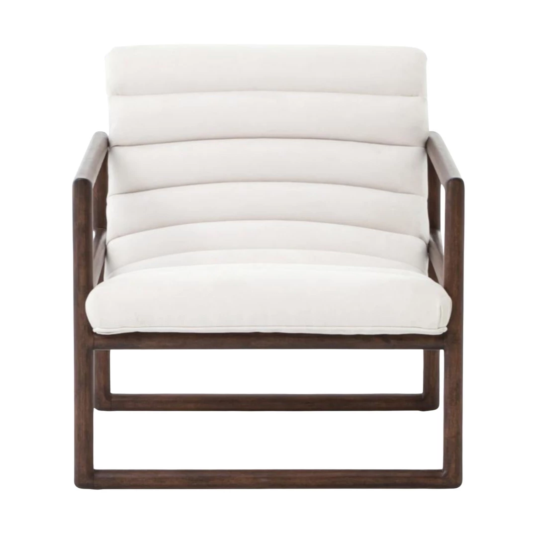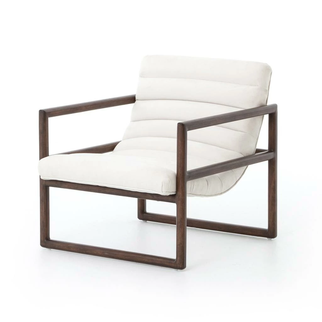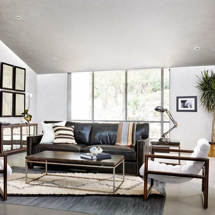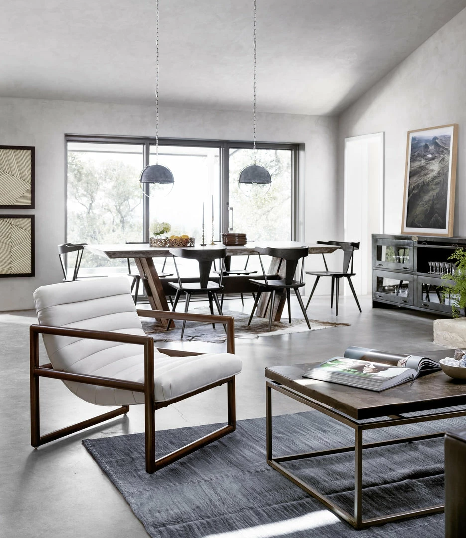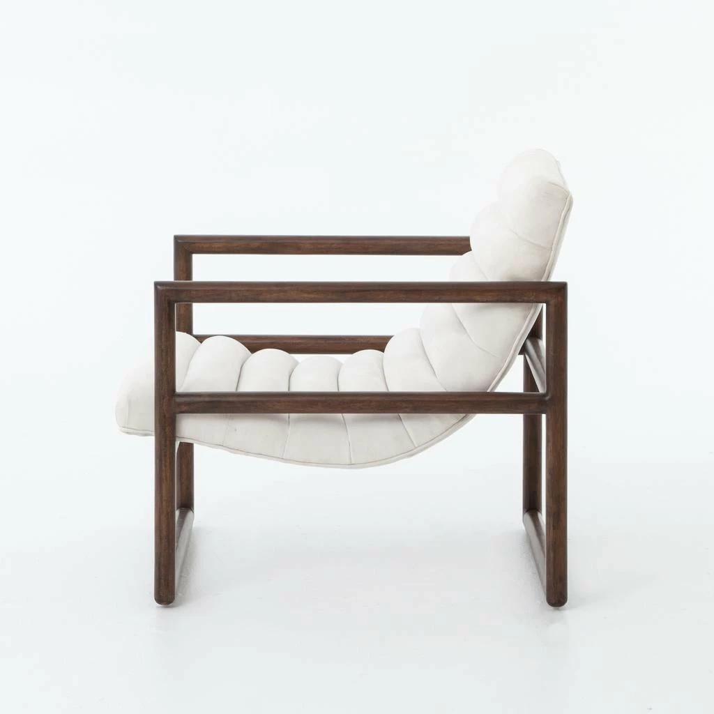 Invitingly curved, navy top-grain leather is framed to wonderful effect. Horizontal channeling plus squared off, repetitive lines create alluring negative—and positive—spaces.