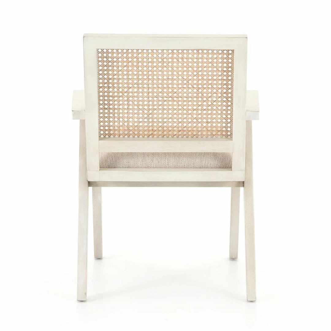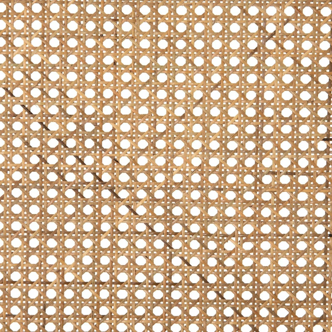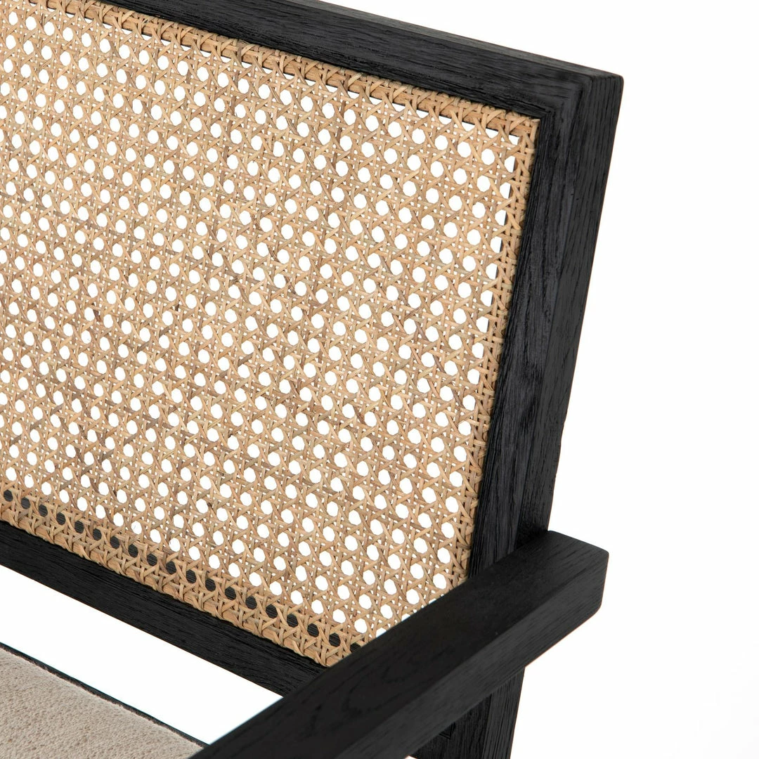 Inspired by Swiss-French architects Le Corbusier and Pierre Jeanneret, a high-contrast dining chair features black-finished solid oak framing, with woven cane seating, for a texture-driven look with mid-century vibes.