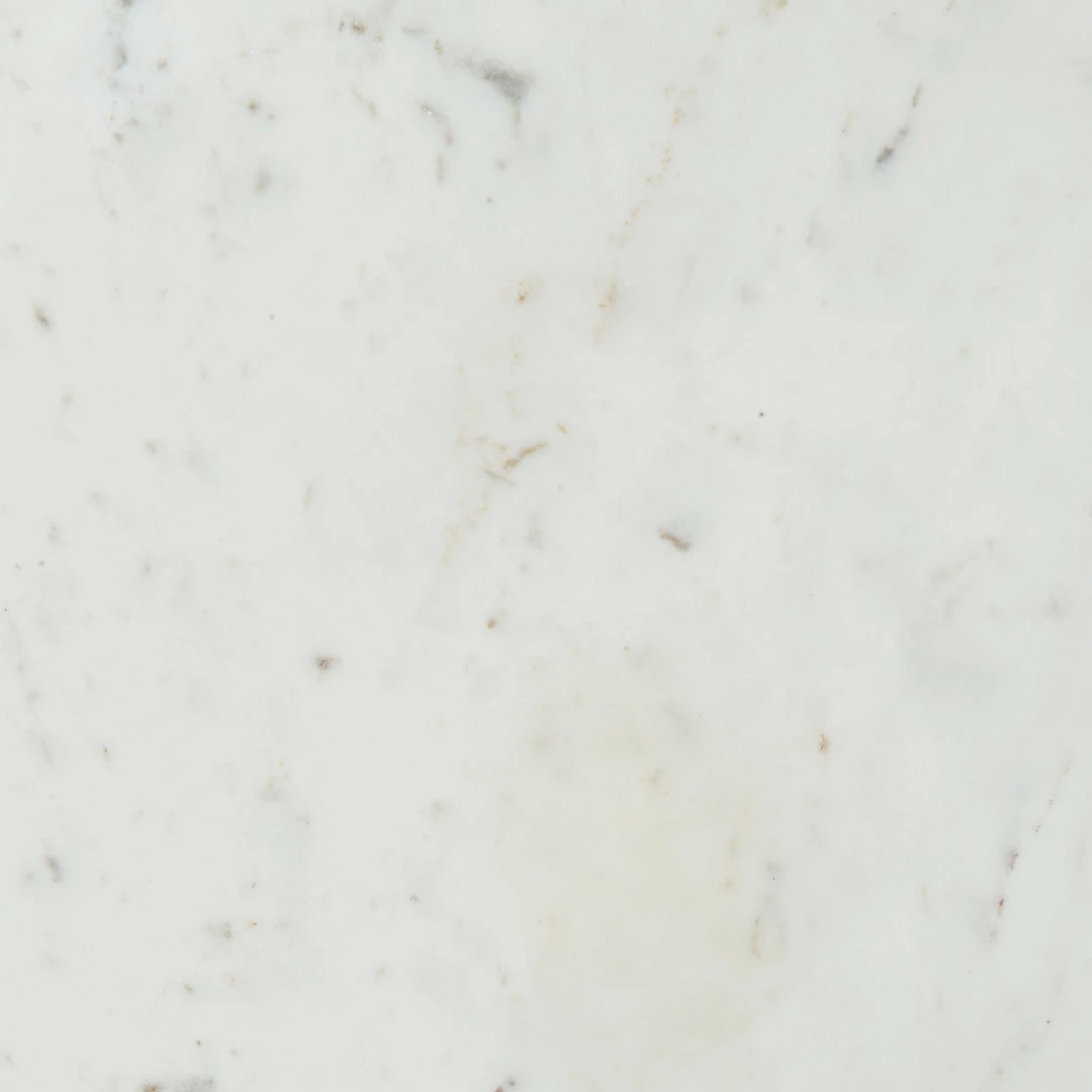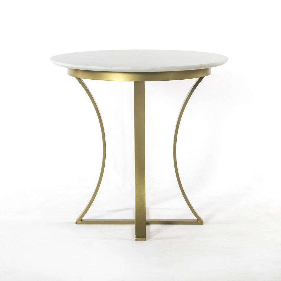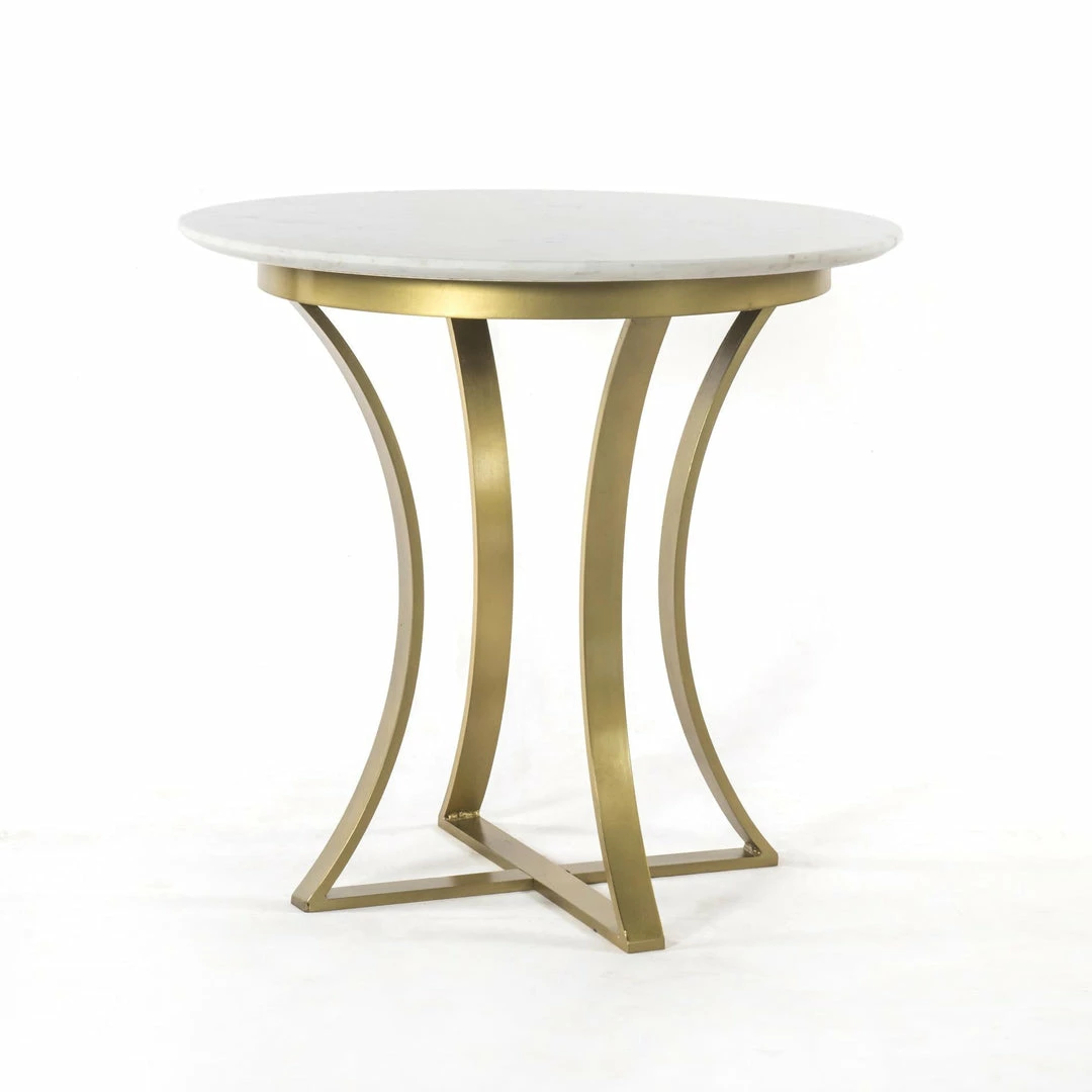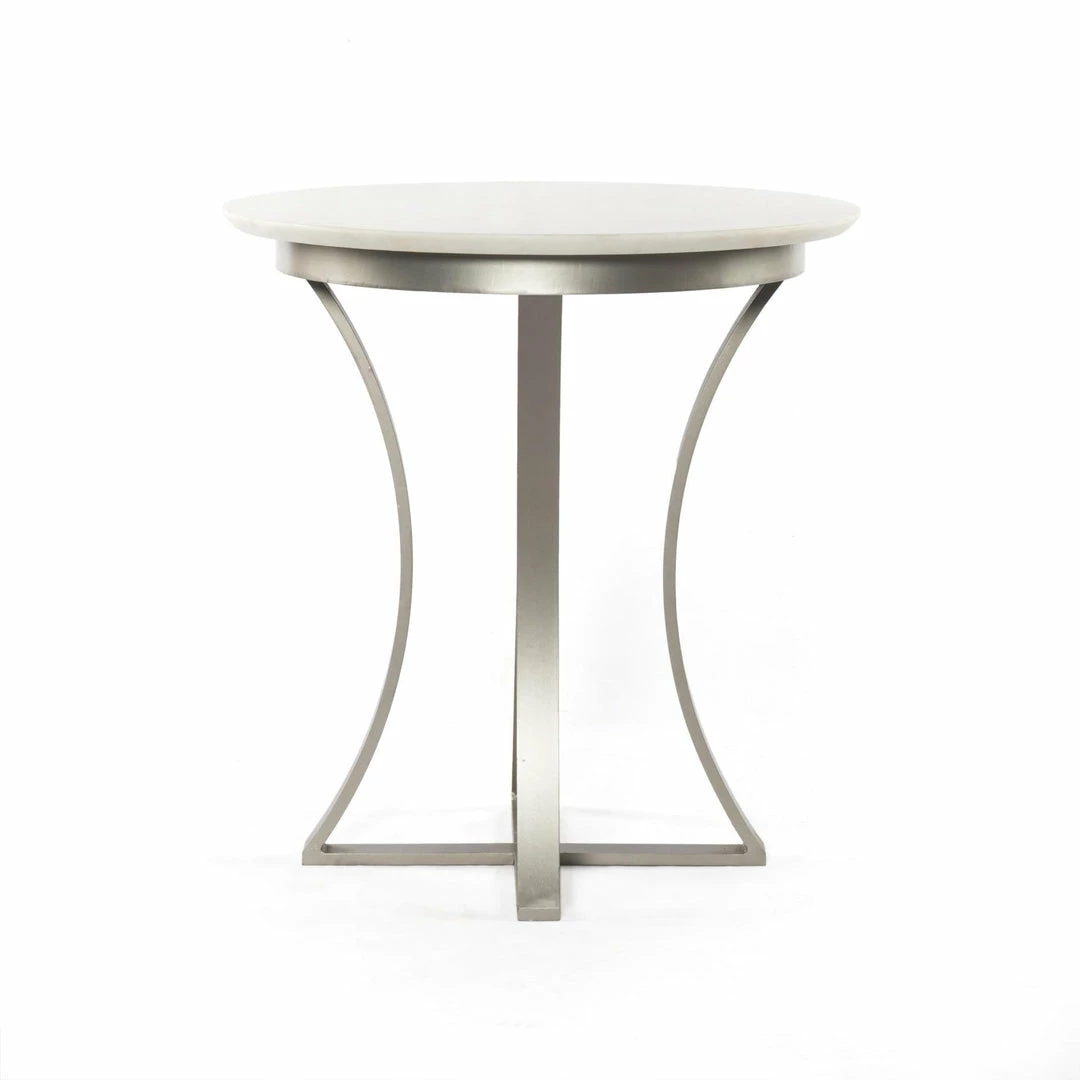 Sophisticated materials take a cue from modern geometry. Pewter-finished iron forms uniquely-curved angles to balance a contrasting polished white marble top.