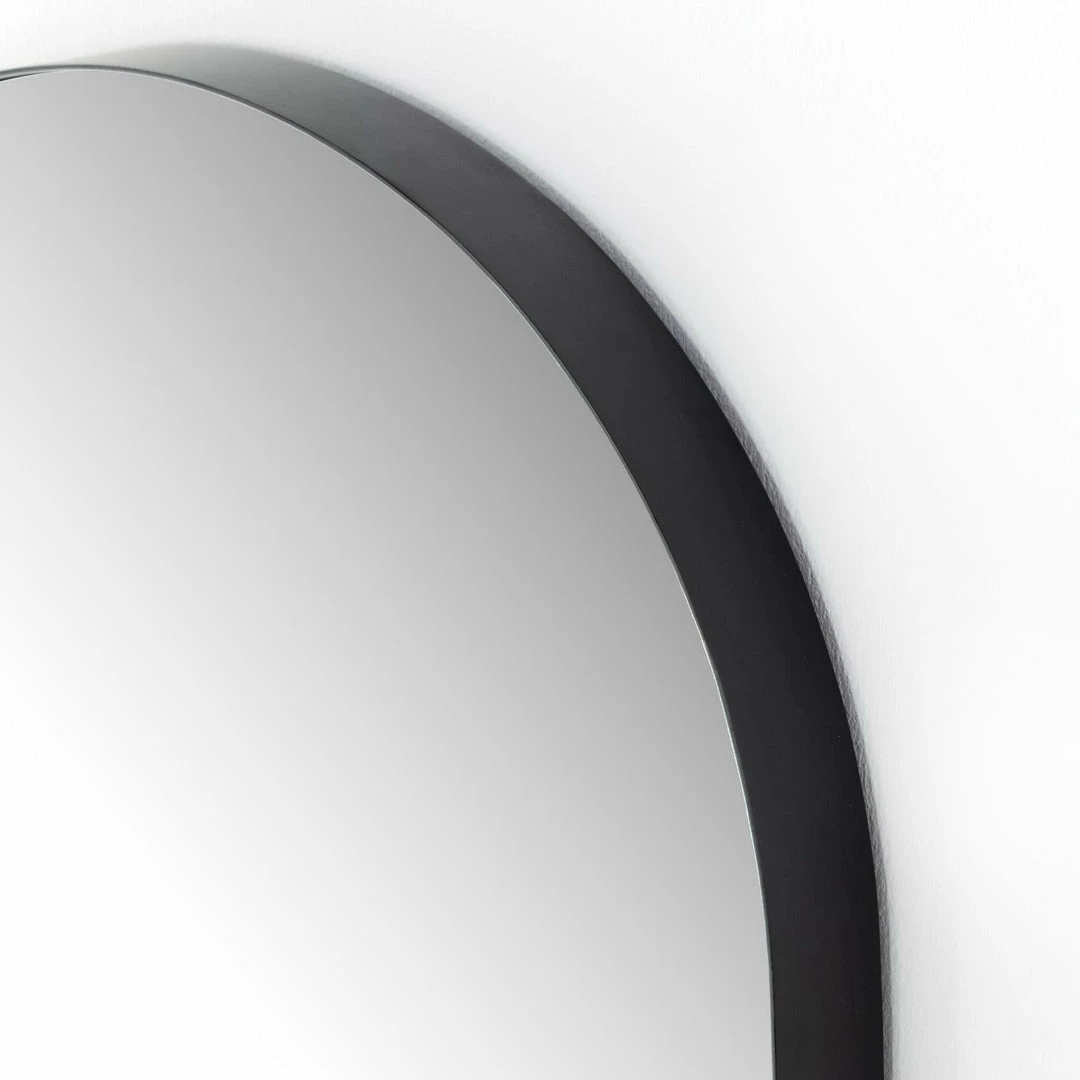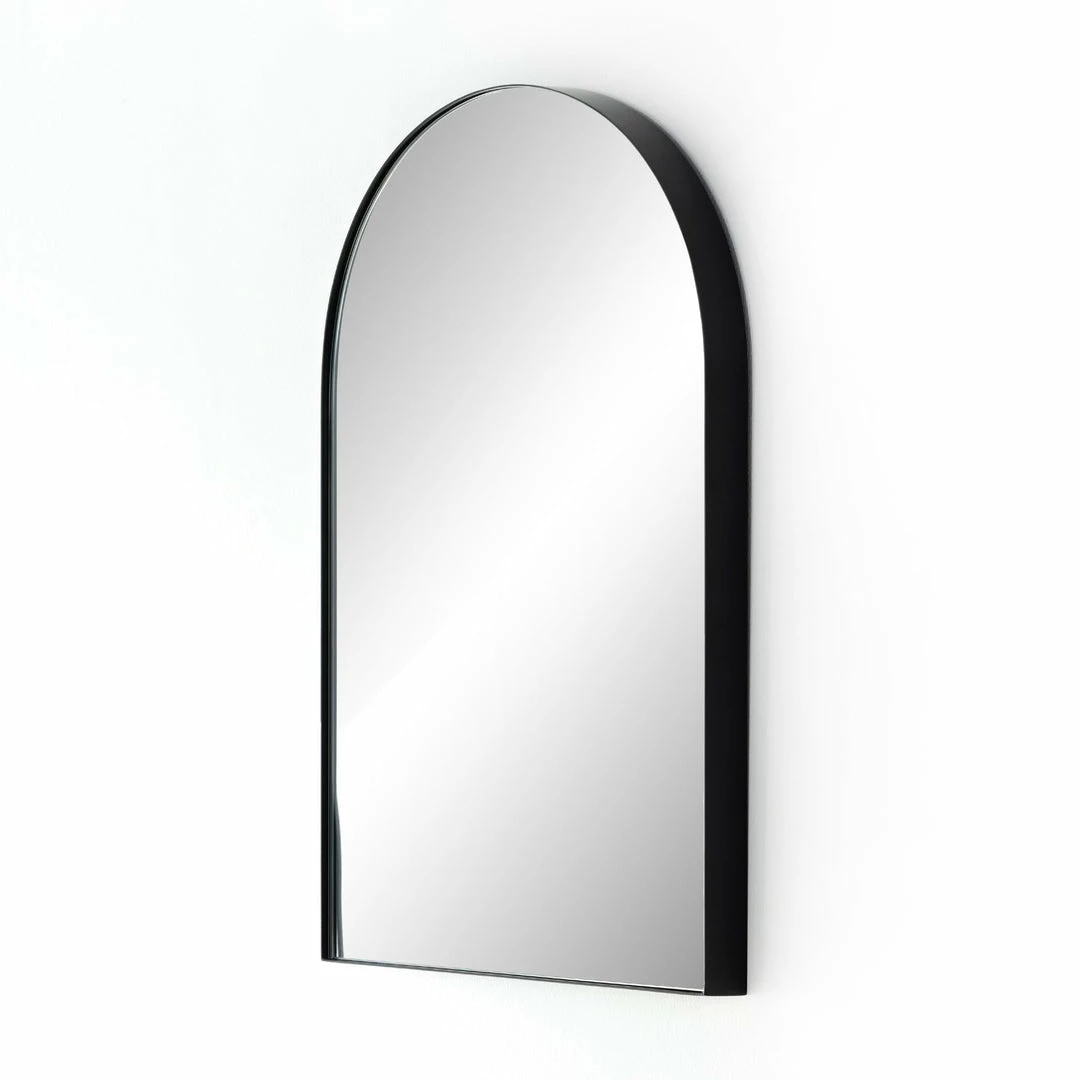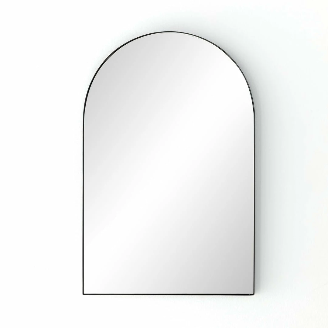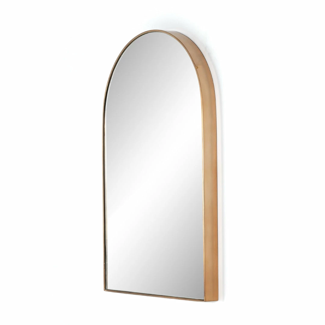 A beautifully arched mirror, framed out by rose gold-finished aluminum.