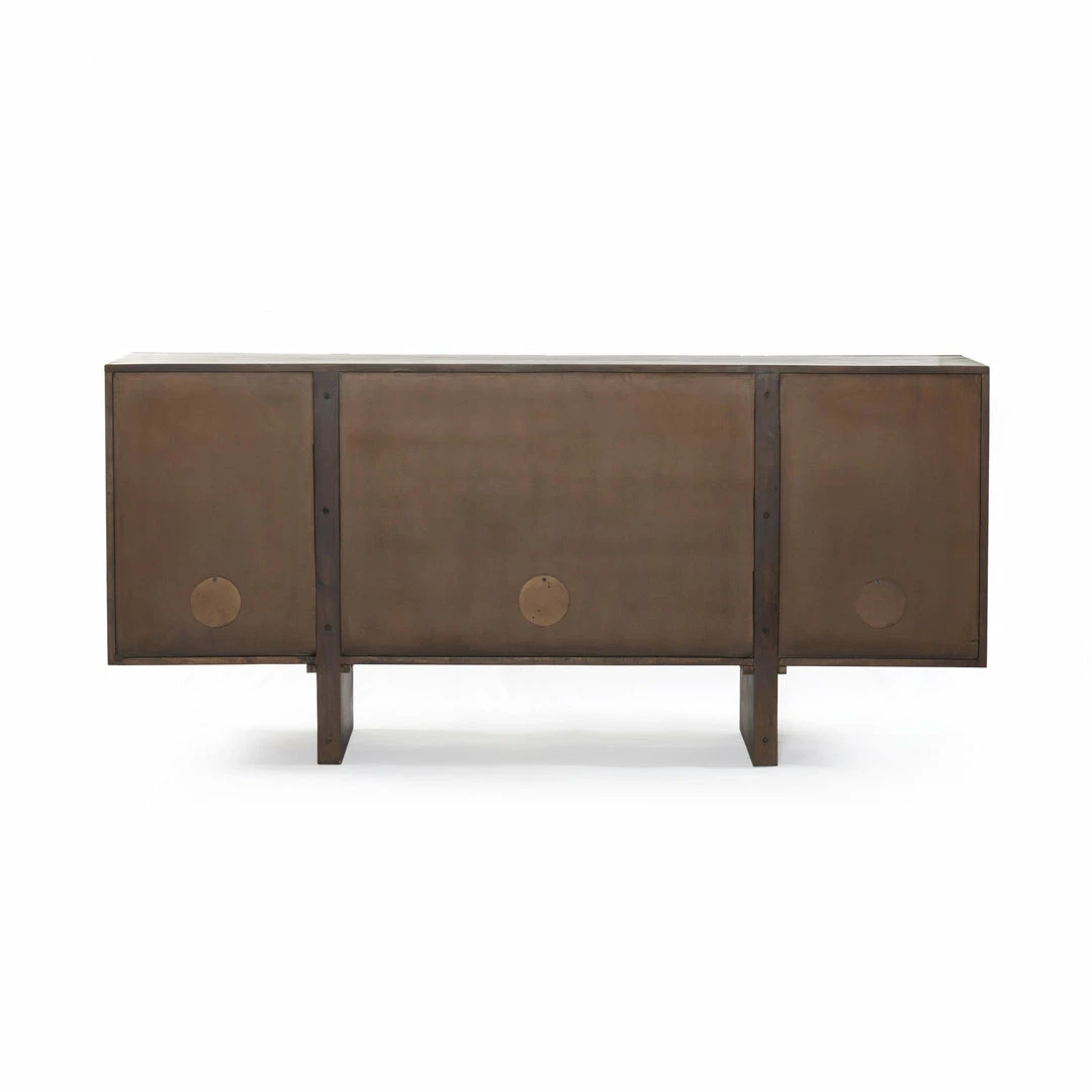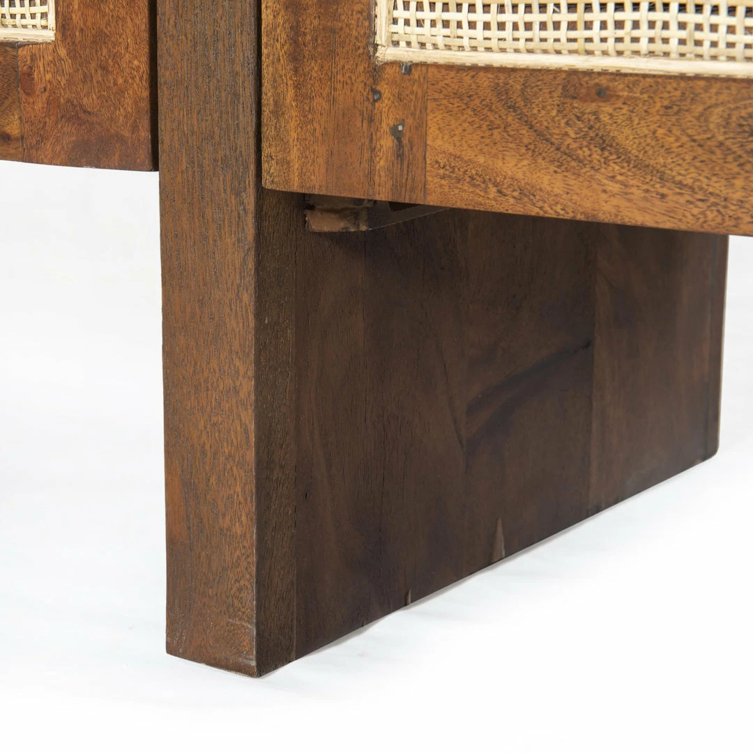 Mid-century inspiration at its finest. Chunky, inset legs of toasted acacia ground a linear sideboard featuring natural cane door fronts, for a fresh, textural twist. A removable faux locking key reimagines traditional hardware into something entirely novel. Rear cutouts for cord management.
