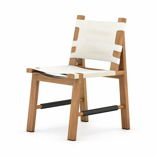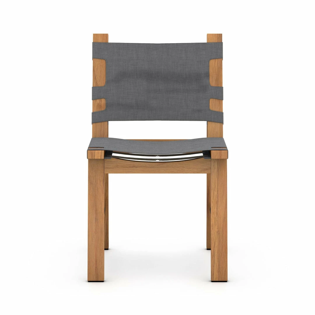 Inspired by Danish architect Borge Mogenson, natural FSC-certified teak forms a primitive-feeling frame for charcoal seating, with grey rope detailing on each dowel stretcher. Cover or store indoors during inclement weather and when not in use.