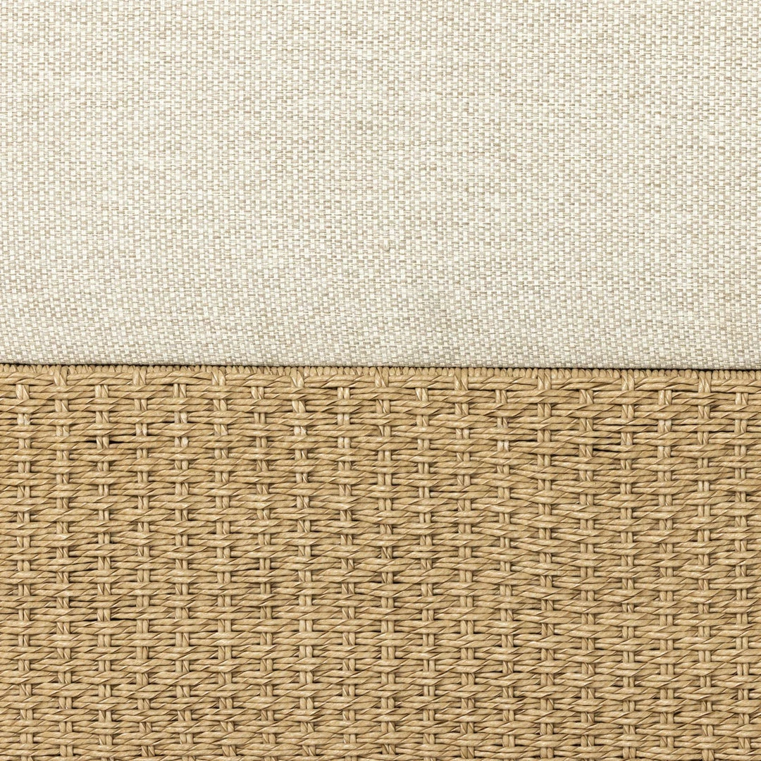 Regal outdoor seating in an extralong length. Seat cushion and sculptural arms and back bolsters are tightly upholstered in 100% Olefin known for its UV-resistant, water-repellent, quick-drying abilities. Cutout wicker base adds a sense of airiness to the design above teak plinth feet. Cover or store indoors during inclement weather and when not in use.