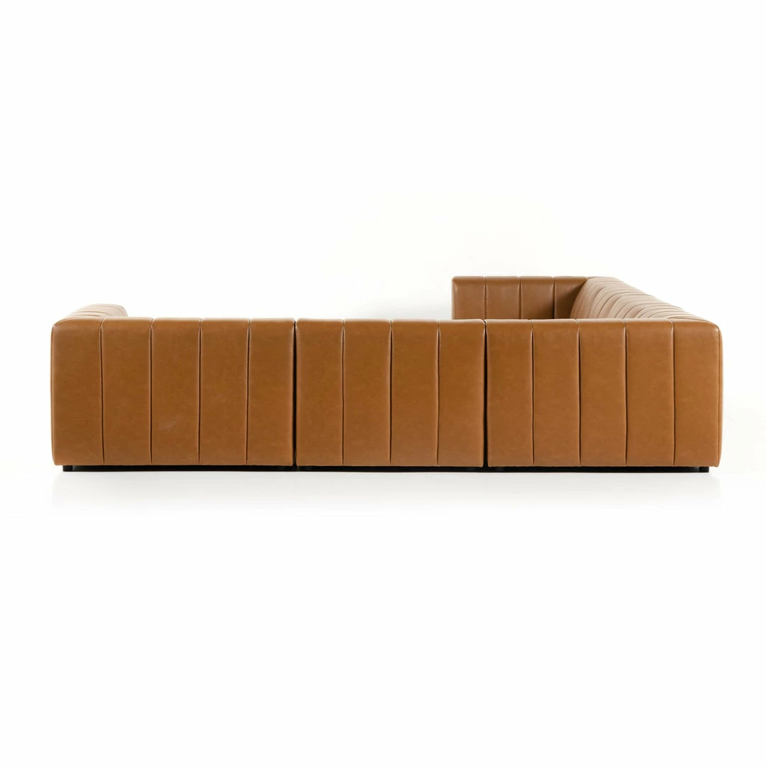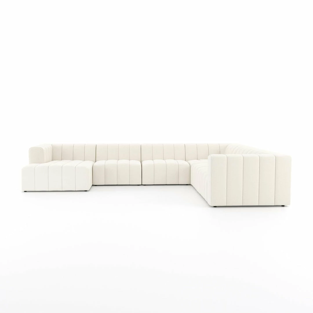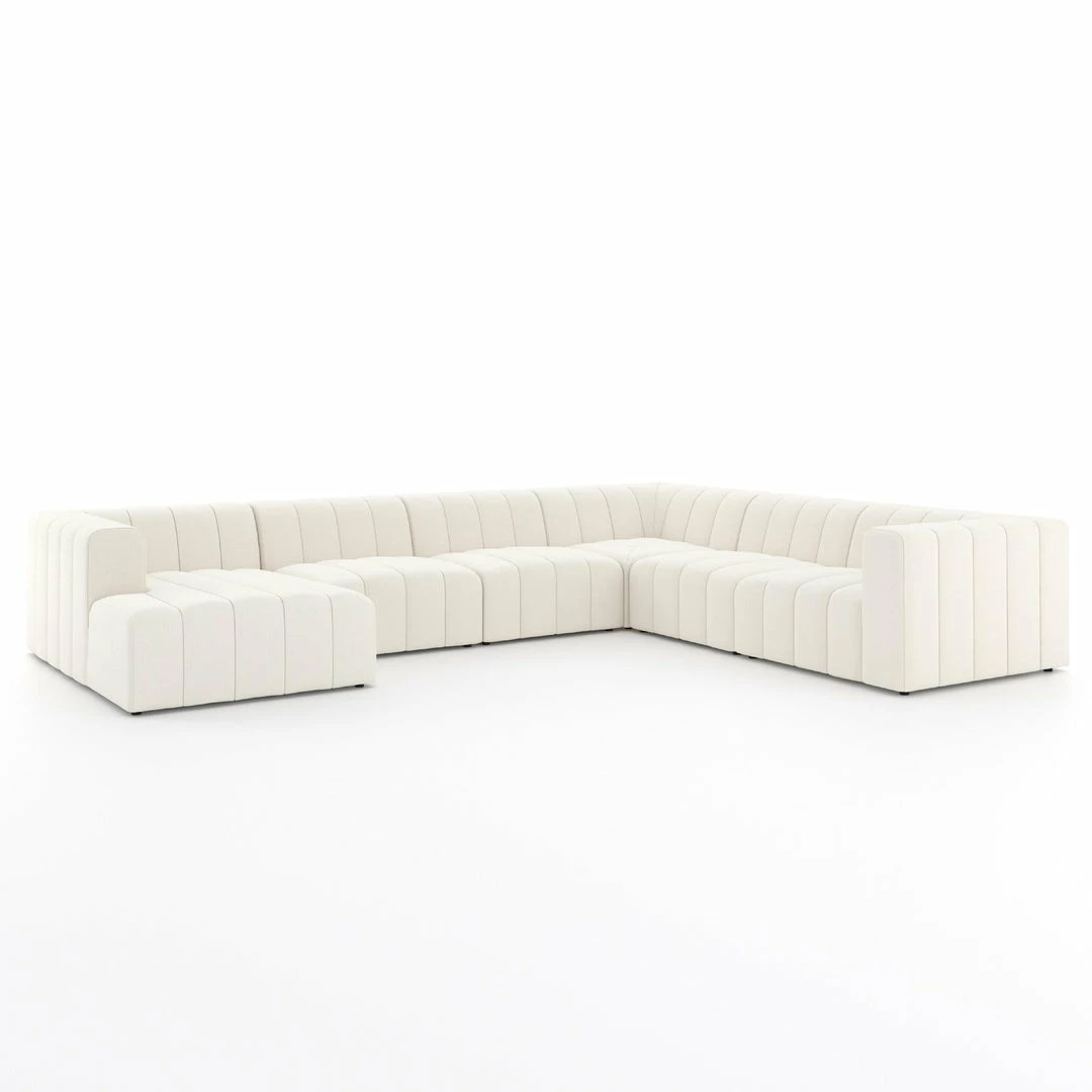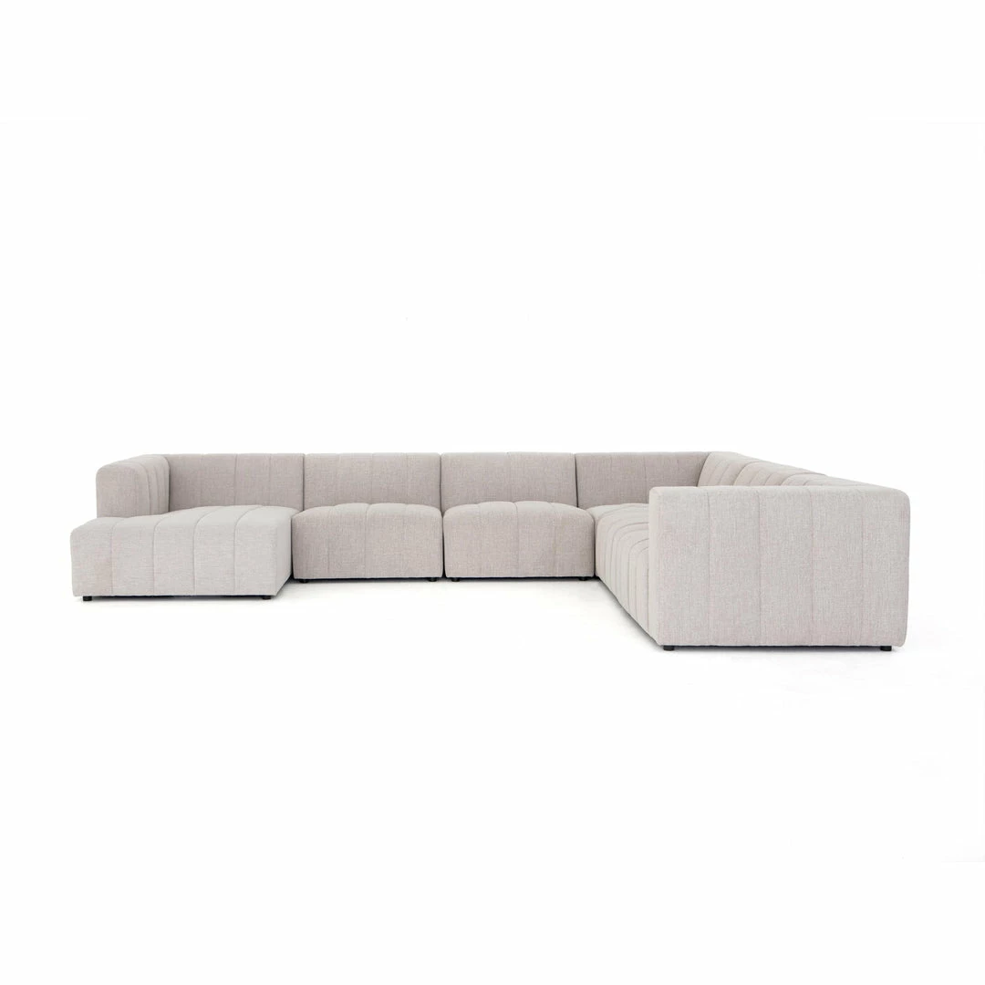 The sensible six-piece sectional meets modern Italian styling, with a matching left arm facing chaise, wide channeling and oversize arms. Neutral sandstone-colored covering awes in any space.