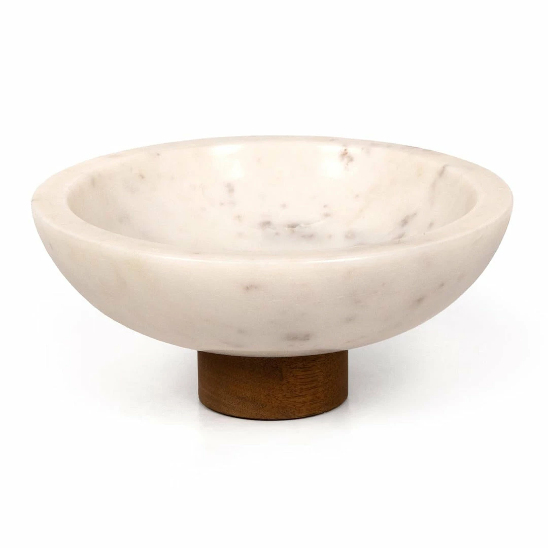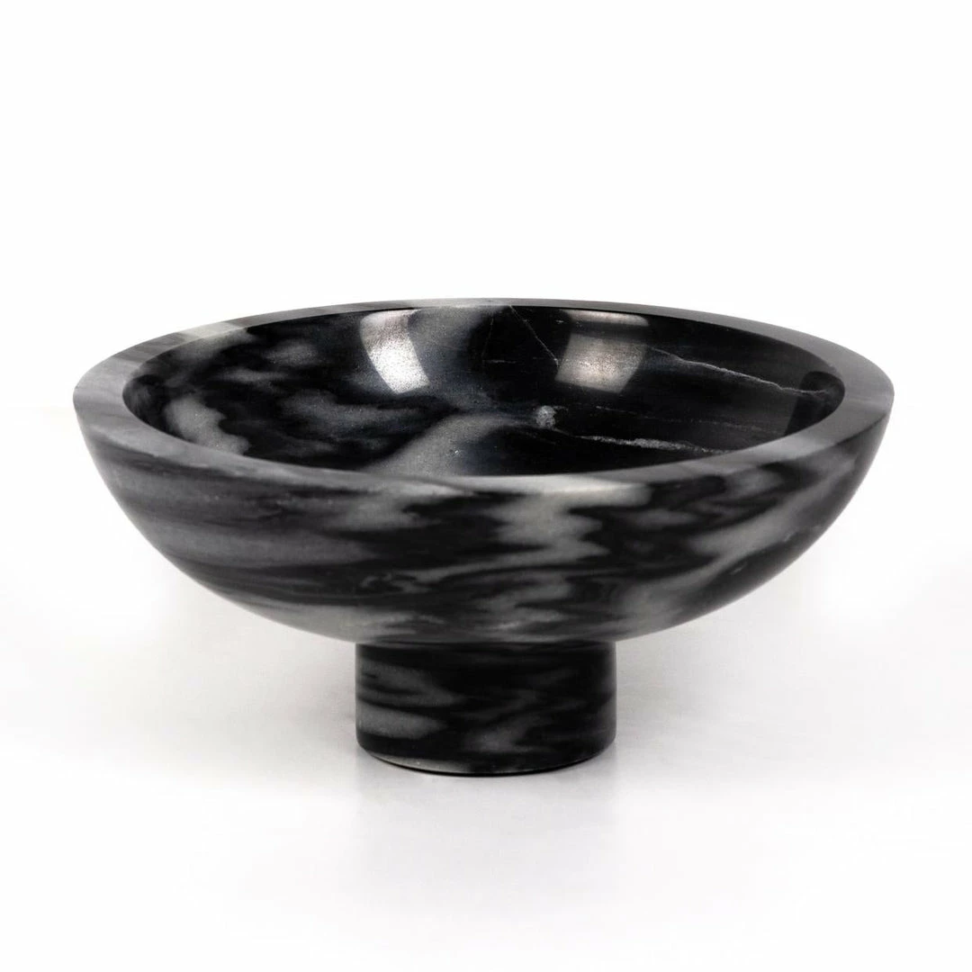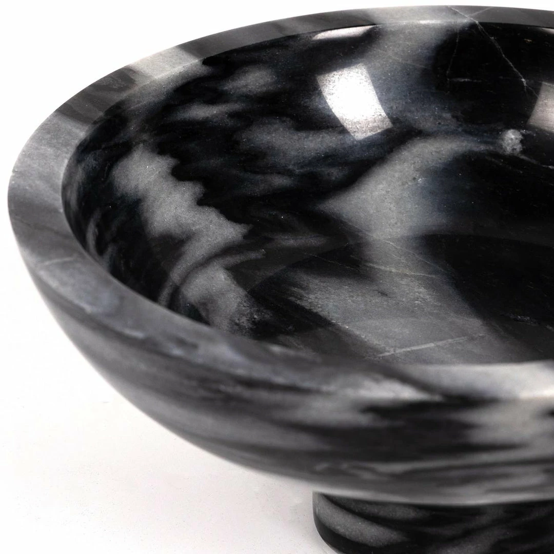 Catchall-style storage with a sophisticated spin. A pedestal base of swirling black and grey marble supports a beautiful bowl, perfect for displaying decorative fruit or keeping frequently used items on hand.
