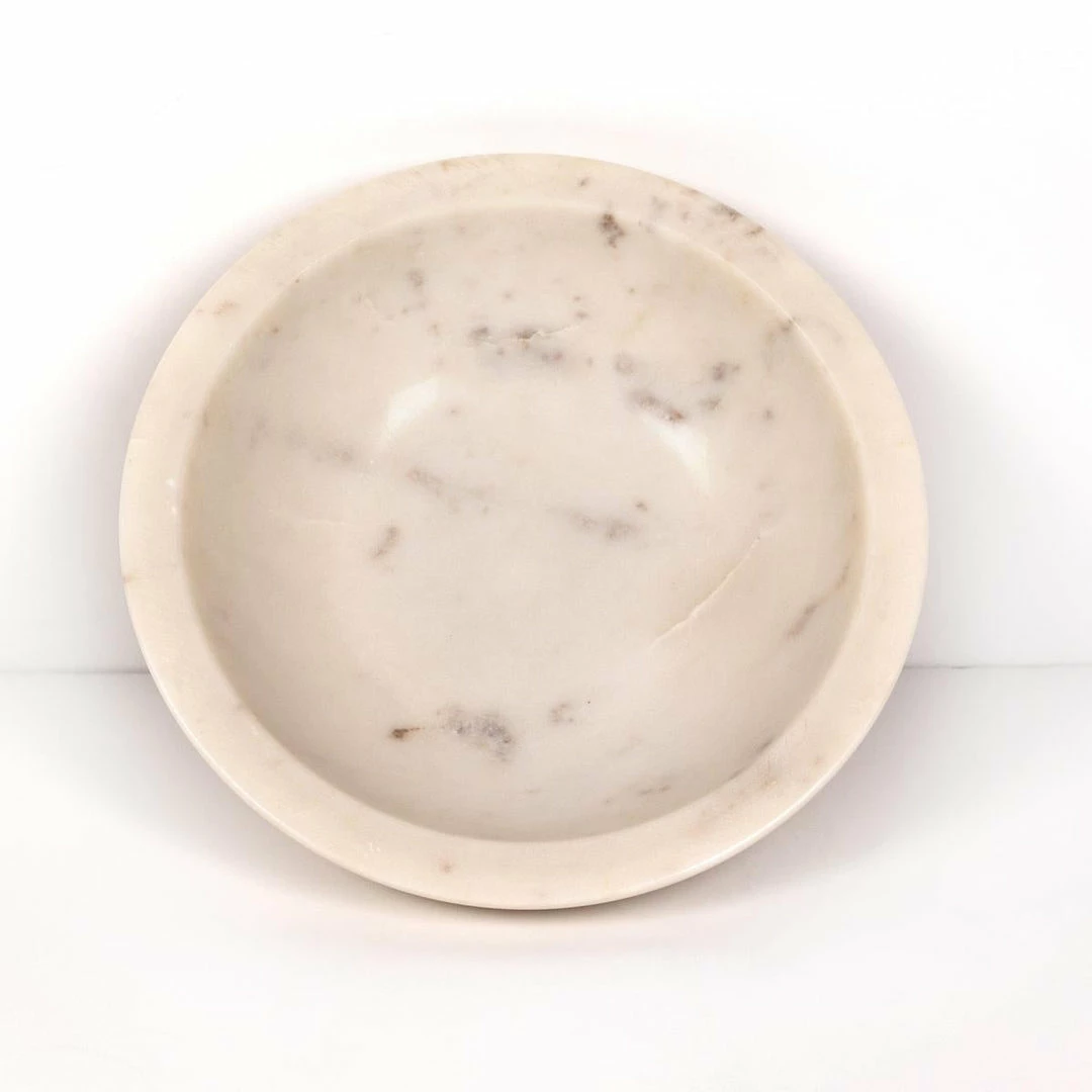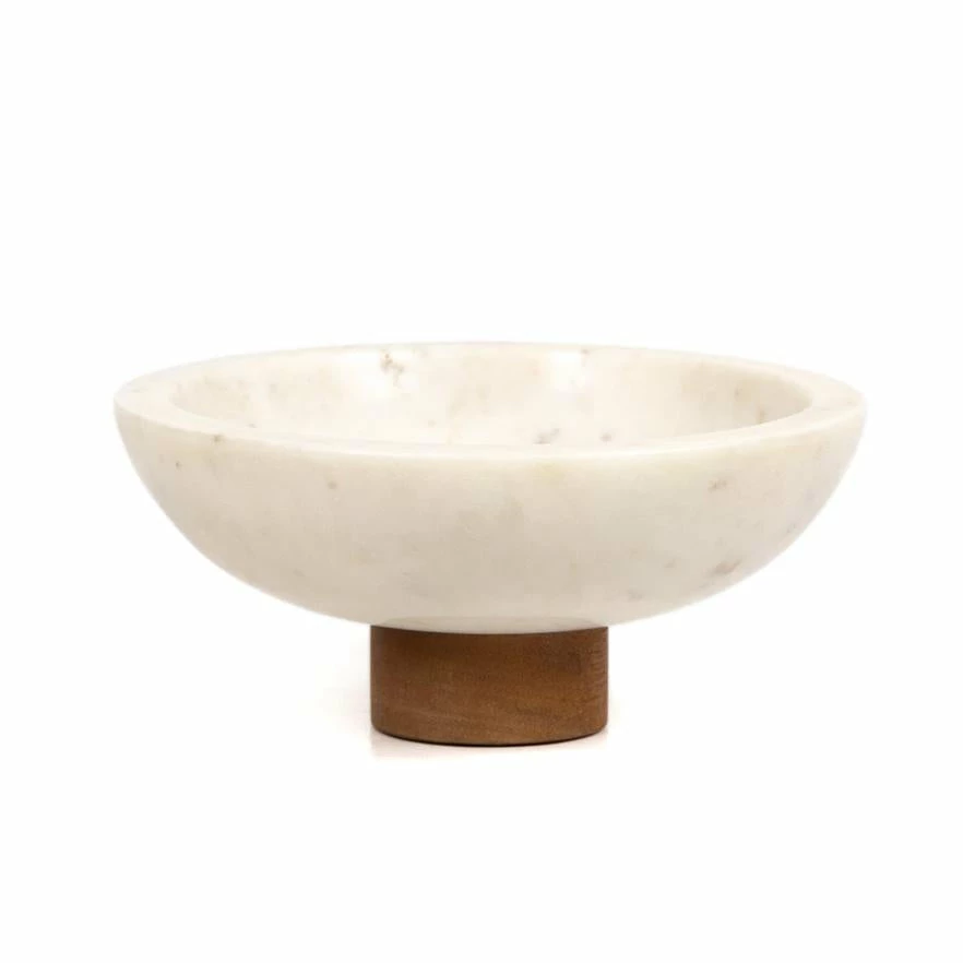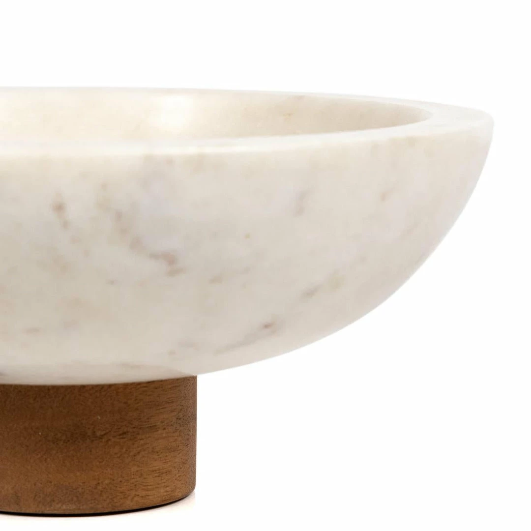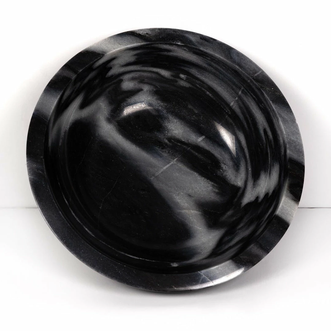 Catchall-style storage with a sophisticated spin. A pedestal base of swirling black and grey marble supports a beautiful bowl, perfect for displaying decorative fruit or keeping frequently used items on hand.