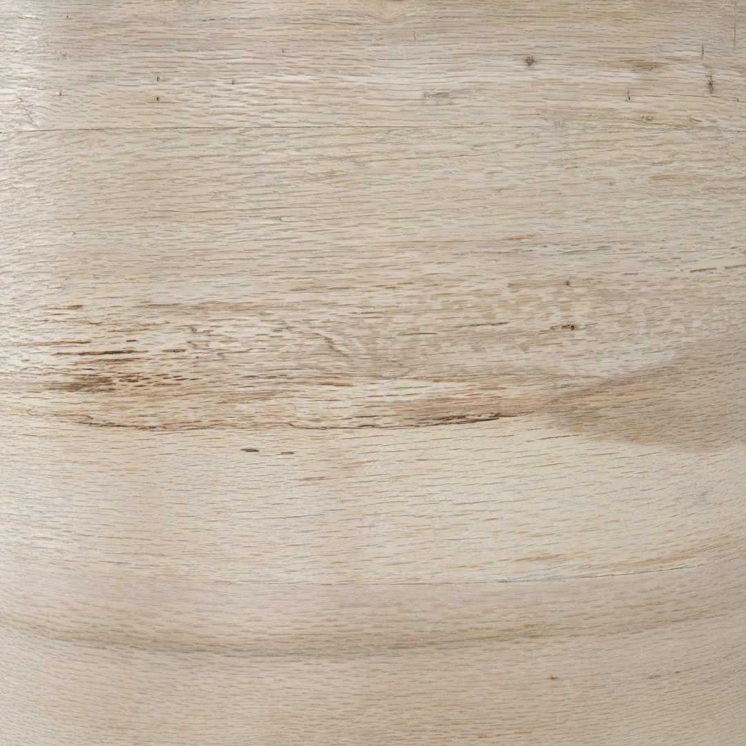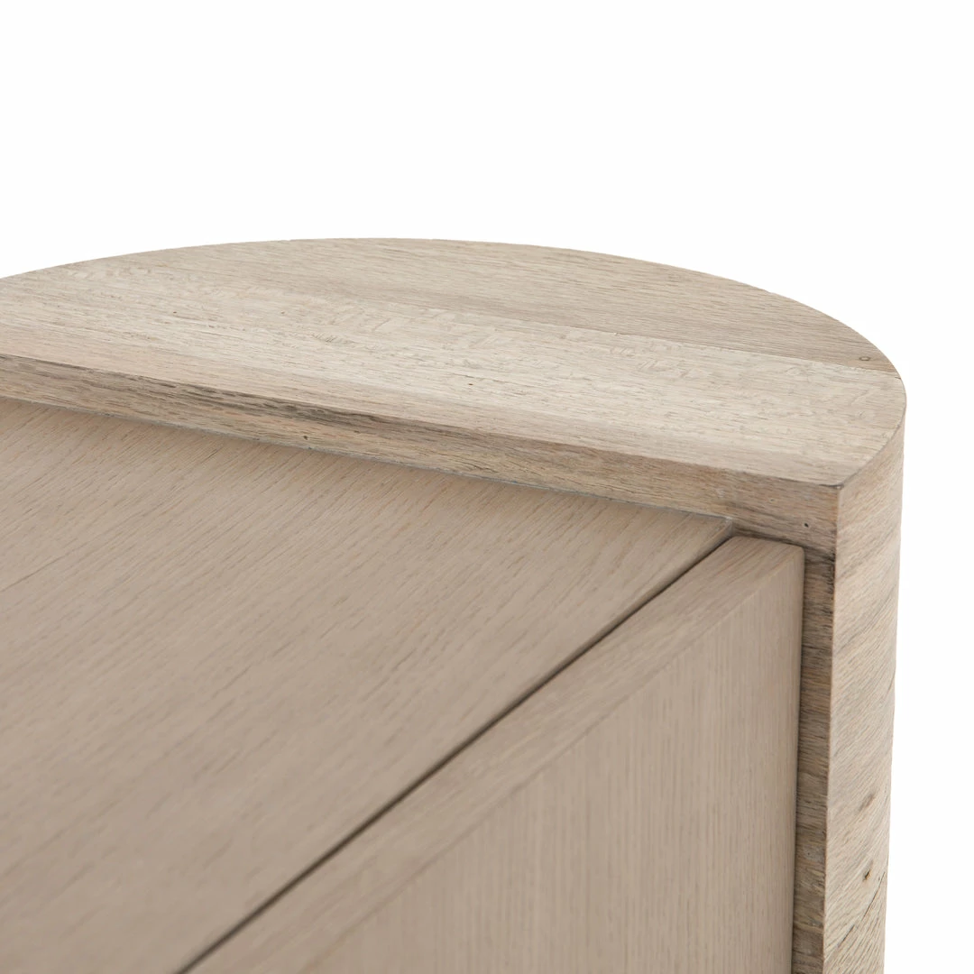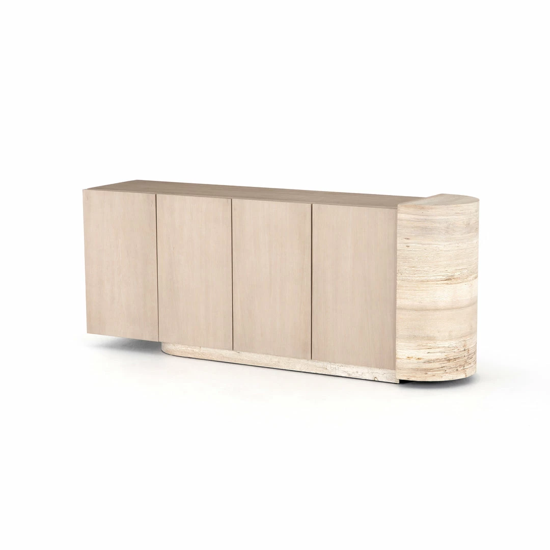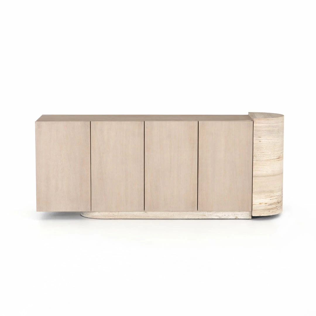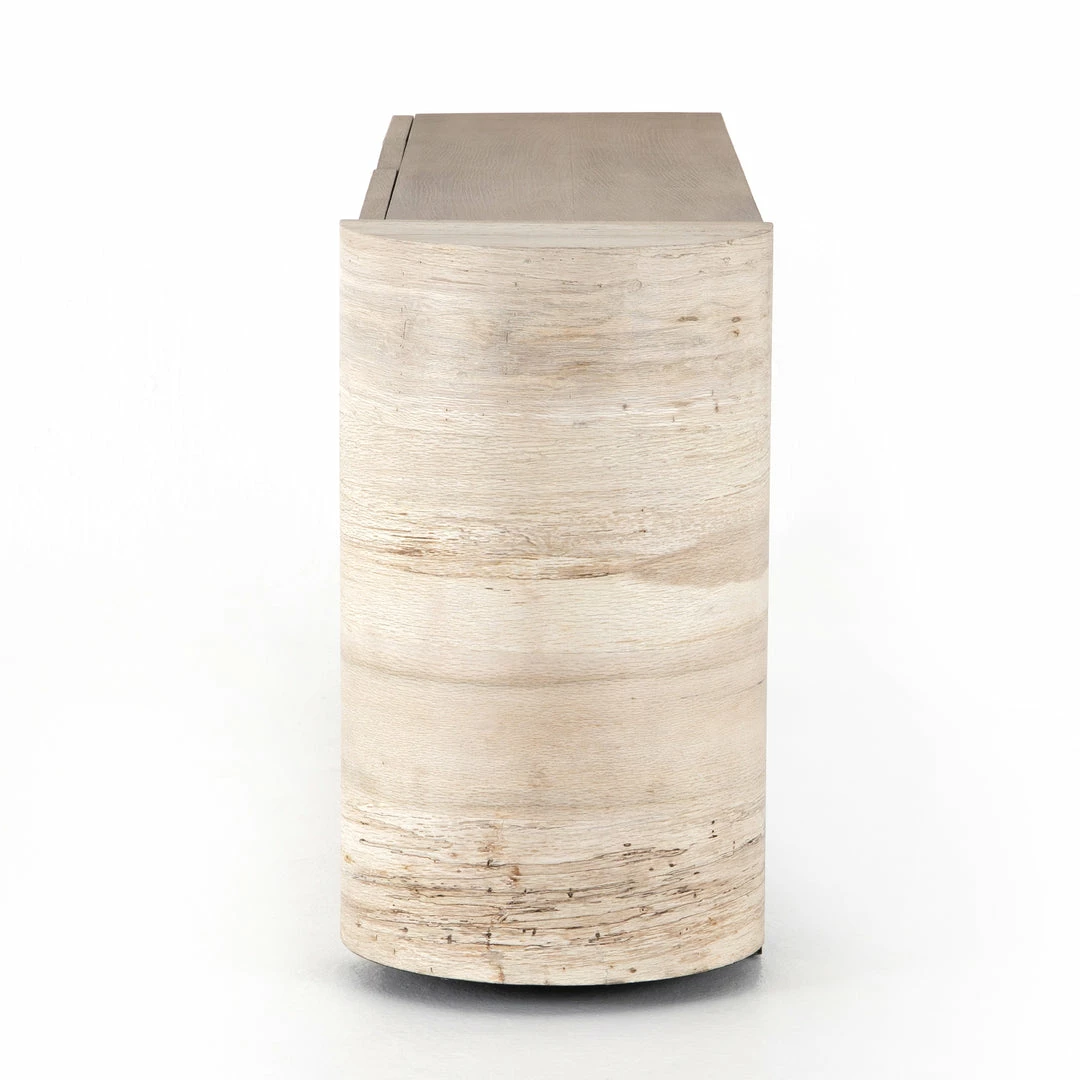 Organic in tone, sculptural in spirit. Inspired by bold Eighties-era design, a raised half-cylinder pedestal and curved plinth-style base of bleached spalted oak flanks one side of this imaginative sideboard, lending asymmetric intrigue to pale oak veneer casing. Push-latch doors open to partitioned spaces offering plenty of interior storage with removable adjustable shelves, plus rear cutouts for cord management.