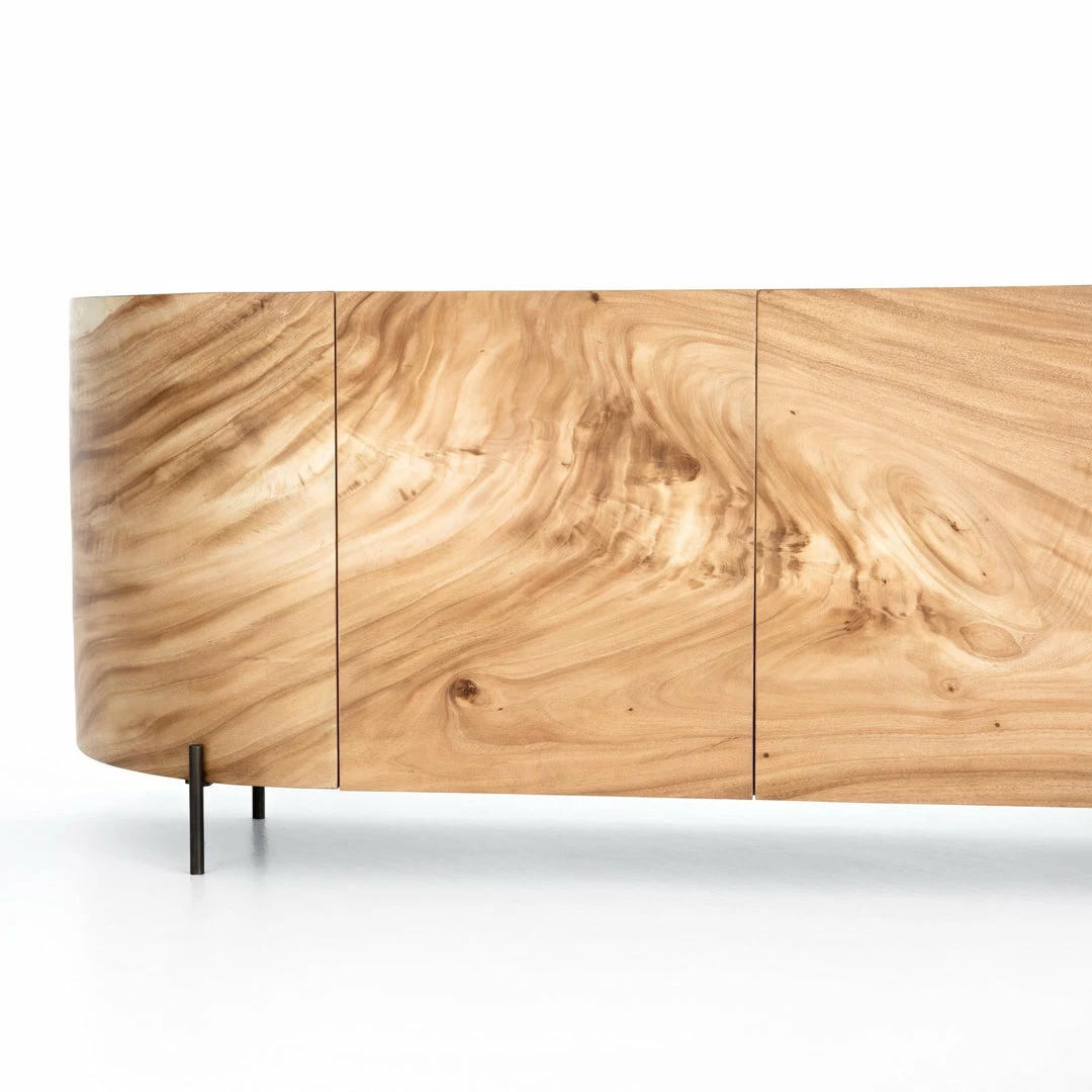 With soft shaping and inset top inspired by classic jewelry setting, gold Guanacaste forms a beautifully sculpted silhouette, with natural high and lowlights coursing the entirety of this richly styled sideboard.