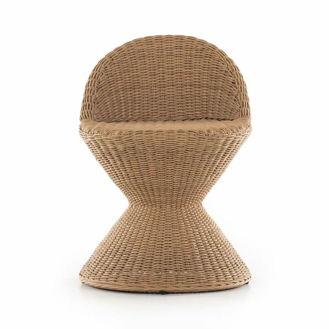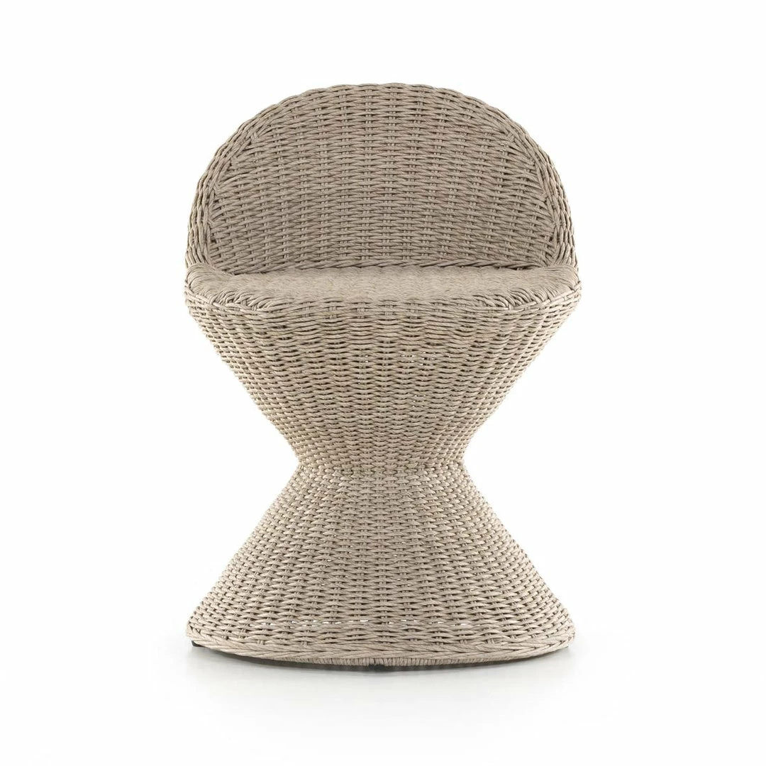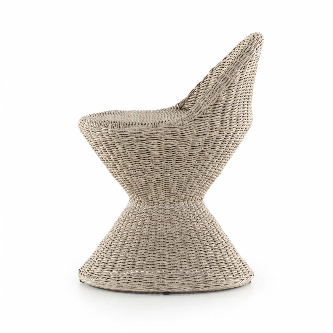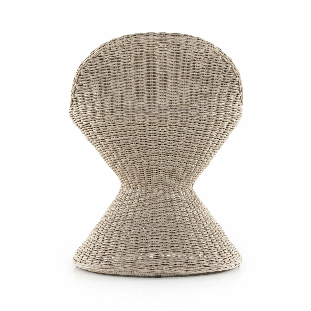 Inspired by a 1970s Russell Woodward design, this striking outdoor dining chair features a tight all-weather wicker weave in an hourglass shape. A low back brings a modern update to this classic design. Cover or store inside during inclement weather and when not in use.