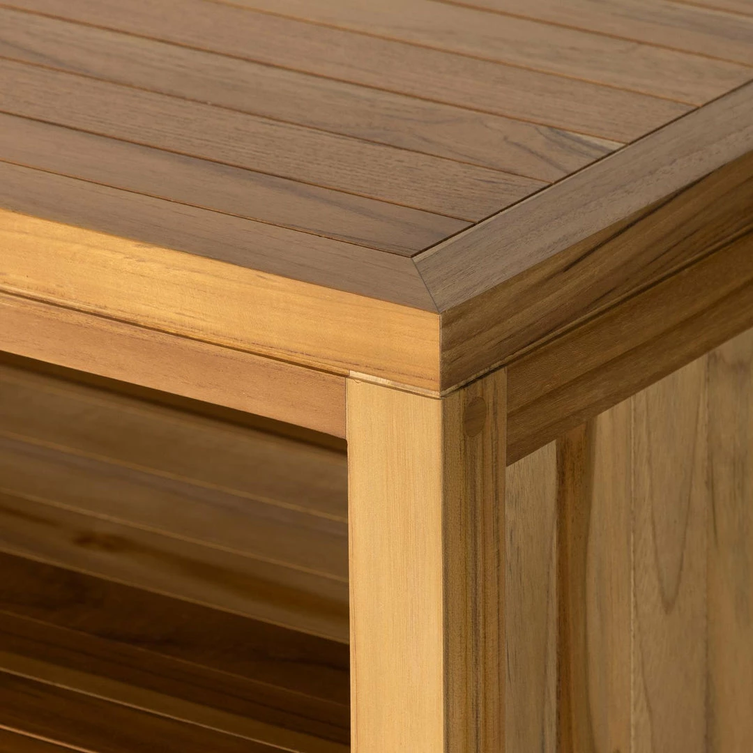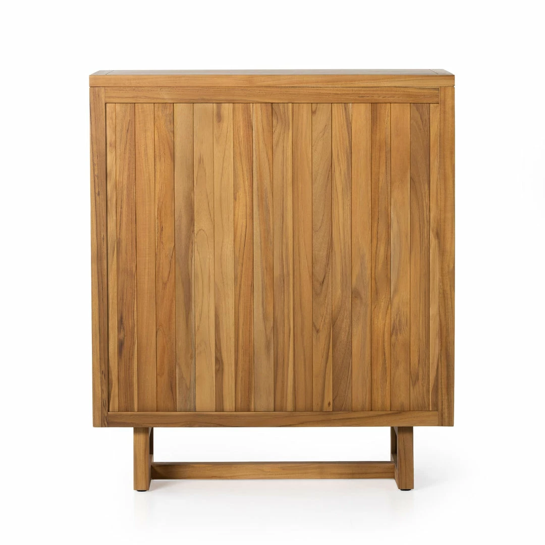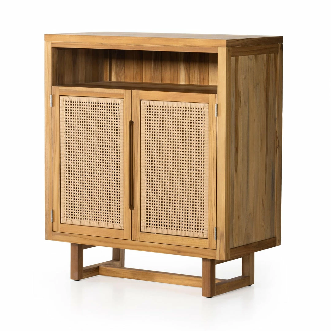 The cane trend moves outdoors. FSC-certified teak frame is detailed with rattan-inspired woven panels for a breezy, crafted minimalism take on the outdoor cabinet. Includes removable inner shelf. Cover or store indoors during inclement weather and when not in use.