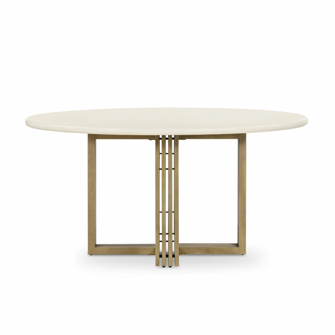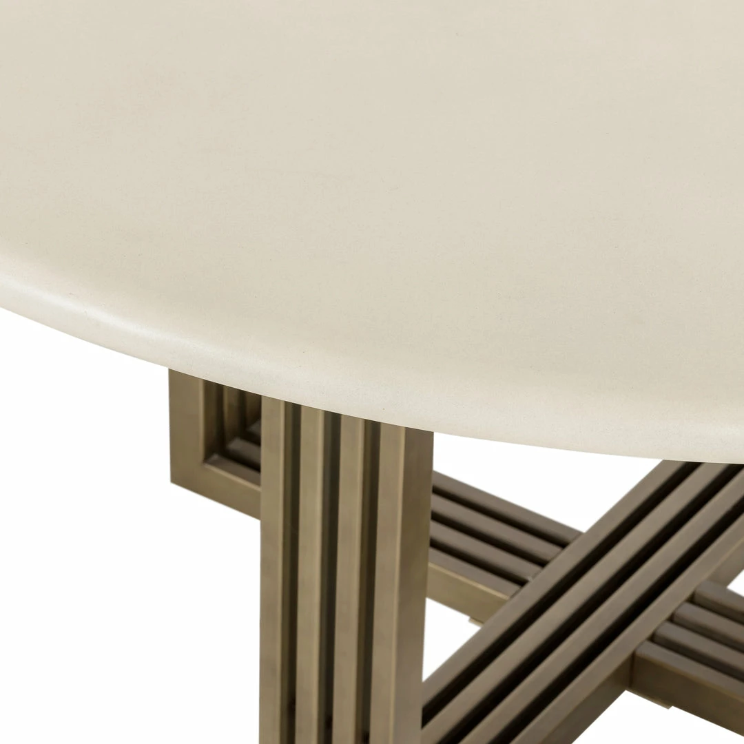 Bring a noble sense to the table. Banded legs of brass-finished steel support a rounded tabletop, as a high-gloss sheen enhances the natural texture and tone of white concrete.