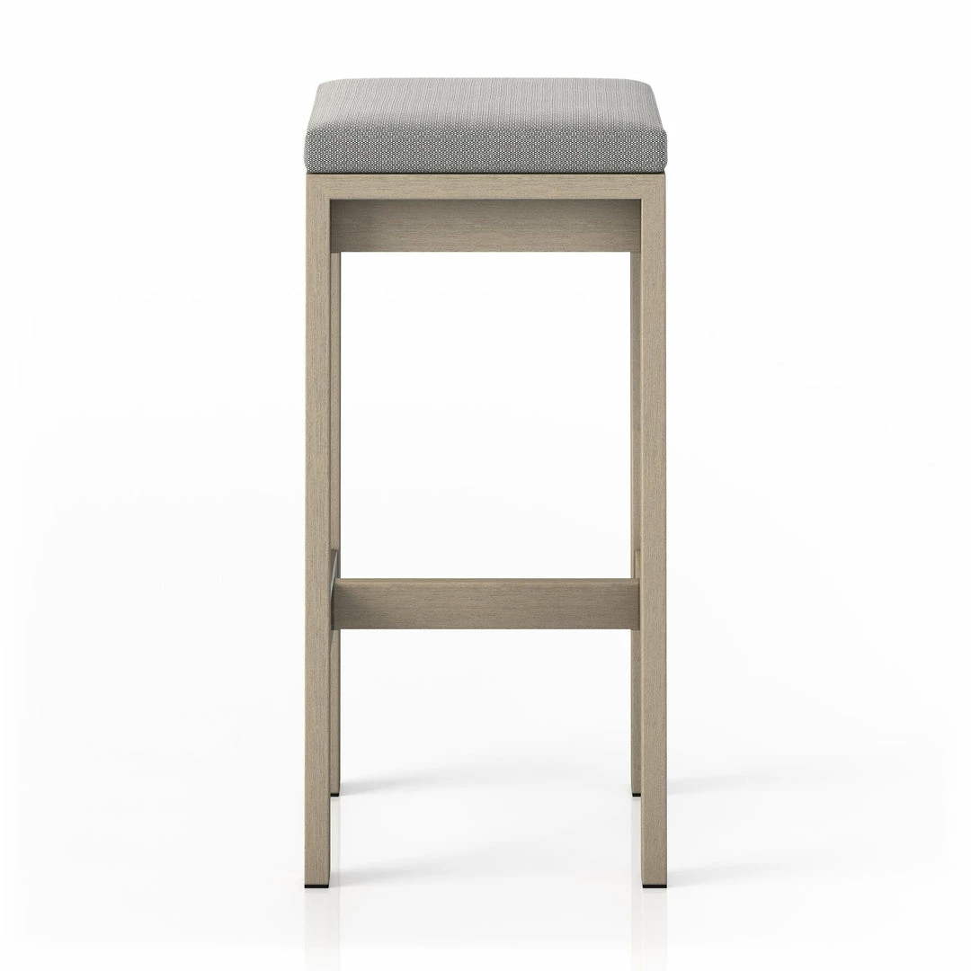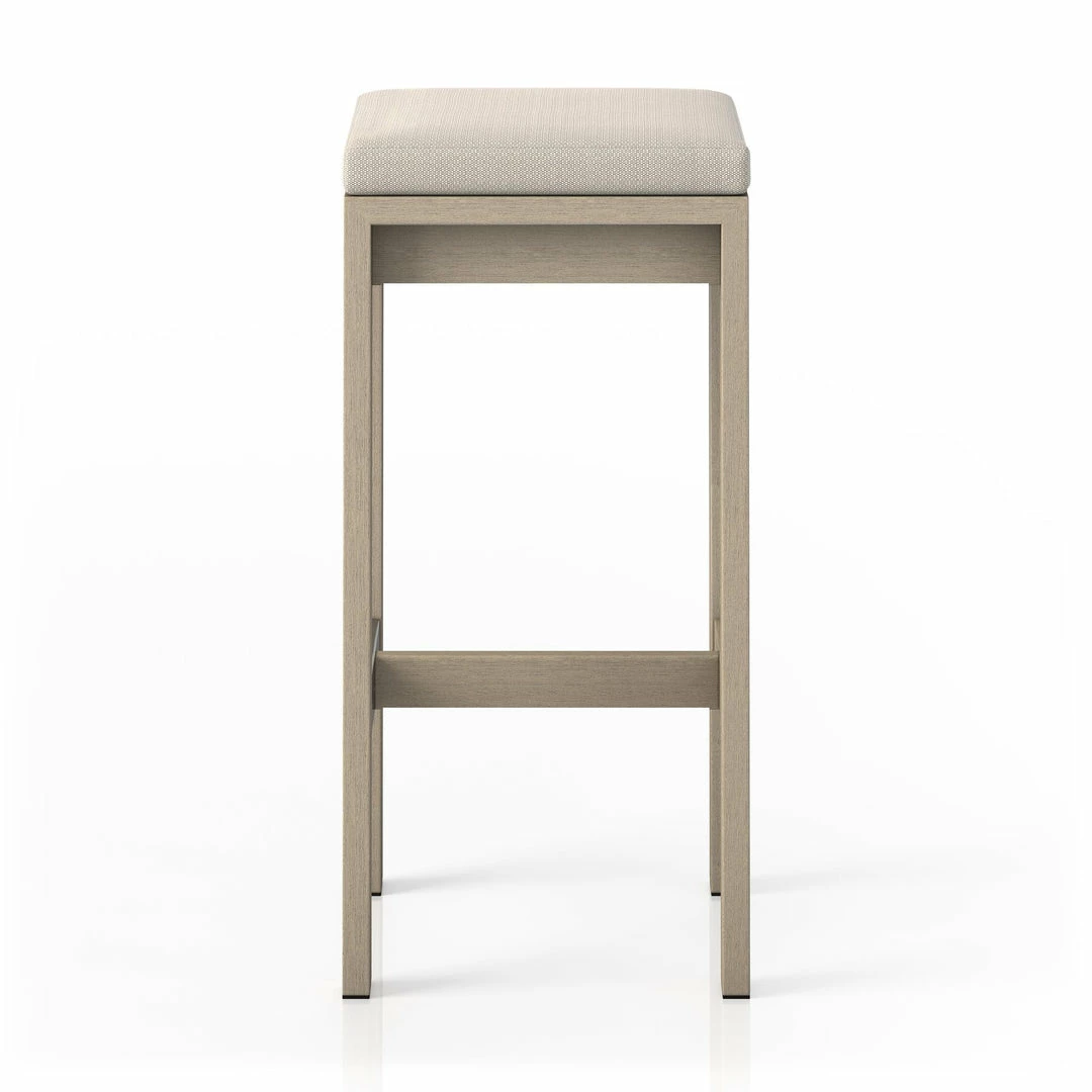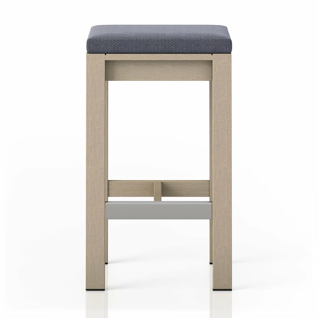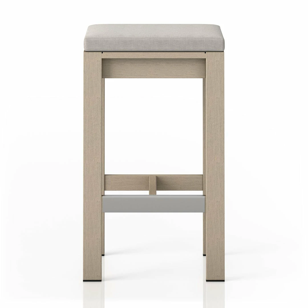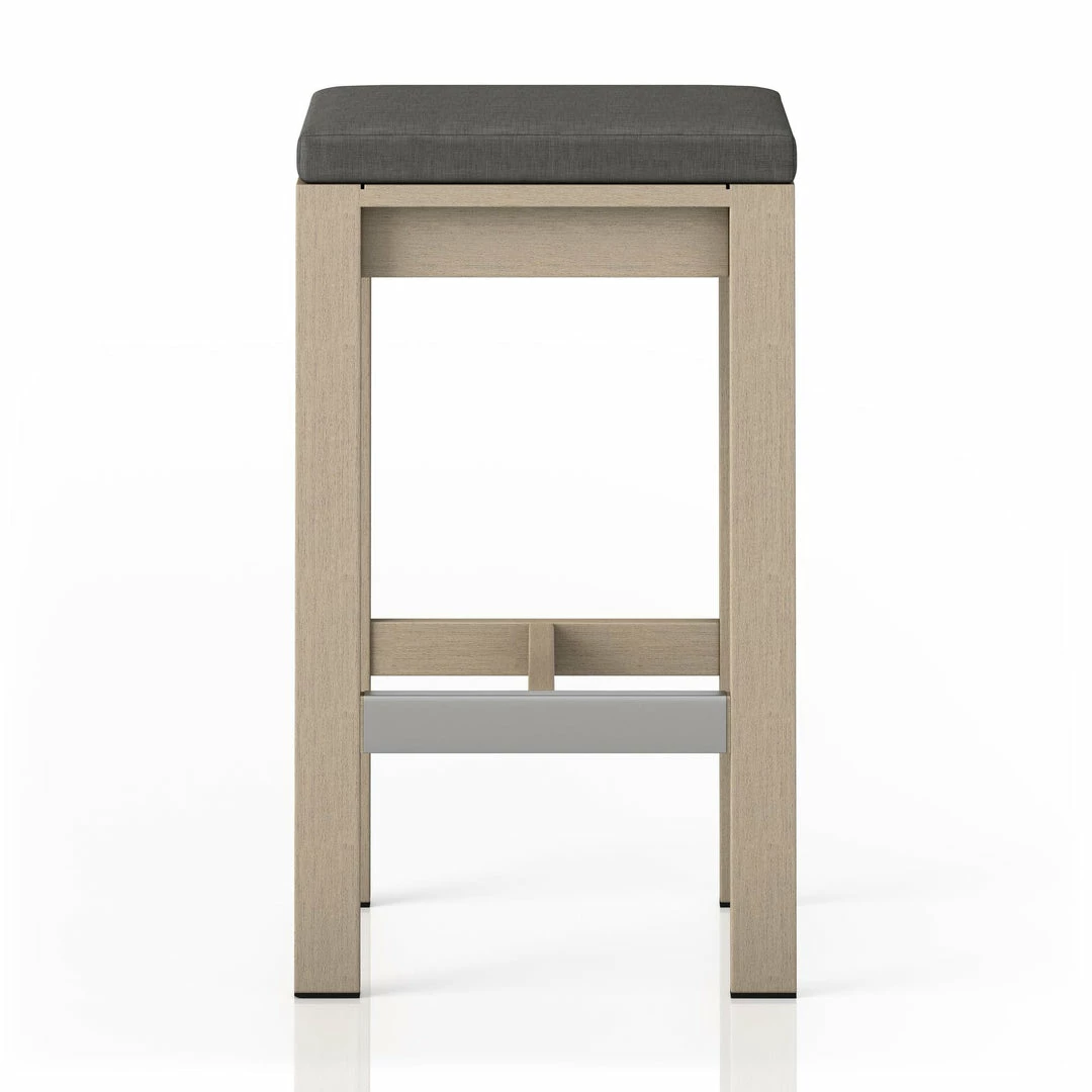 Architectural lines bring modern minimalism to this outdoor suite. Solid FSC-certified teak forms the classic, clean frame of this outdoor bar stool. Its slatted seat is topped with a plush cushion in a UV-resistant, water-repellent, quick-drying fabric. Finished with a stainless steel kickplate. Cover or store indoors during inclement weather and when not in use.