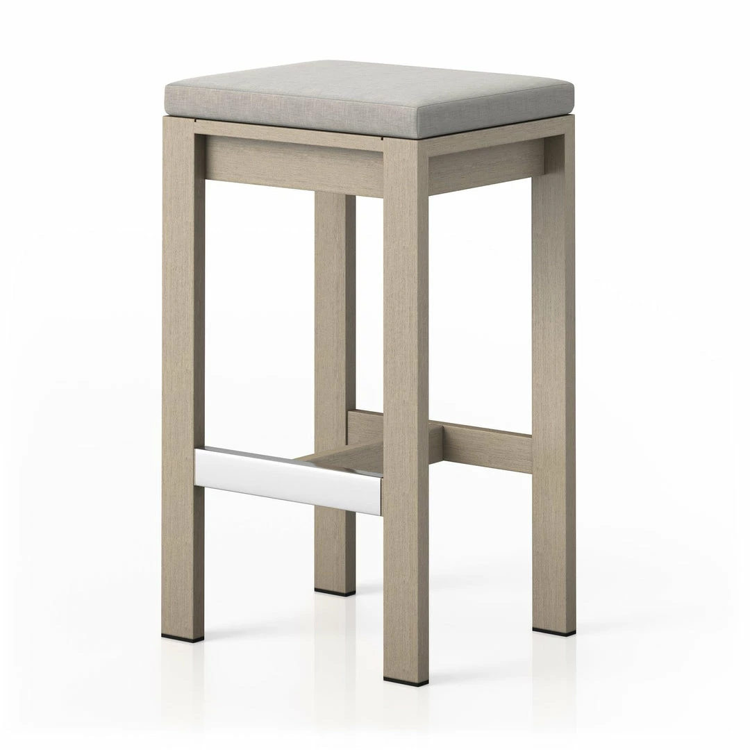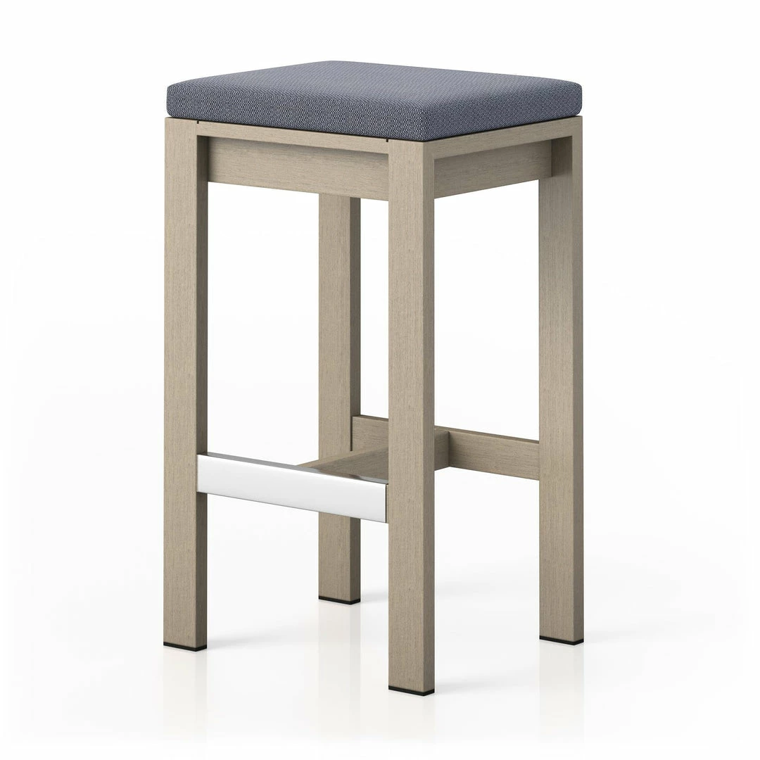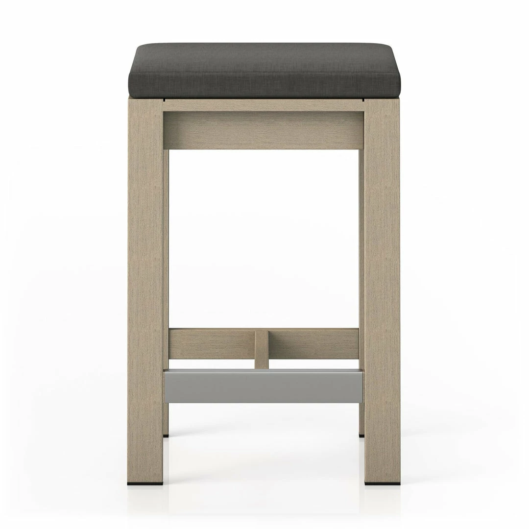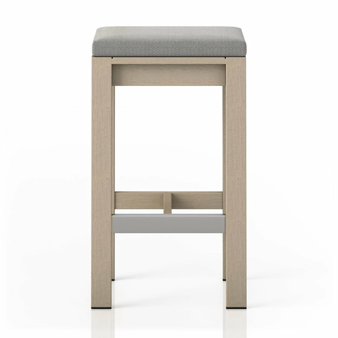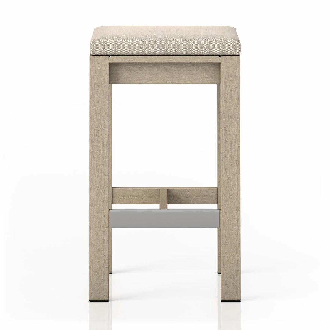 Architectural lines bring modern minimalism to this outdoor suite. Solid FSC-certified teak forms the classic, clean frame of this outdoor bar stool. Its slatted seat is topped with a plush cushion in a UV-resistant, water-repellent, quick-drying fabric. Finished with a stainless steel kickplate. Cover or store indoors during inclement weather and when not in use.