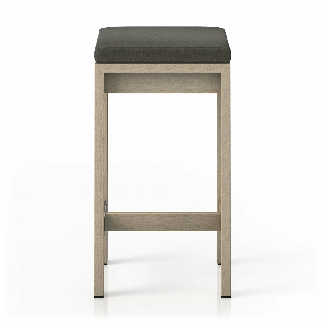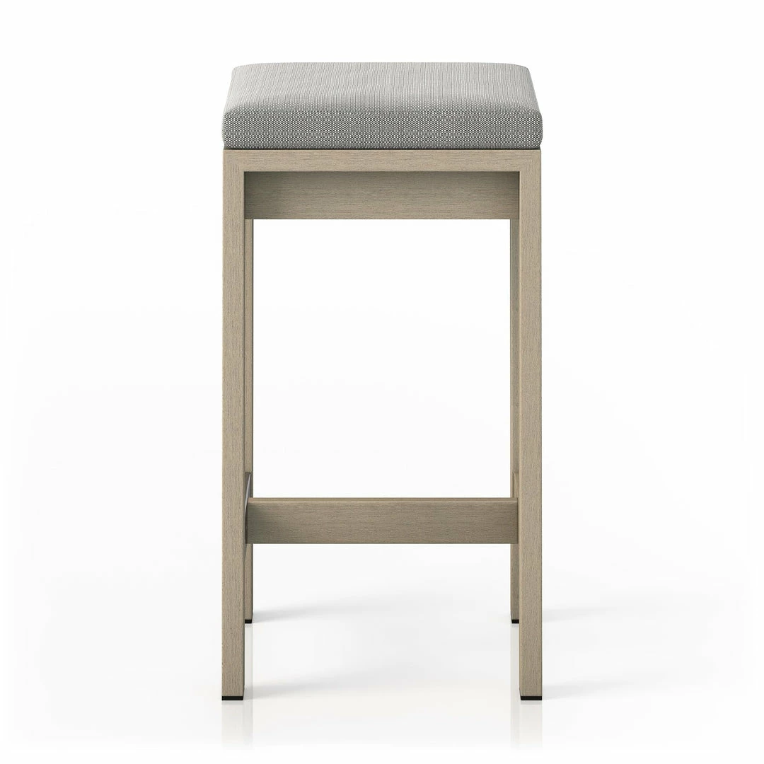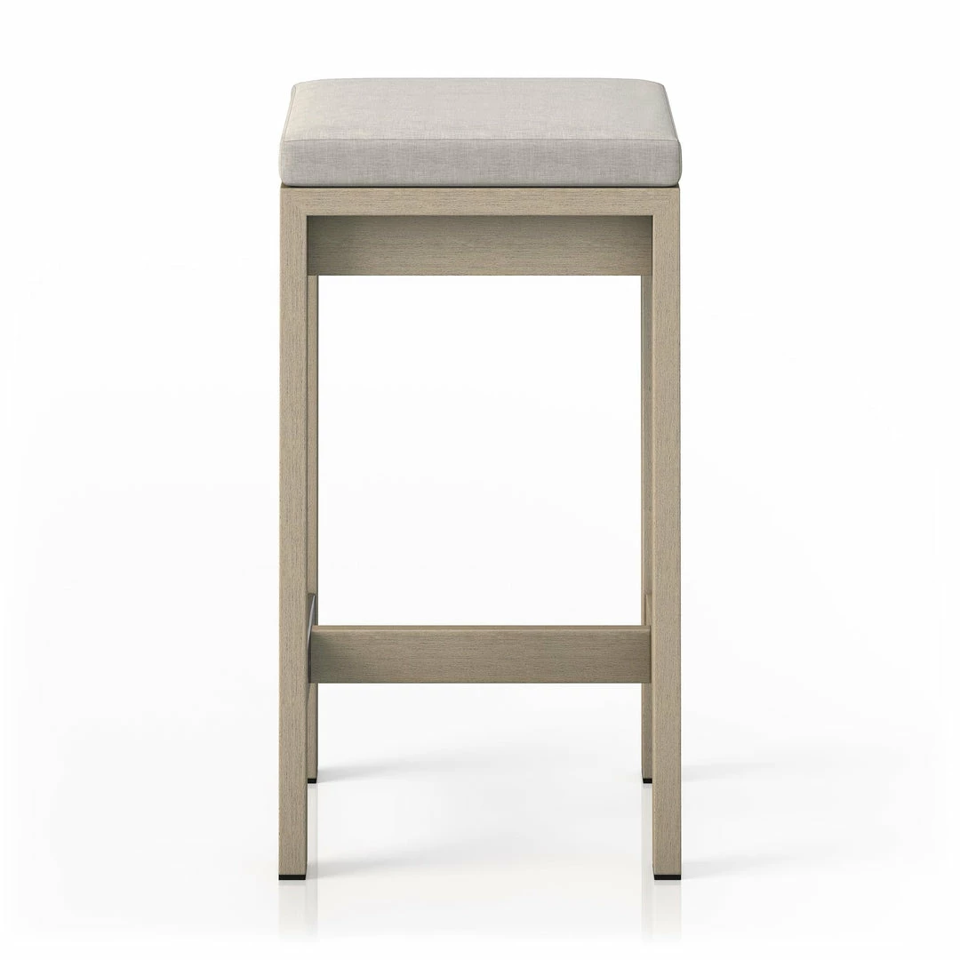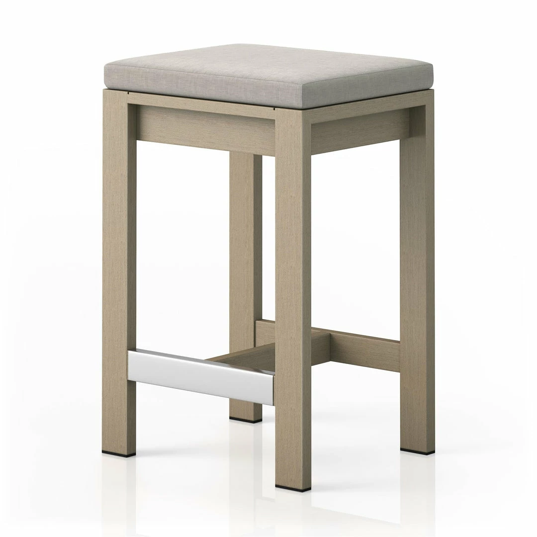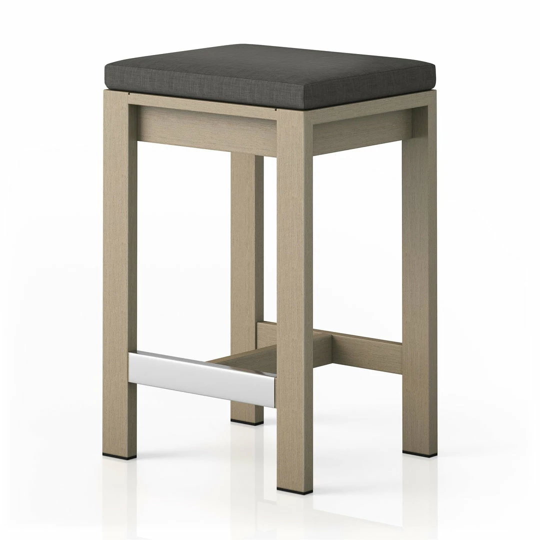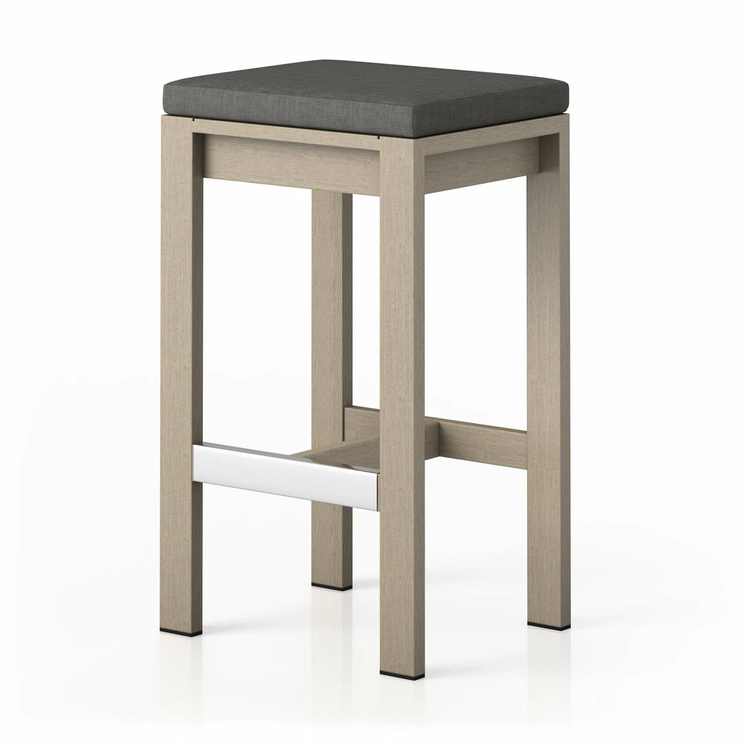 Architectural lines bring modern minimalism to this outdoor suite. Solid FSC-certified teak forms the classic, clean frame of this outdoor bar stool. Its slatted seat is topped with a plush cushion in a UV-resistant, water-repellent, quick-drying fabric. Finished with a stainless steel kickplate. Cover or store indoors during inclement weather and when not in use.