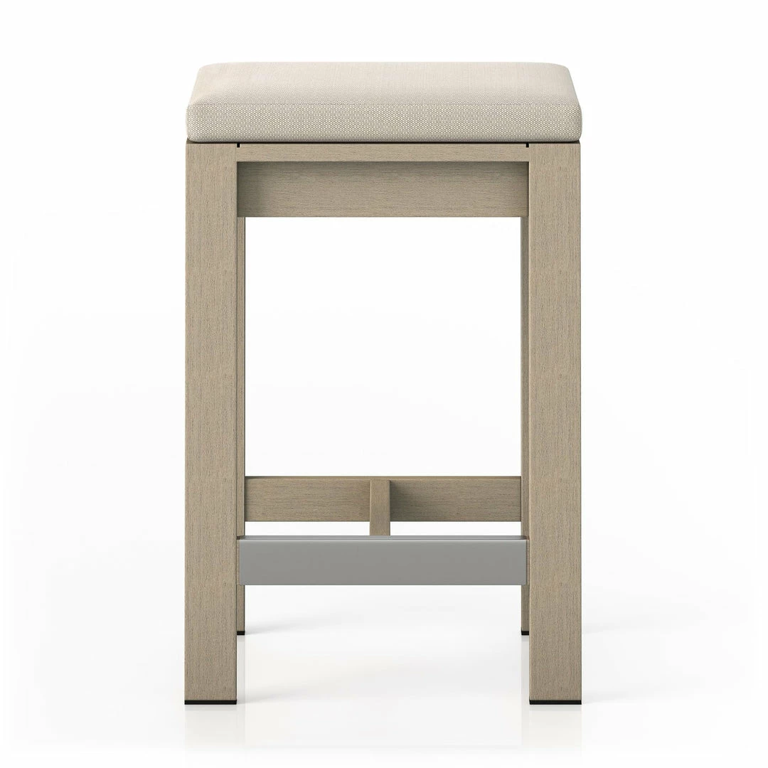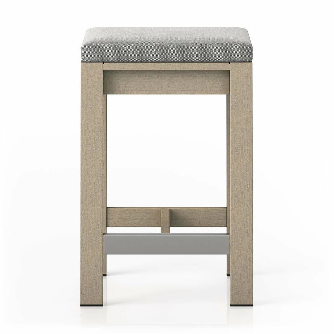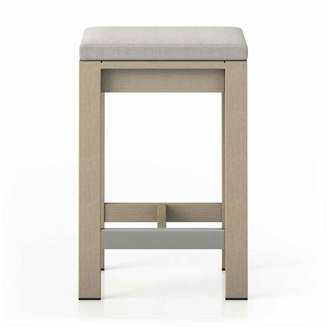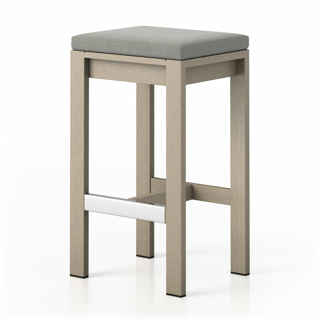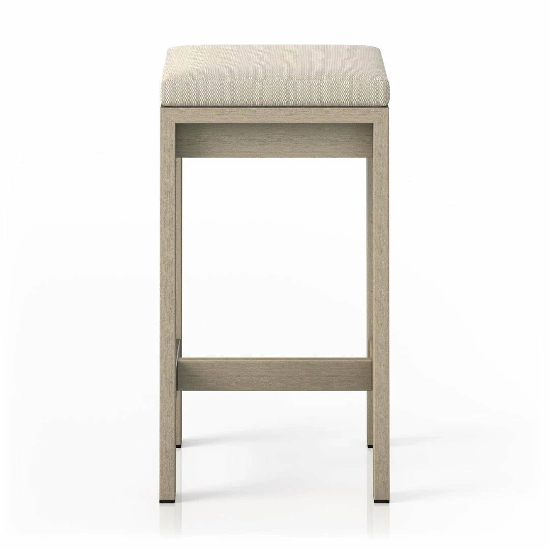 Architectural lines bring modern minimalism to this outdoor suite. Solid FSC-certified teak forms the classic, clean frame of this outdoor bar stool. Its slatted seat is topped with a plush cushion in a UV-resistant, water-repellent, quick-drying fabric. Finished with a stainless steel kickplate. Cover or store indoors during inclement weather and when not in use.