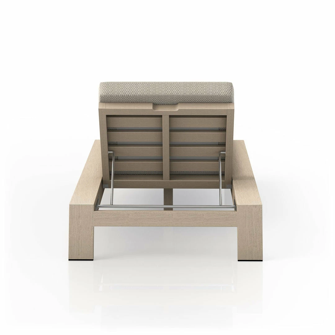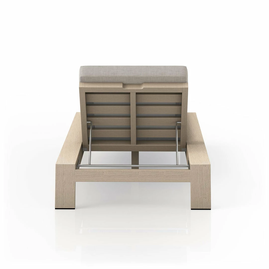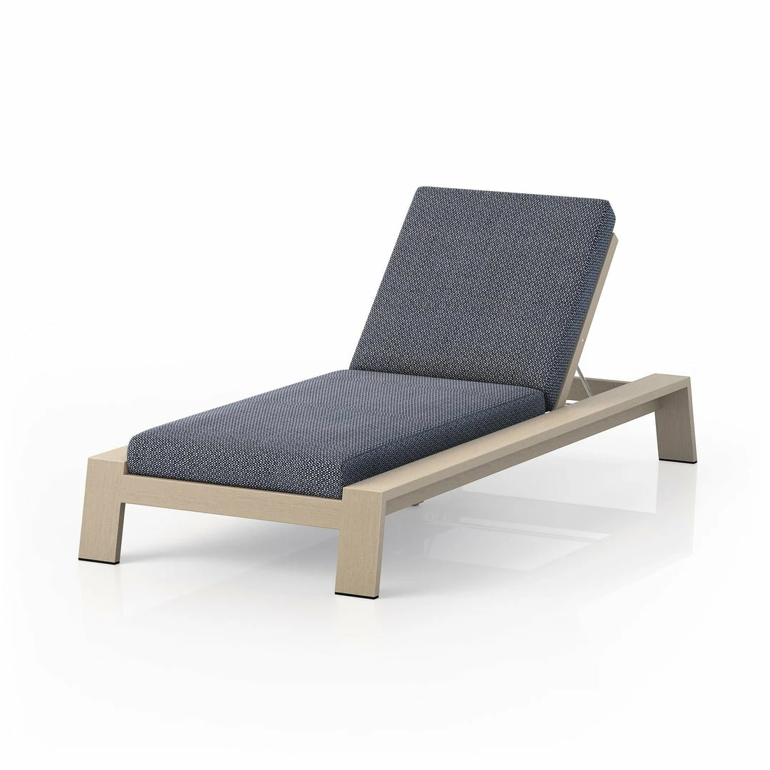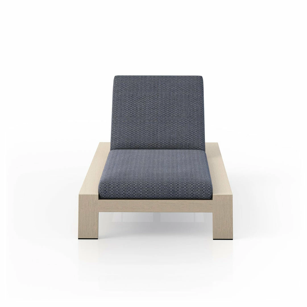 Architectural lines bring modern minimalism to this outdoor suite. Solid FSC-certified teak forms the wide, clean frame of this streamlined outdoor chaise. Wirebrushed and fully sealed in a finish designed to mimic the natural aging process of teak. Topped with plush cushioning in a UV-resistant, water-repellent quick-drying fabric. Cover or store indoors during inclement weather and when not in use.