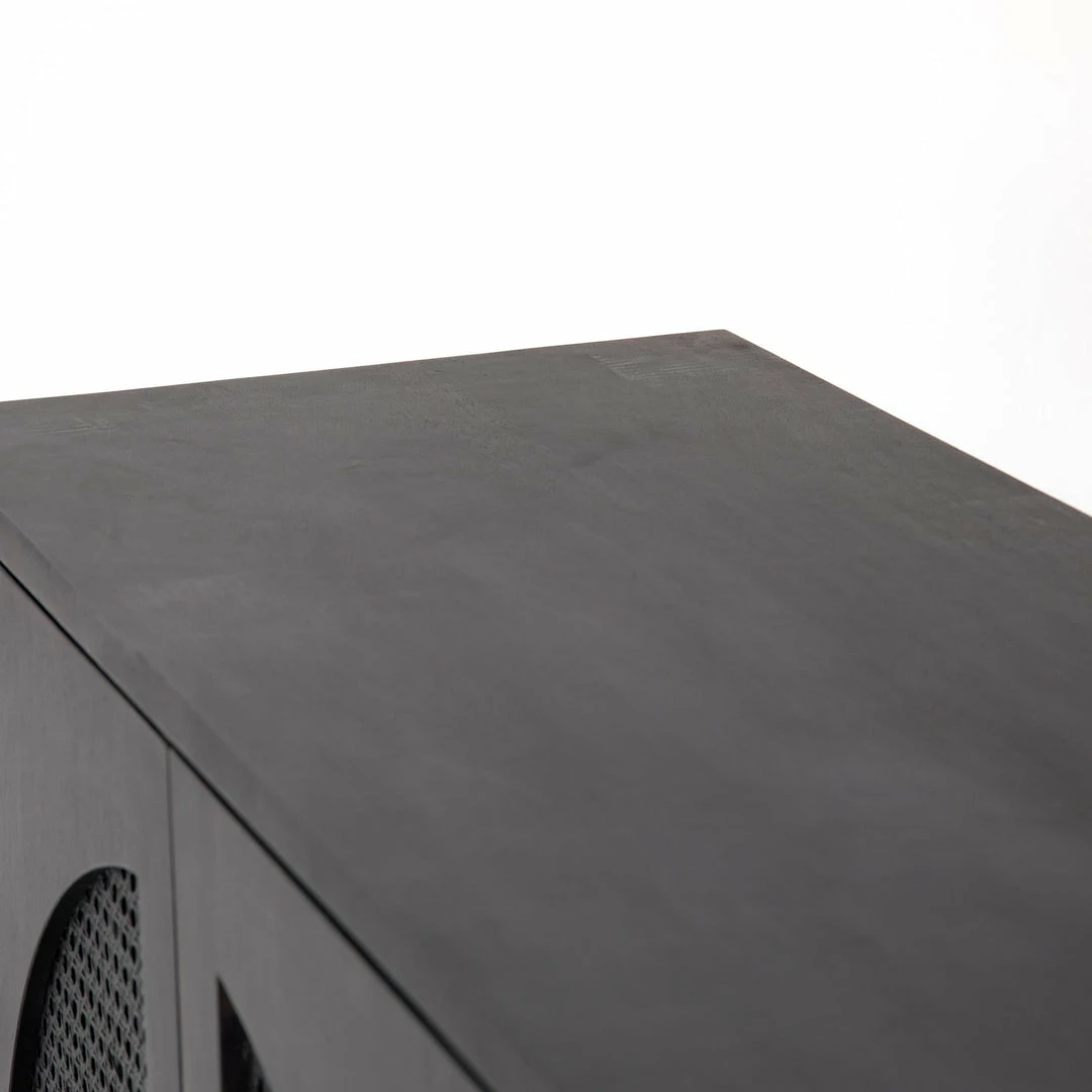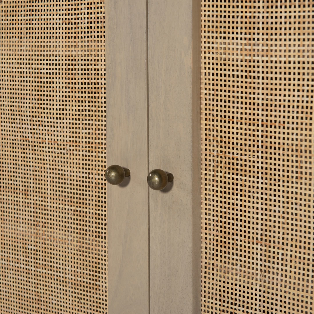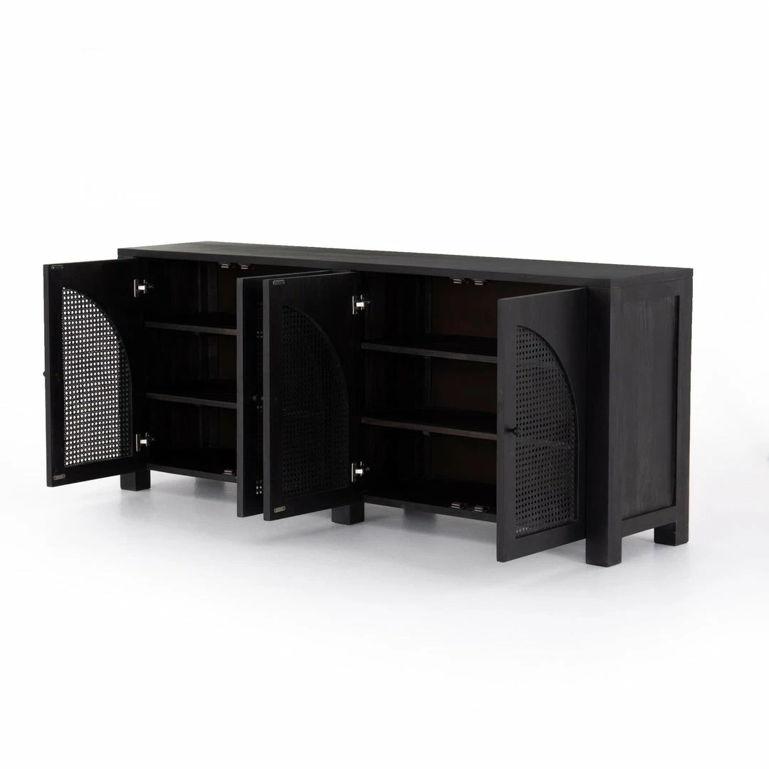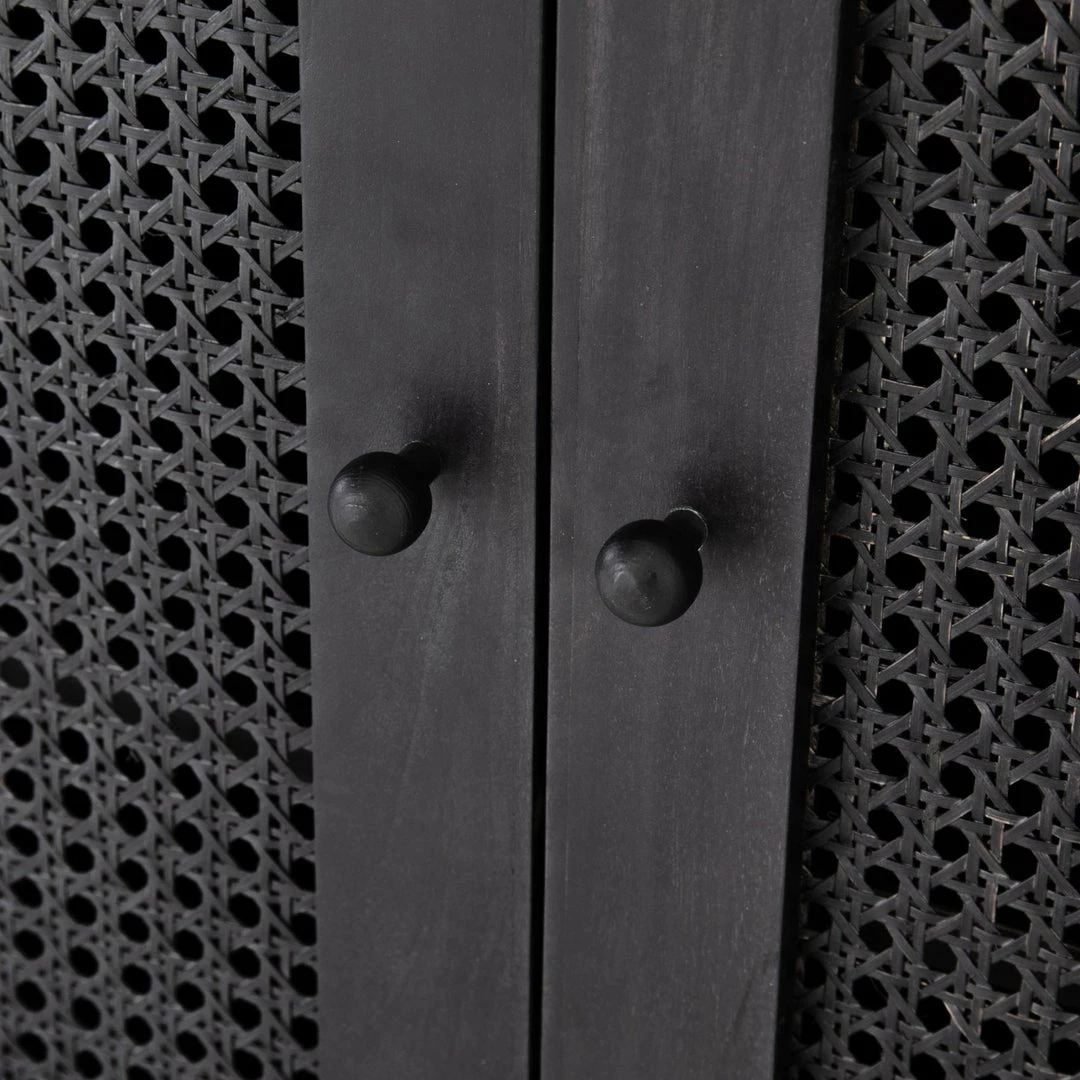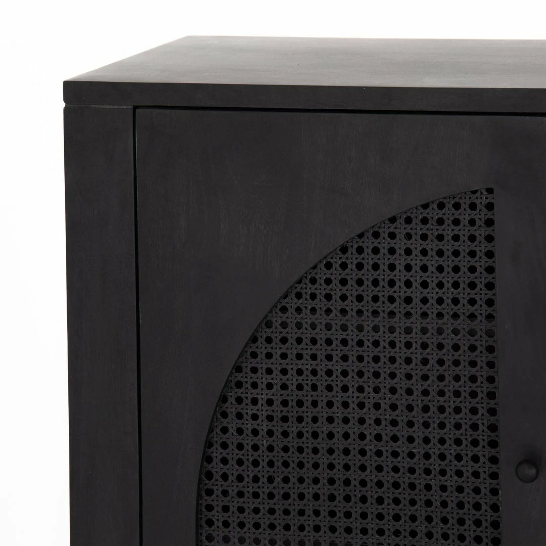 Grand in scale and presence. Black-washed mango encases arched cane door panels featuring black-finished iron hardware, meeting a forward-thinking material mix with monochromatic vibes.