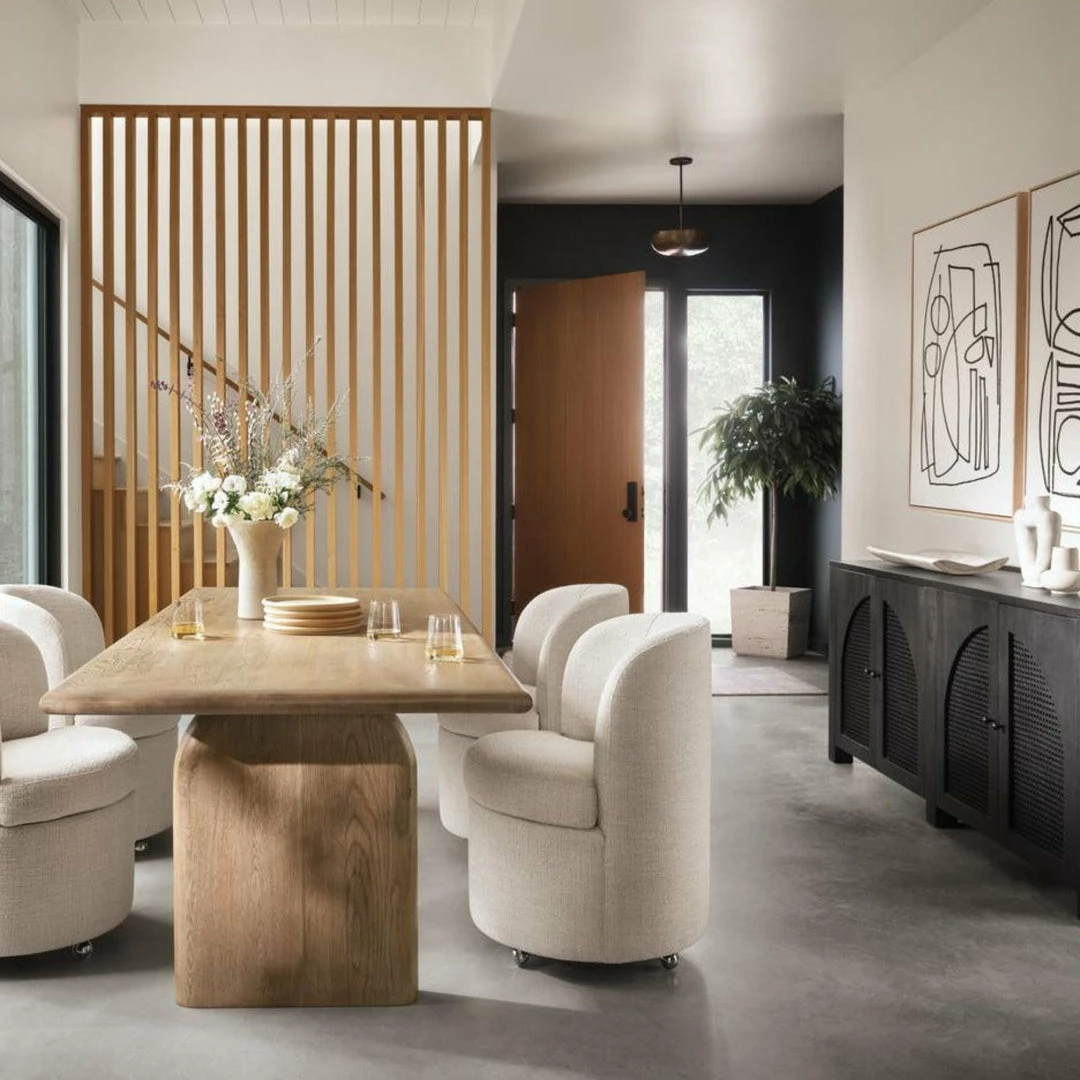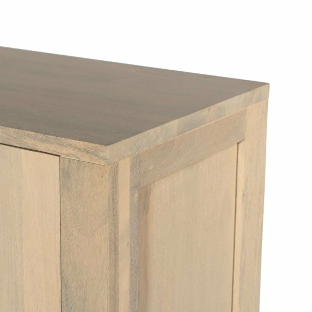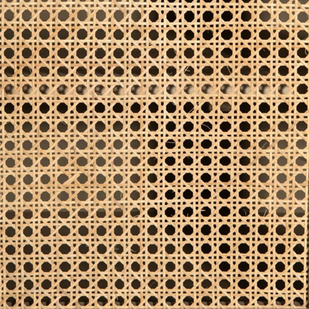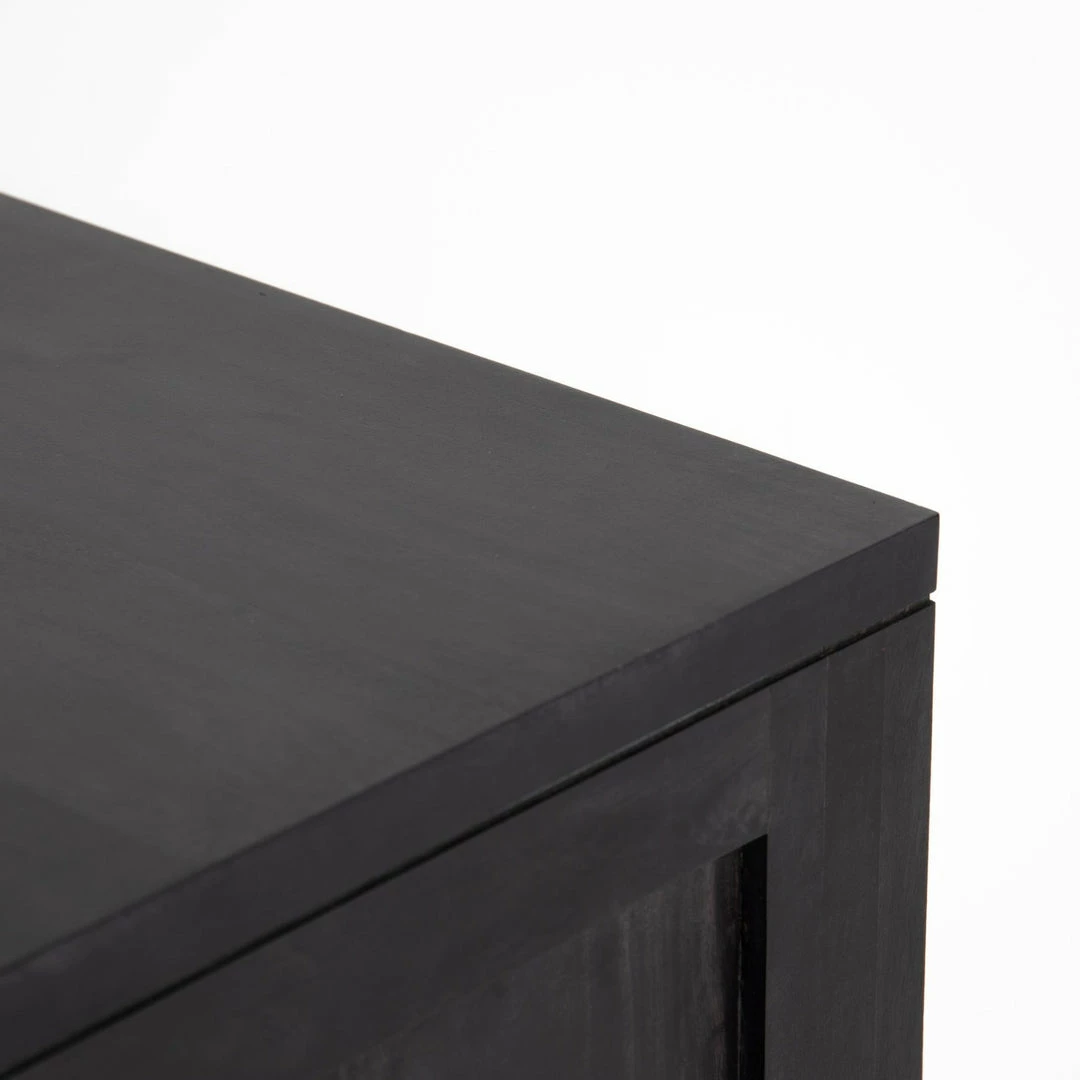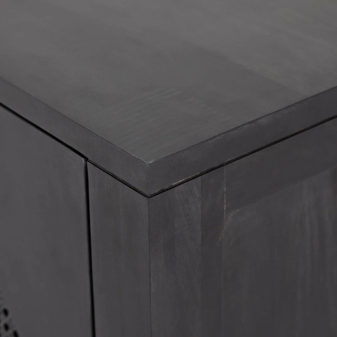 Grand in scale and presence. Black-washed mango encases arched cane door panels featuring black-finished iron hardware, meeting a forward-thinking material mix with monochromatic vibes.