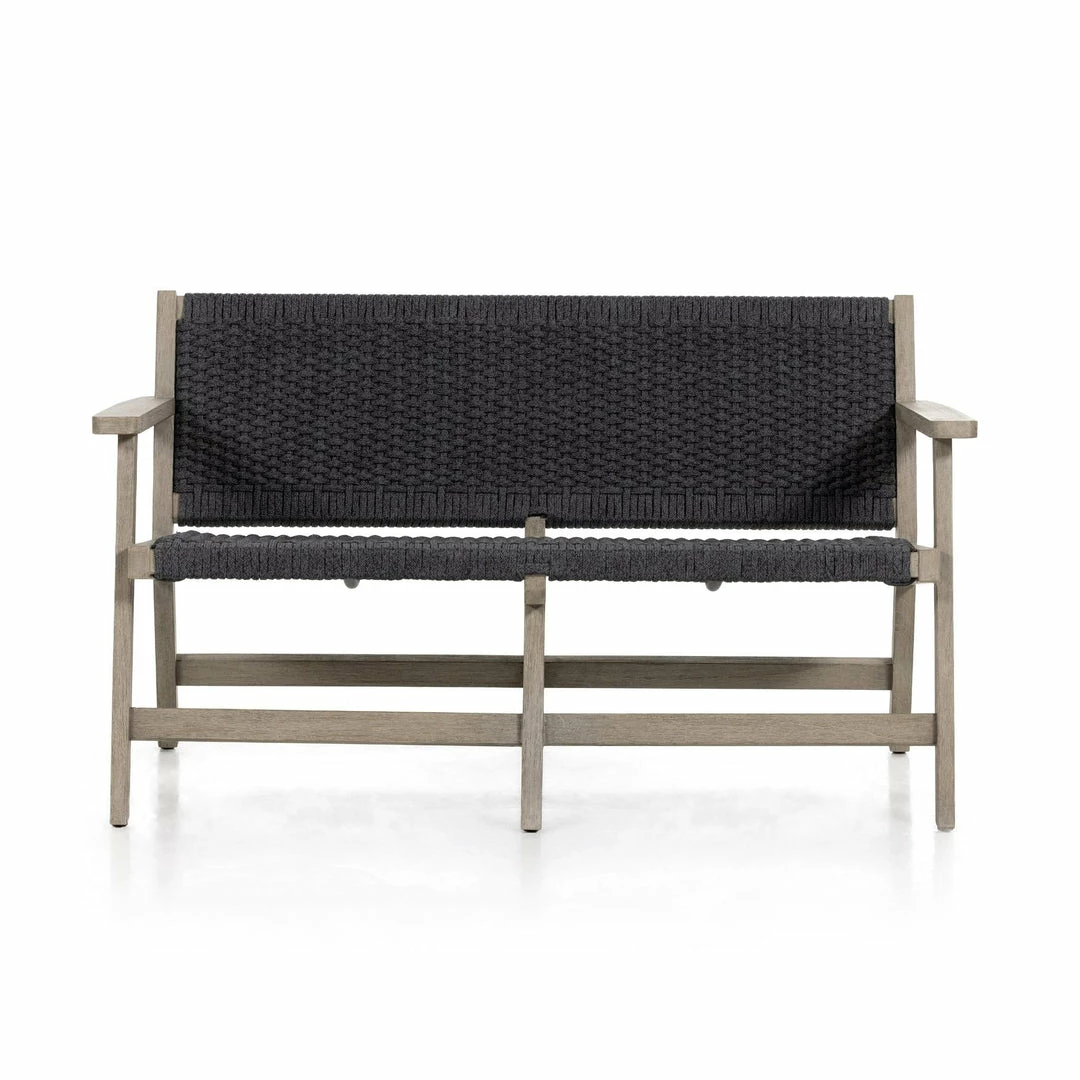 For a texture-driven take on the outdoor-friendly loveseat, brown-finished FSC-certified teak forms a beautifully simple frame for thick, handwoven rope in an inviting light grey. Cover or store indoors during inclement weather and when not in use.