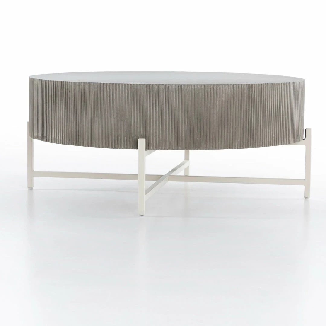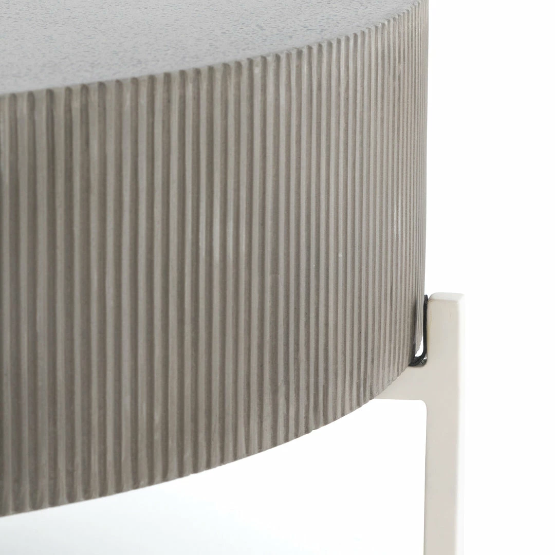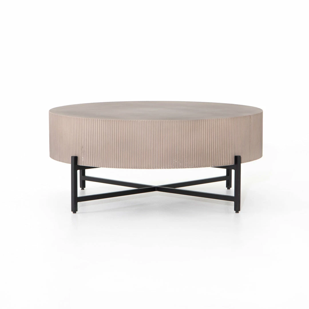 Side reeding lends texture to a rounded coffee table of ribbed concrete, while low, black steel framing spurs an intriguing juxtaposition of scale. Cover or store inside during inclement weather and when not in use.