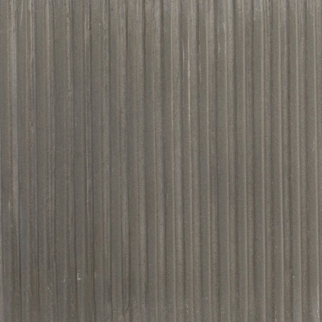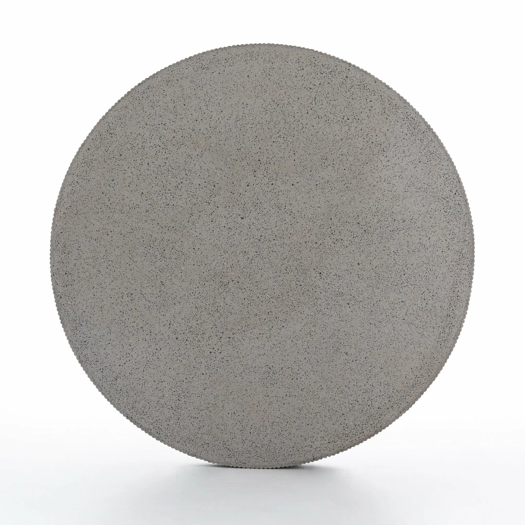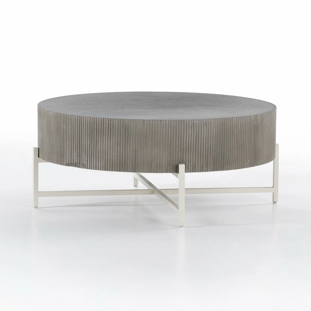 Side reeding lends texture to a rounded coffee table of ribbed concrete, while low, black steel framing spurs an intriguing juxtaposition of scale. Cover or store inside during inclement weather and when not in use.