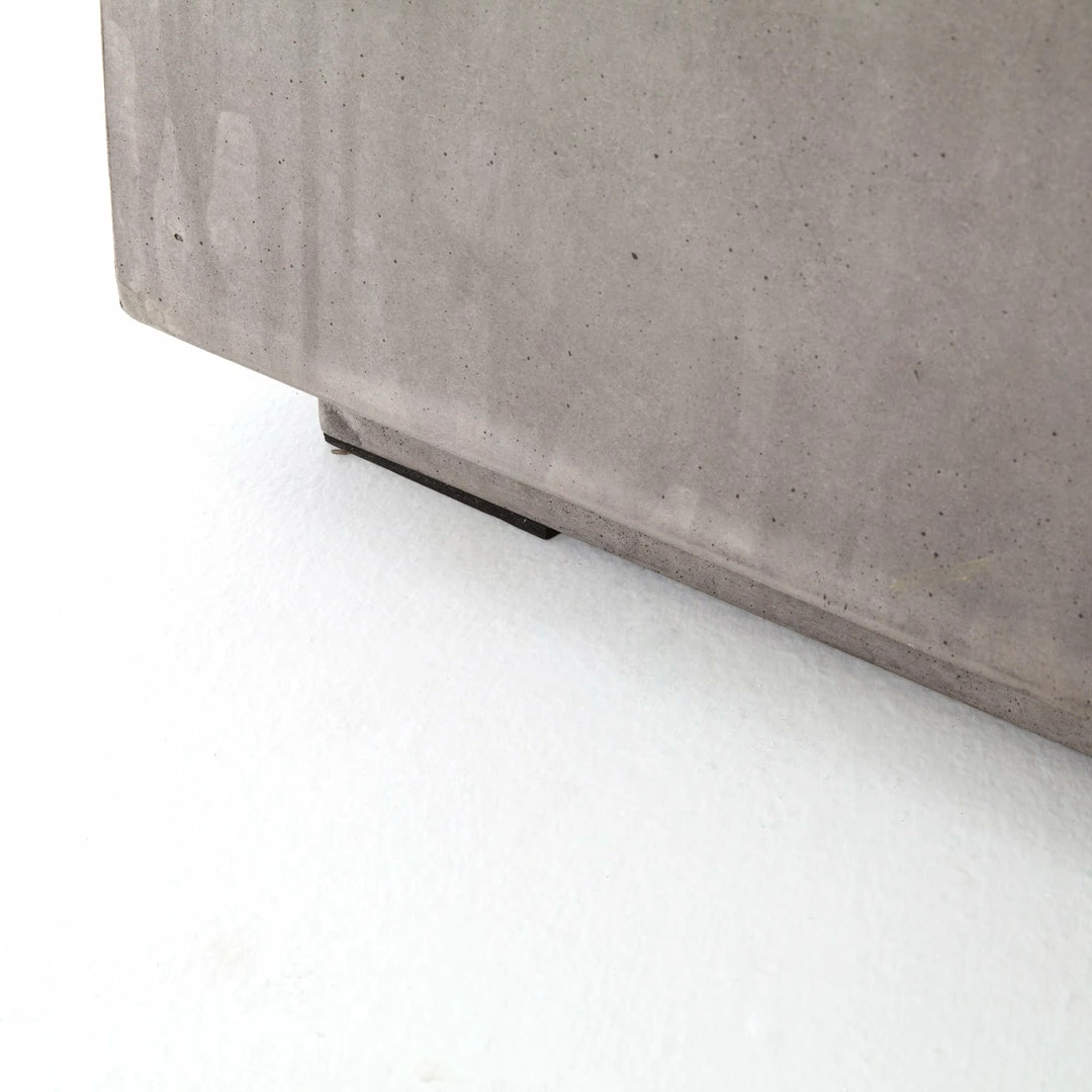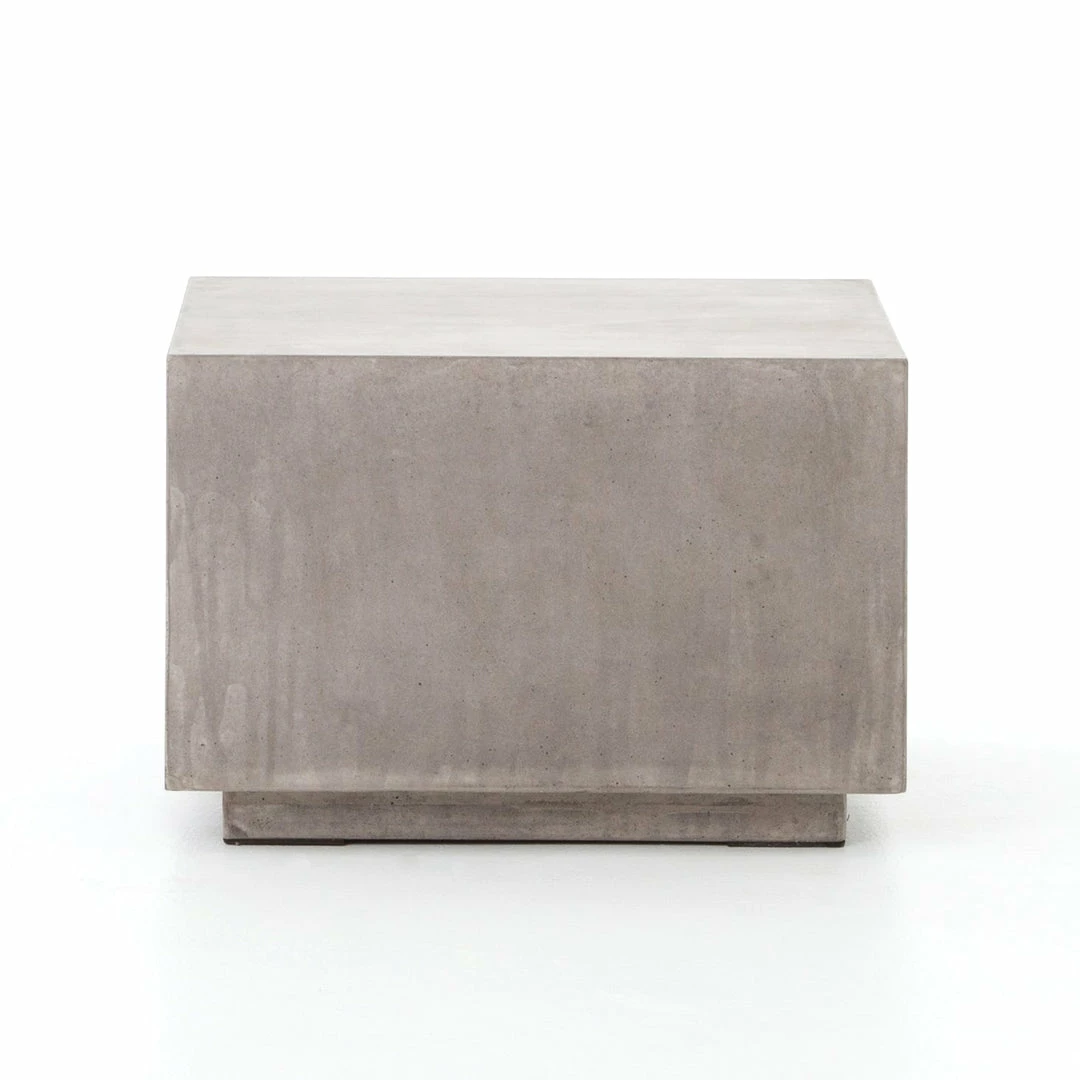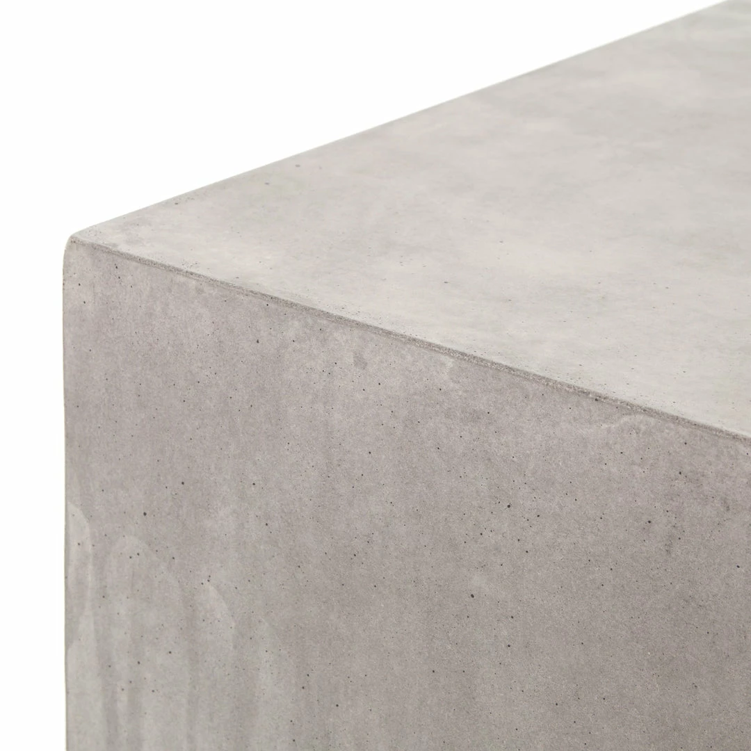 Industrial materials in smoothly refined shapes. Dark grey concrete forms a cubed coffee, side, or bunching table. Made for indoor or outdoor spaces— cover or store indoors during inclement weather and when not in use.