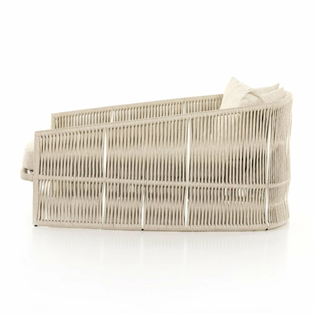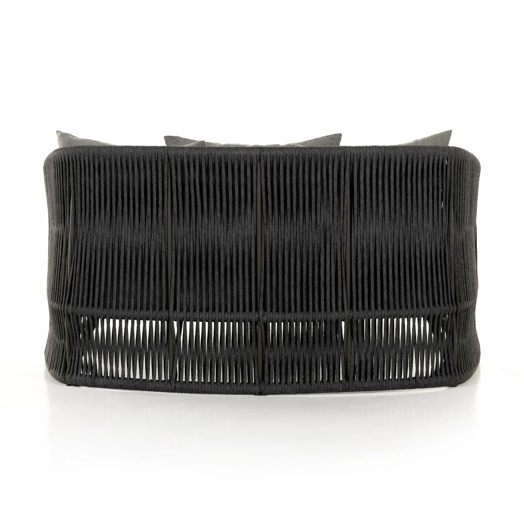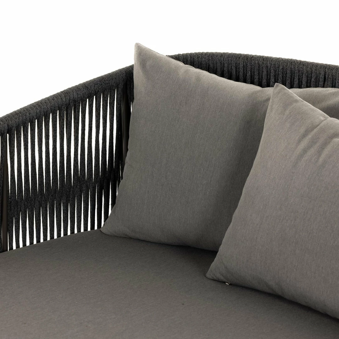 The perfect place for outdoor daydreaming. A beautiful rope-based design is woven across a durable aluminum frame in a rich bronze finish. Topped with a wide cushion and throw pillows, all upholstered in 100% Olefin, known for its UV-resistant, water-repellent and quick-drying abilities. Cover or store inside during inclement weather and when not in use.