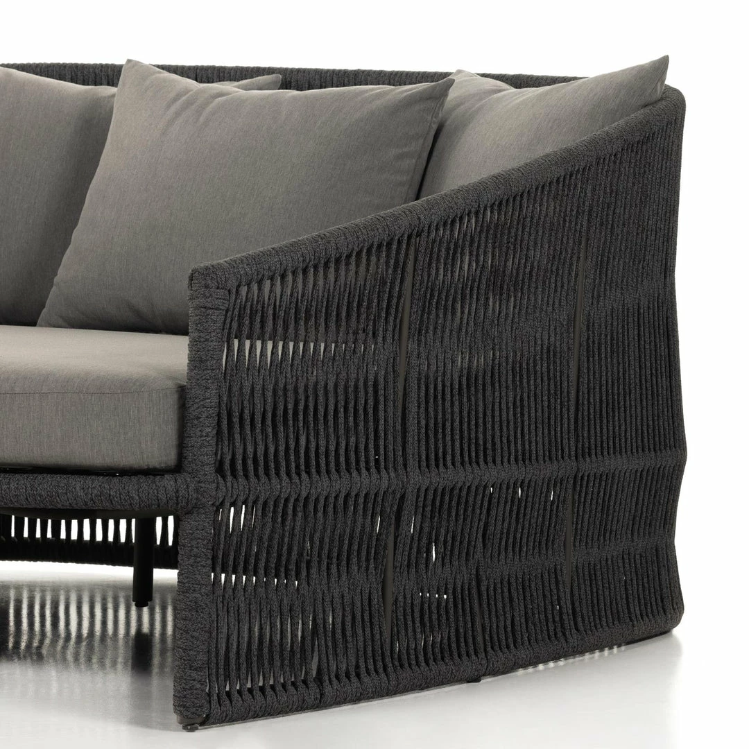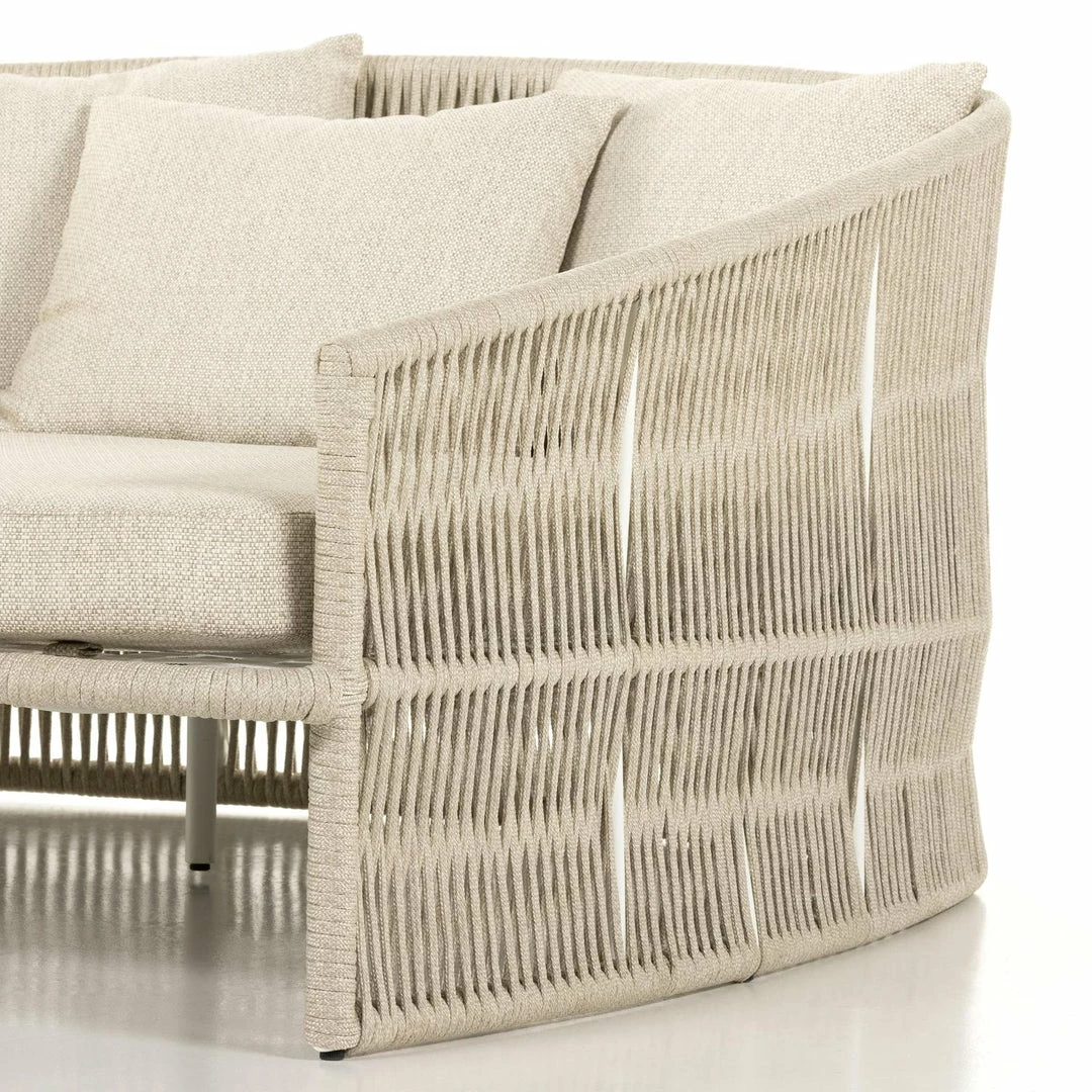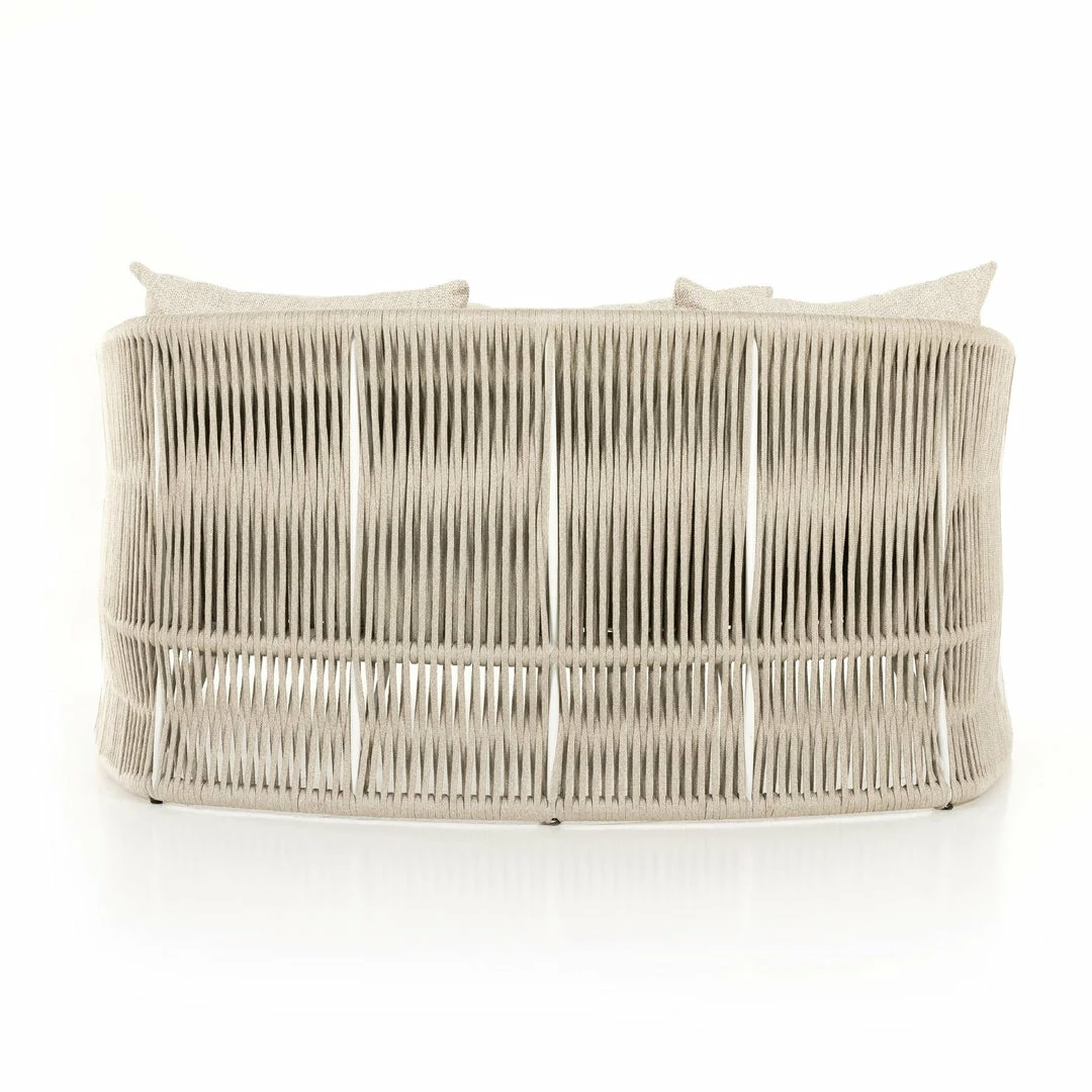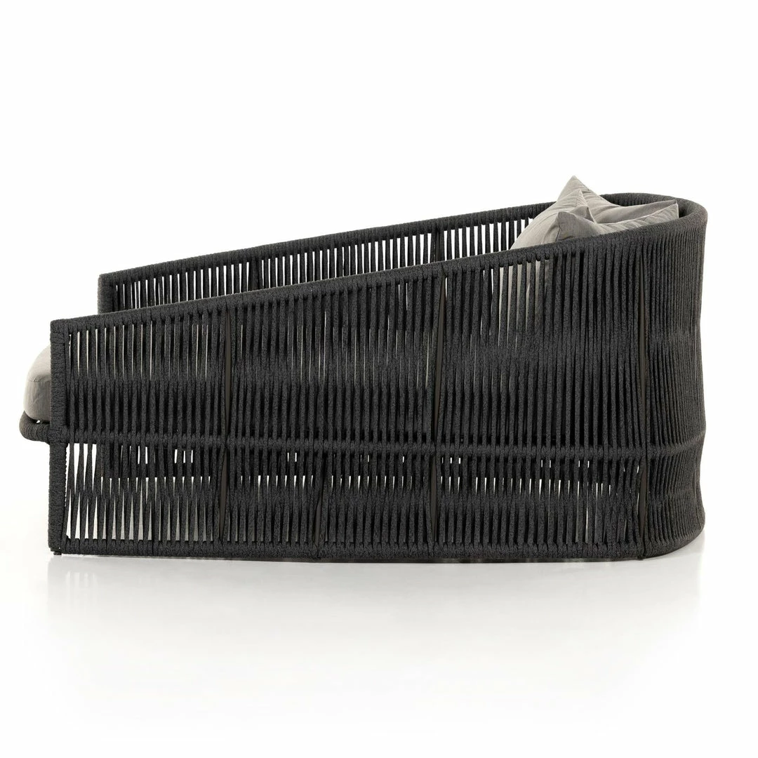 The perfect place for outdoor daydreaming. A beautiful rope-based design is woven across a durable aluminum frame in a rich bronze finish. Topped with a wide cushion and throw pillows, all upholstered in 100% Olefin, known for its UV-resistant, water-repellent and quick-drying abilities. Cover or store inside during inclement weather and when not in use.