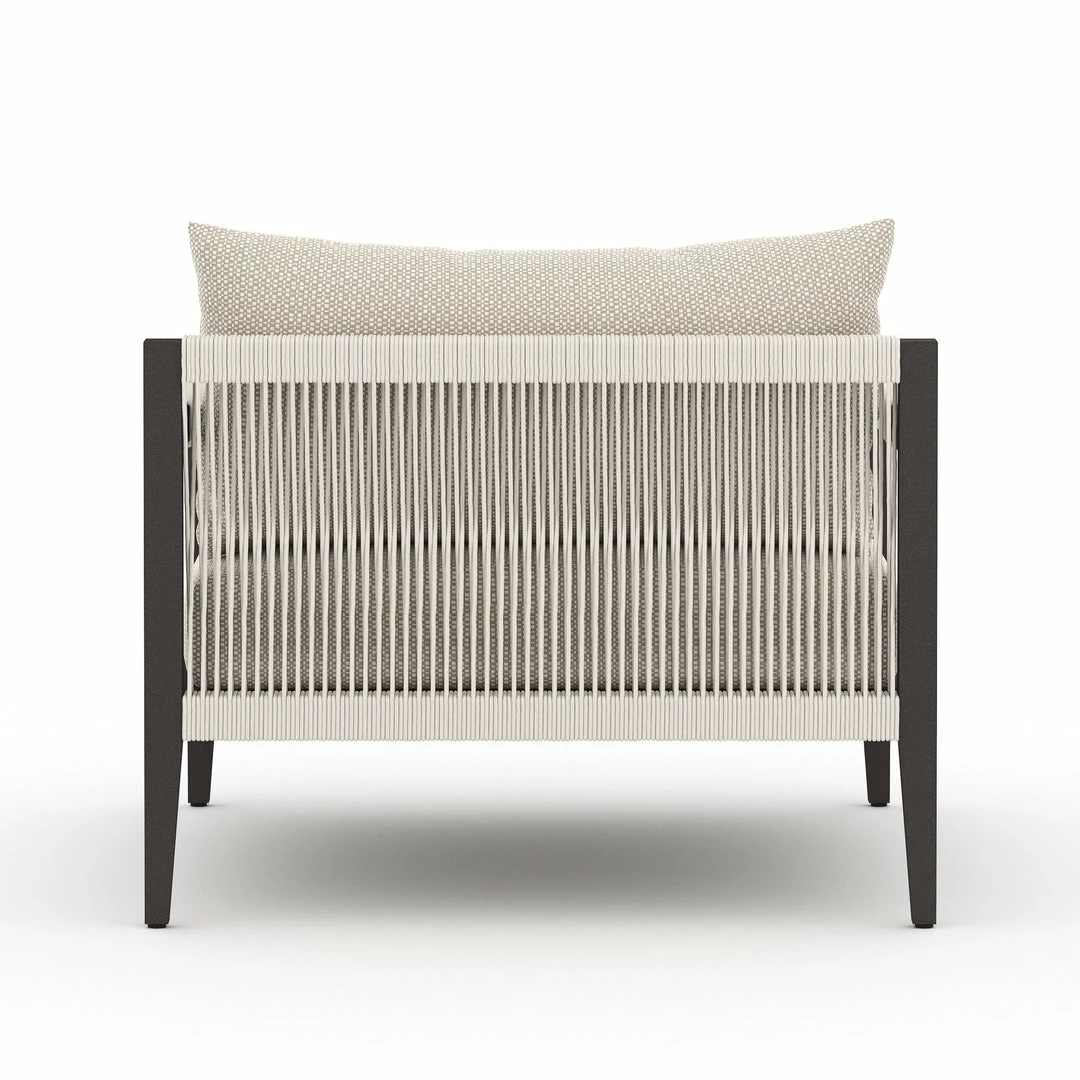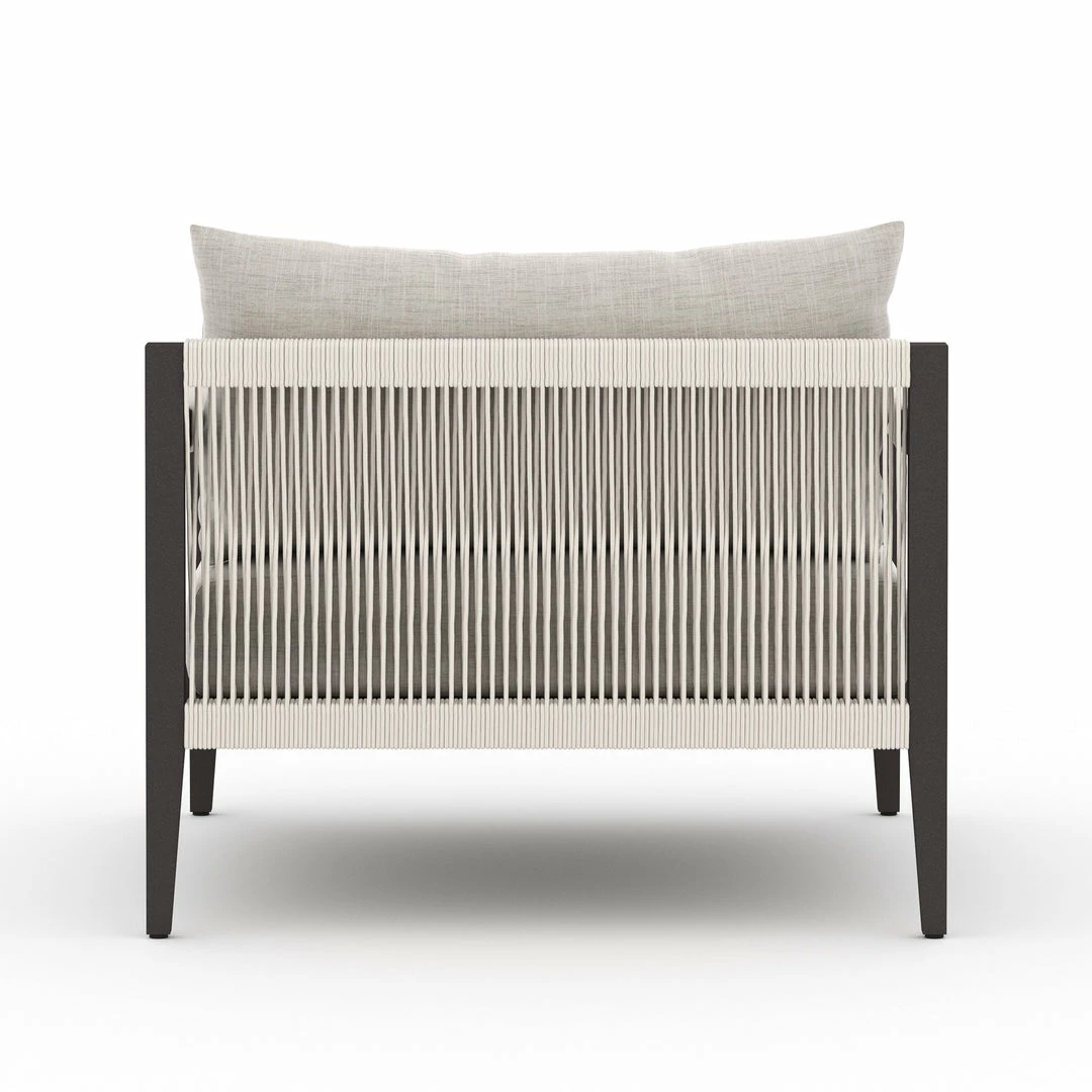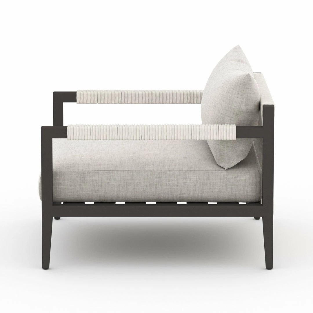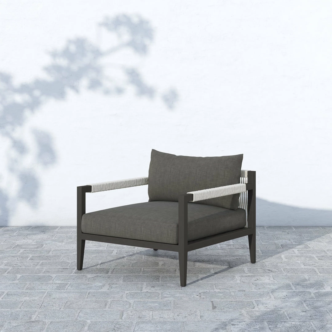 Modern materials ready a stylish silhouette for the outdoors. Sturdy aluminum forms a clean frame for UV-resistant, water-repellent Sunproof fabric on this outdoor chair. Rope-wrapped armrests and rear cotton weaving add a textured finishing touch. Cover or store indoors during inclement weather.